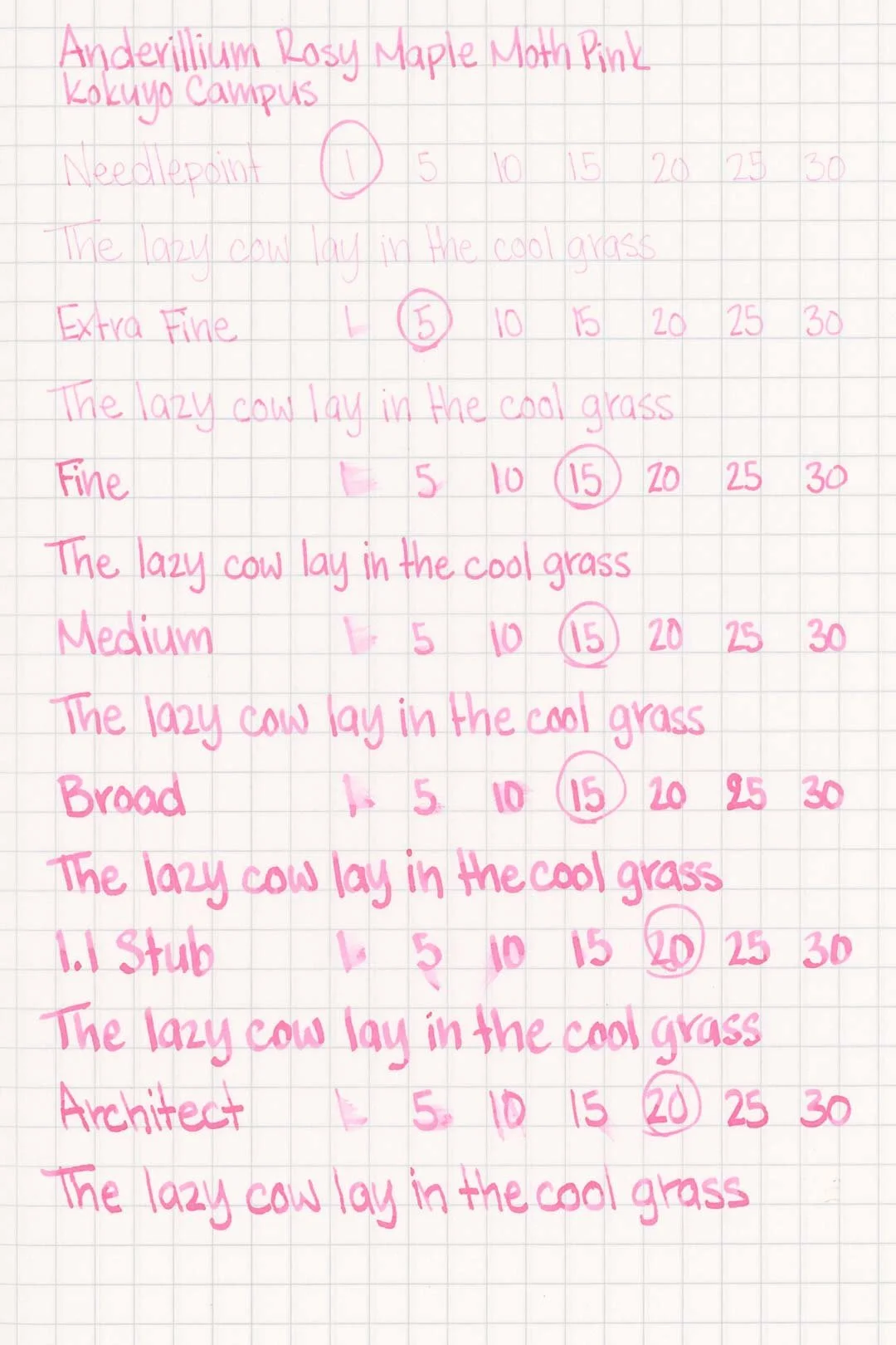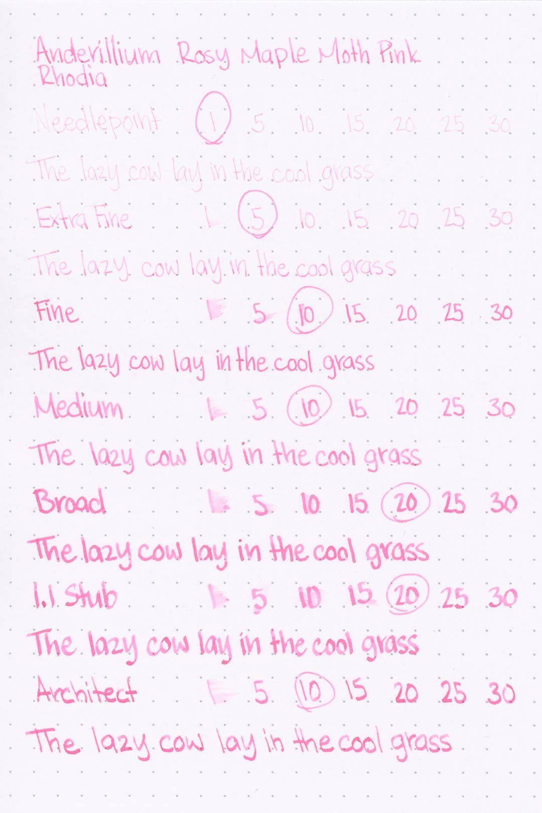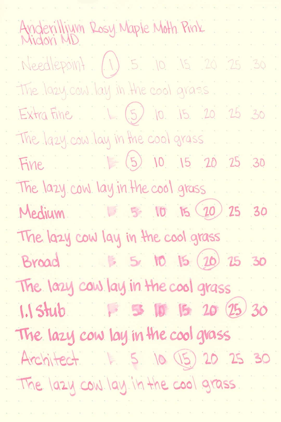 Rosy Maple Moth Pink had a medium-wet flow that was consistent across all of the test nibs and provided a consistently silky glide. I didn’t experience any hard starts, skips, stops, or dryness during my tests. Overall, this is a very well-behaved ink.