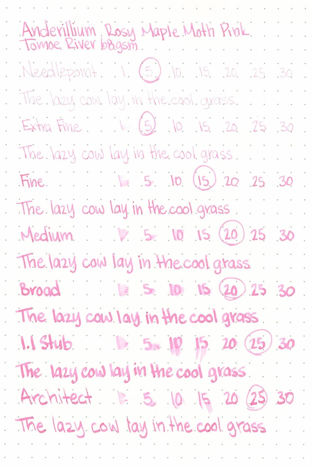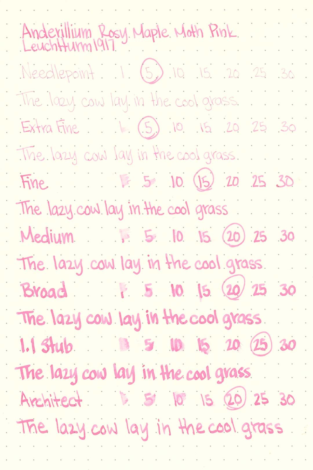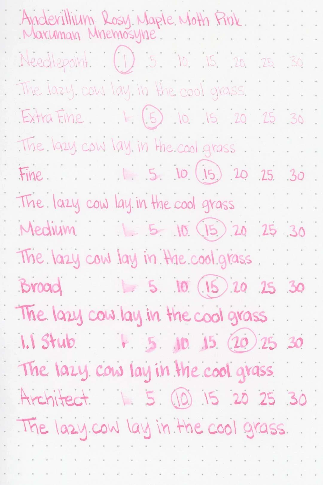 Rosy Maple Moth Pink had a medium-wet flow that was consistent across all of the test nibs and provided a consistently silky glide. I didn’t experience any hard starts, skips, stops, or dryness during my tests. Overall, this is a very well-behaved ink.