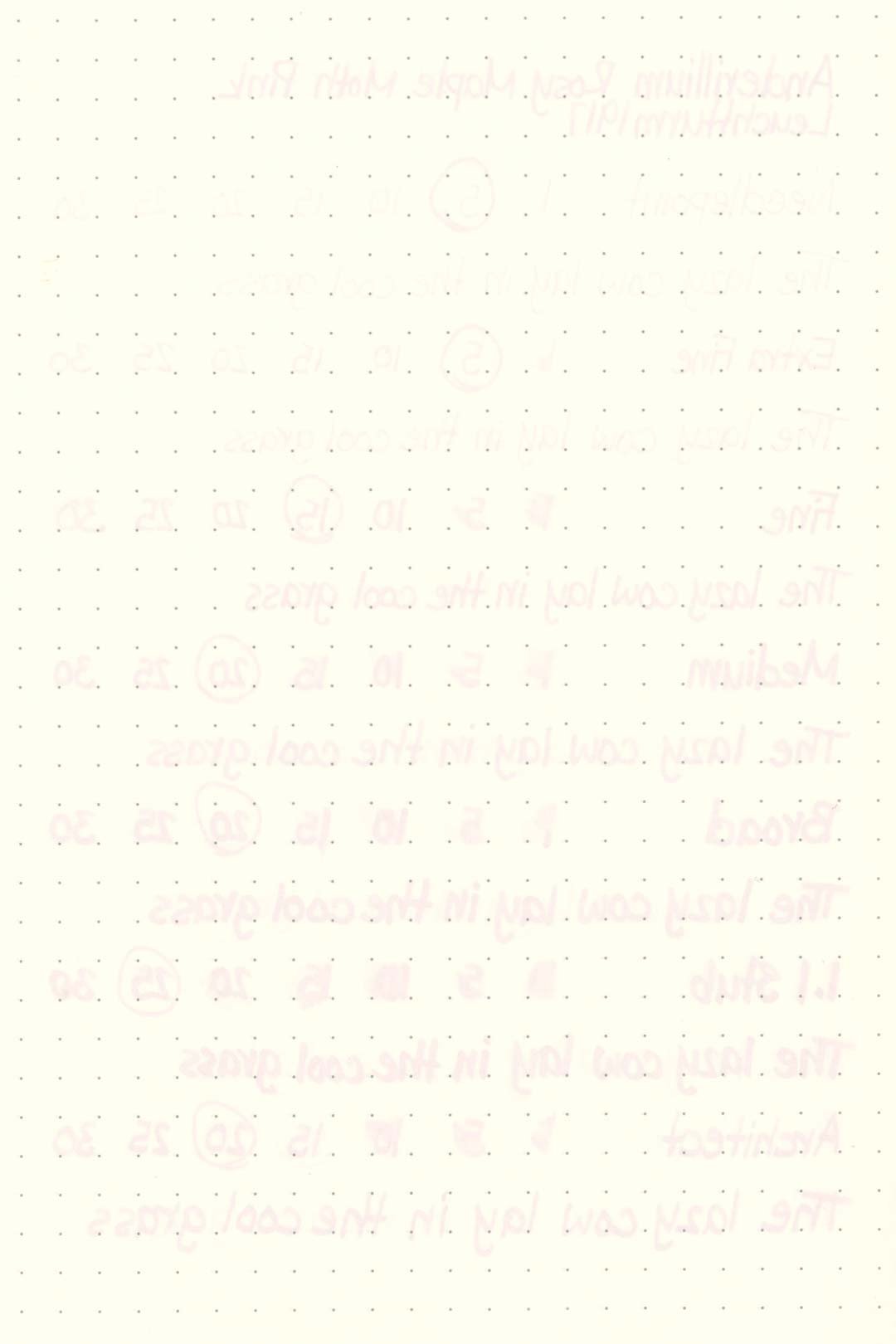 Rosy Moth Pink had great performance across all the test papers. There was some minimal bleed on the Kokuyo Campus paper with the larger nibs, but otherwise, the ink was well-behaved, and I didn’t experience bleed-through or feathering on the other papers. You shouldn’t have any issues writing on most fountain pen-friendly papers.