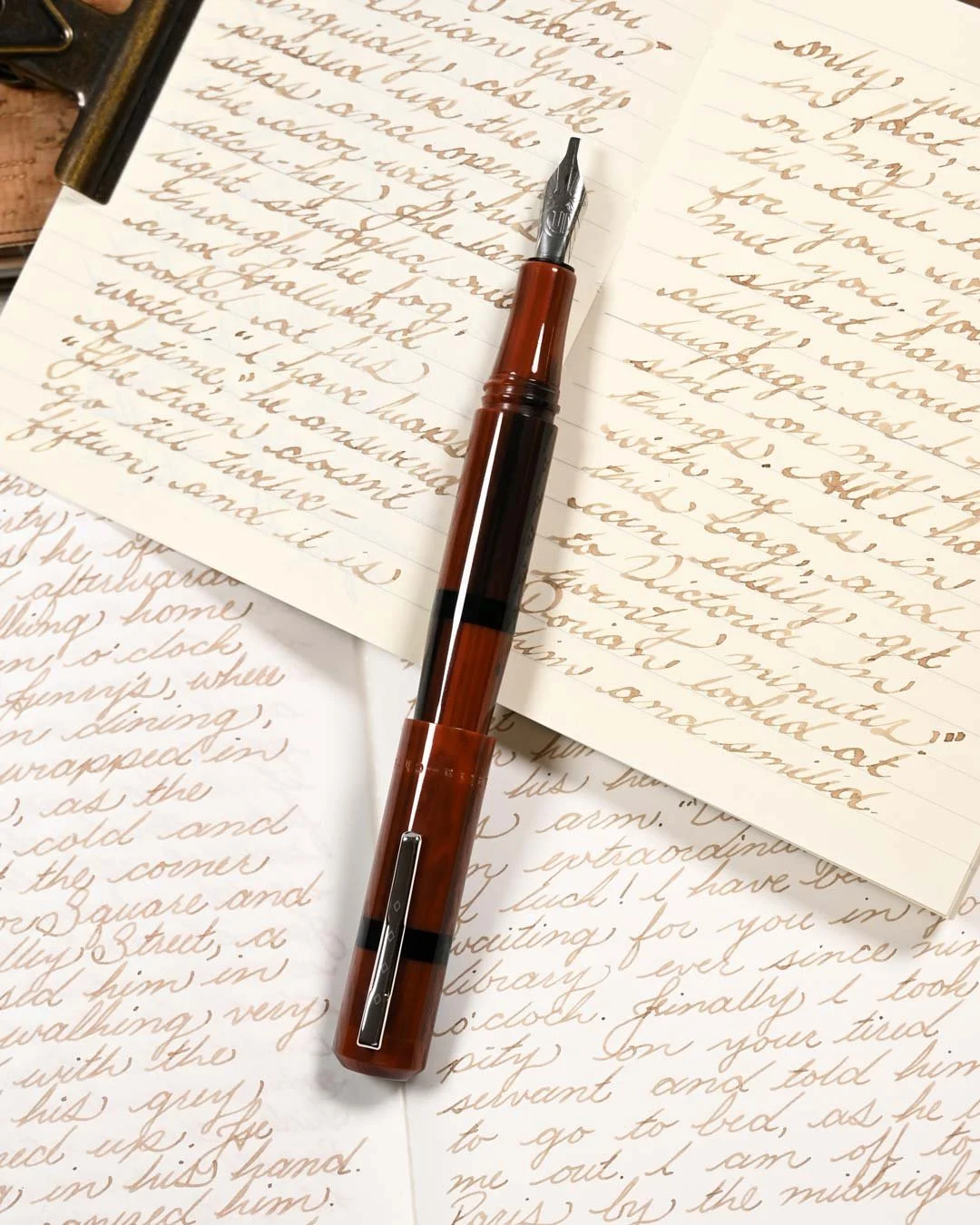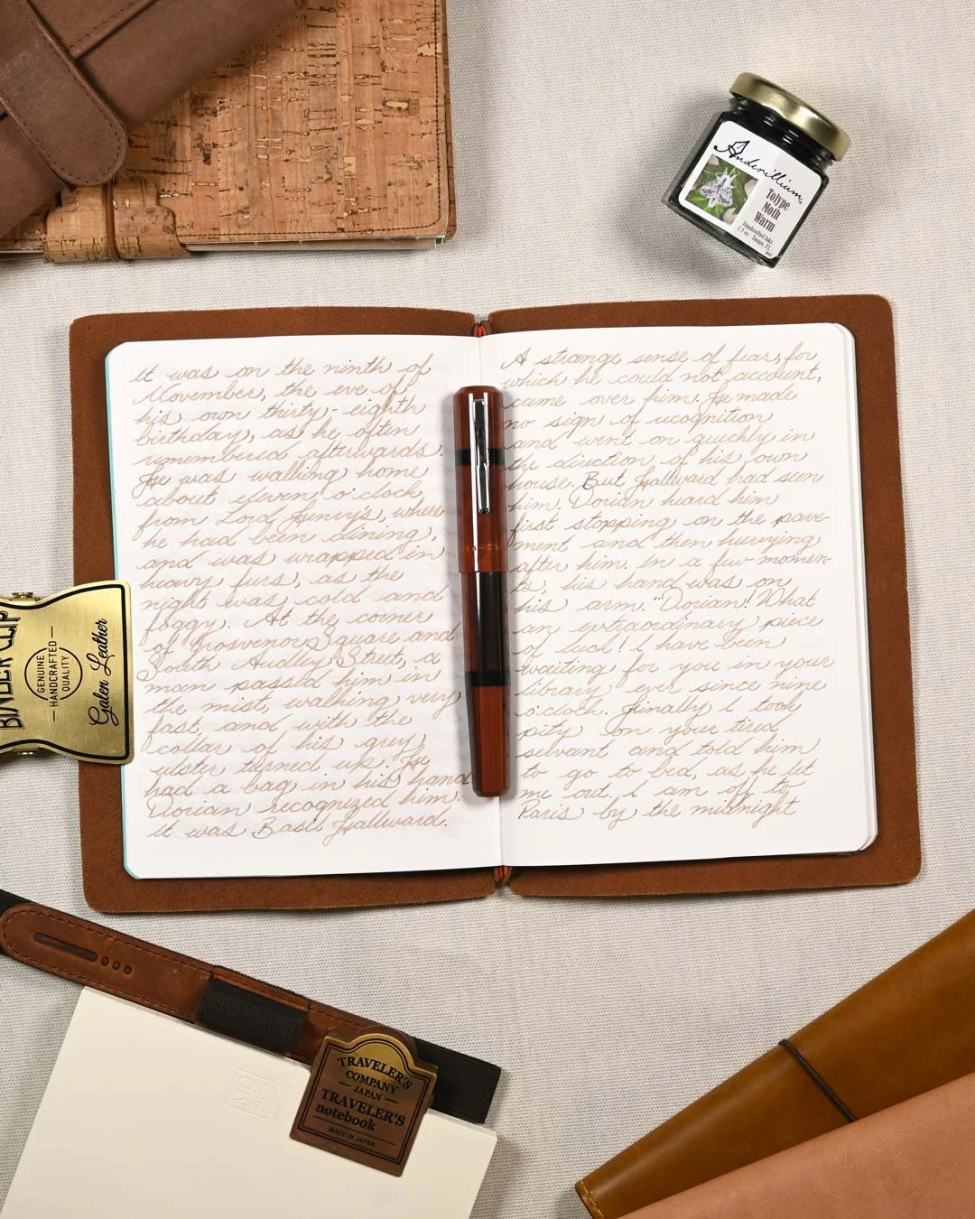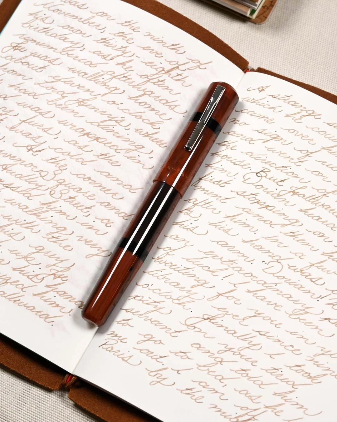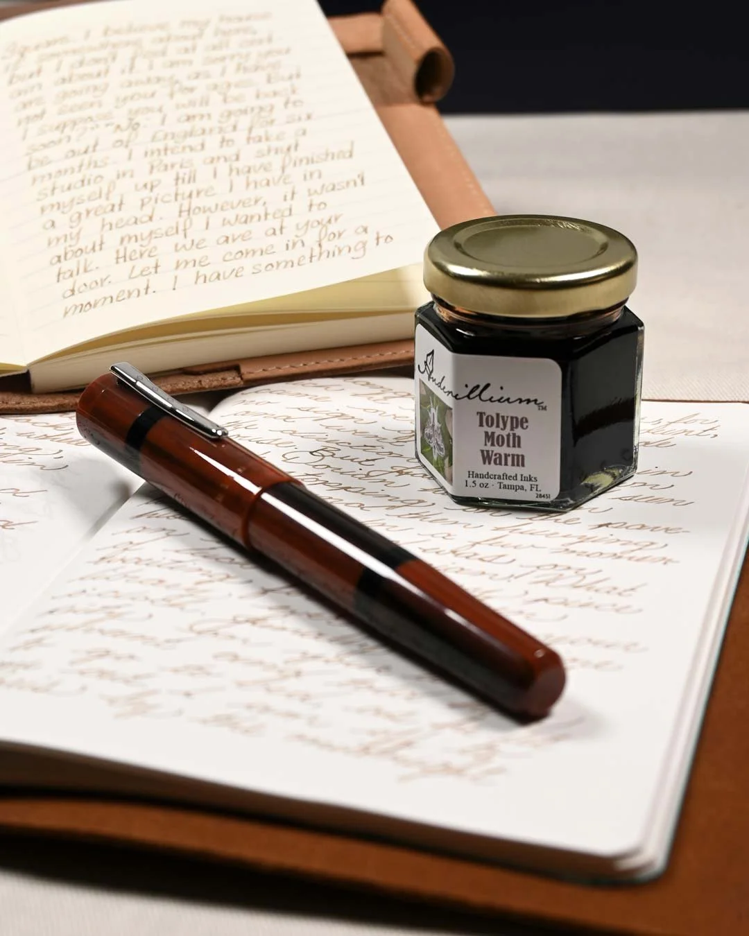 I love how Anderillium captures the color and patterns of a moth's wings with the shading here. The whole thing is beautifully nuanced; the slight purple undertones, the slight green edges, I loved how this looked coming out of the big 1.9 music nib when doing my writing samples, but it’s also nice and subtle in finer nibs. I love the pastel look too (and that’s not something I see often in browns). Tolype Moth Warm was the first ink to catch my eye at the Anderillium table at the DC Pen show, and I’ve been making frequent use of it ever since — I love it for the fall season! If you’re looking for a brown ink that genuinely stands out for its distinctive character, this one comes highly recommended by me.