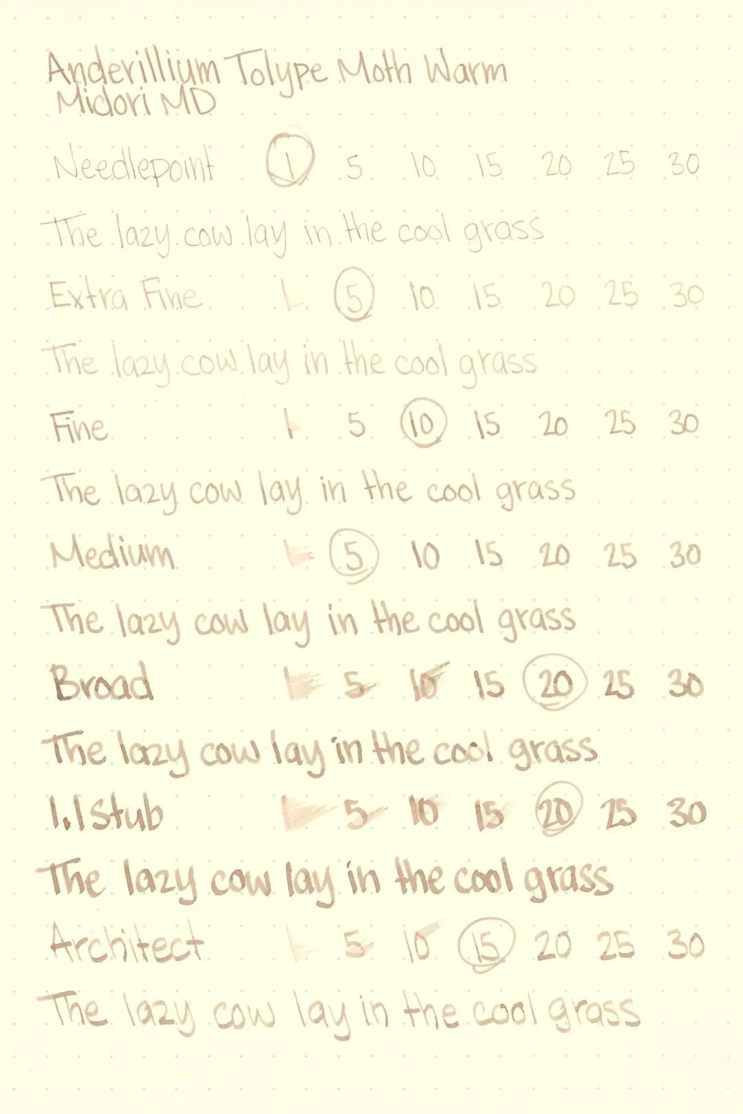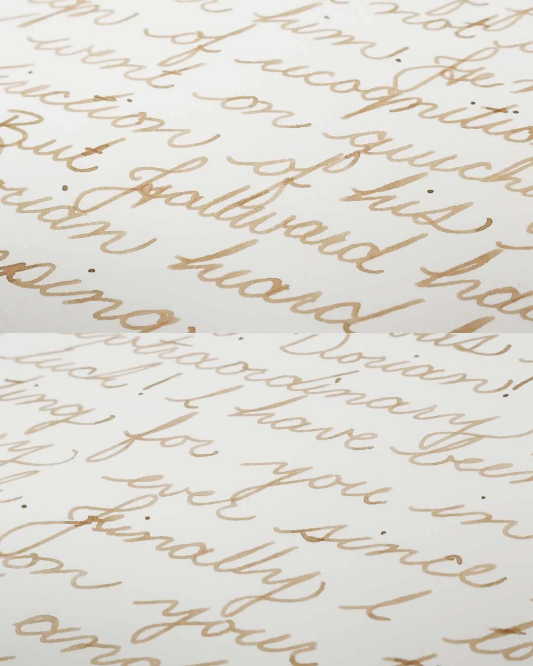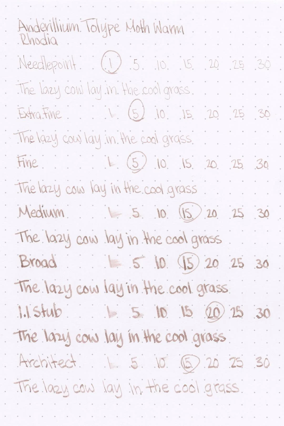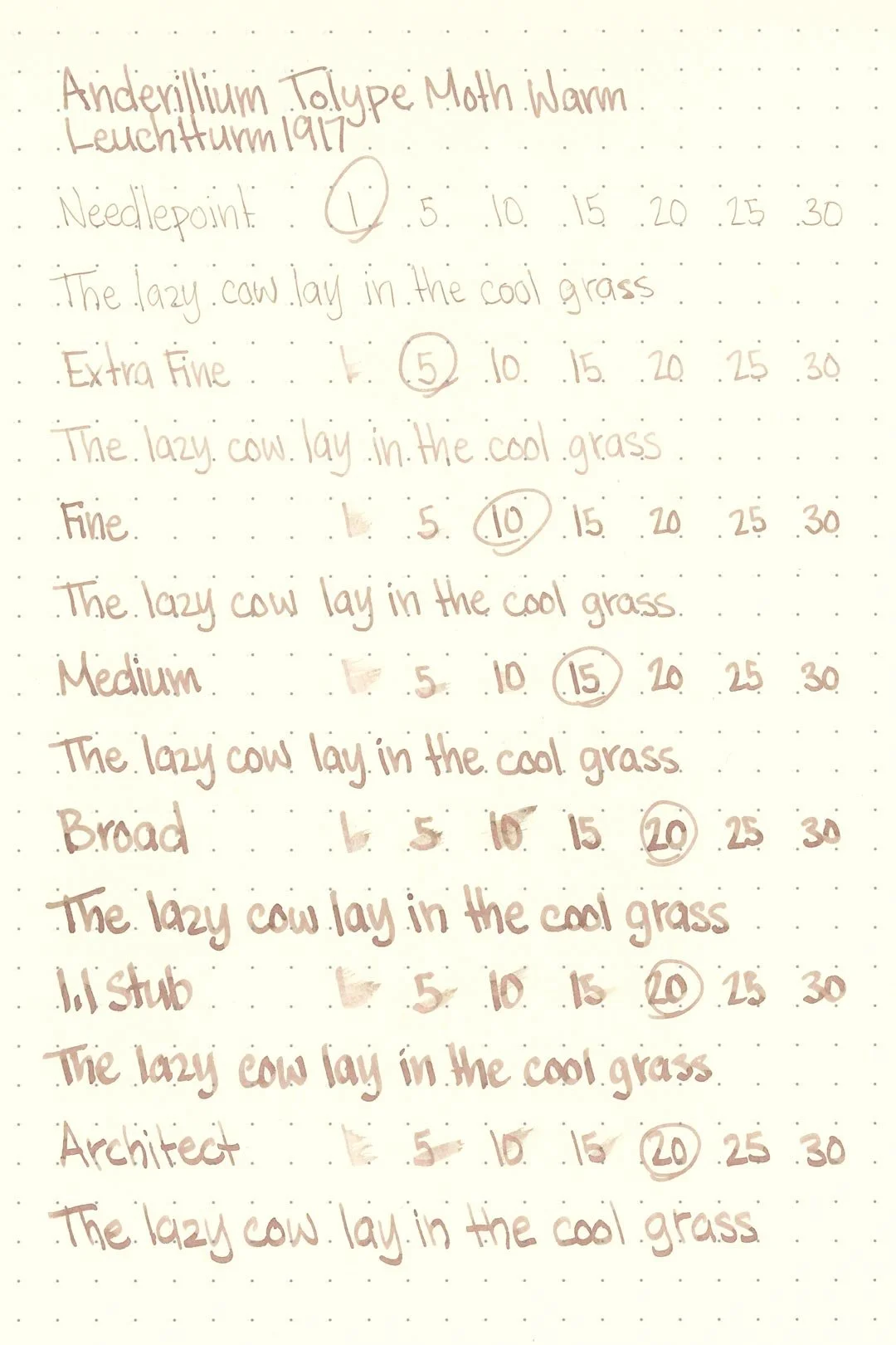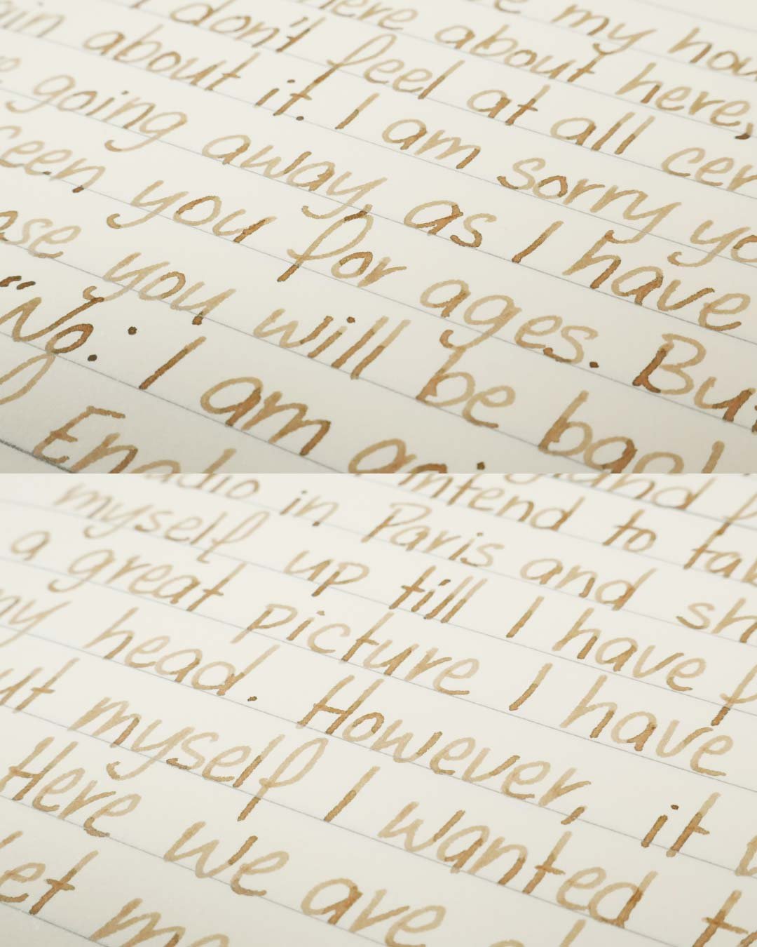 Tolype Moth Warm has a medium flow that was consistent throughout all the test nibs. The ink feels nicely lubricated, offering a somewhat silky writing experience, while still retaining enough tactility to ensure good control while writing. It’s not overly slick, but it’s nice. There were no hard starts, skips, or stops during my tests.
