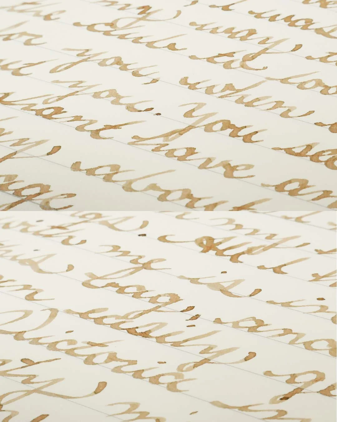 Tolype Moth Warm performed well. I didn’t encounter any bleeding or feathering on most of the test papers, with just a single spot of bleed-through on the Kokuyo paper. There’s some slight feathering on the Midori MD I used with the 1.9 music nib for my writing samples, but all the normal tests were fine. With that said, there’s some visible feathering on the edges of the ink droplets and splats, indicating that this can certainly push a paper to its limits with wider and wetter nibs (such as the 1.9 stub). It should, however, be fine with most fountain pen-friendly papers and most nibs.