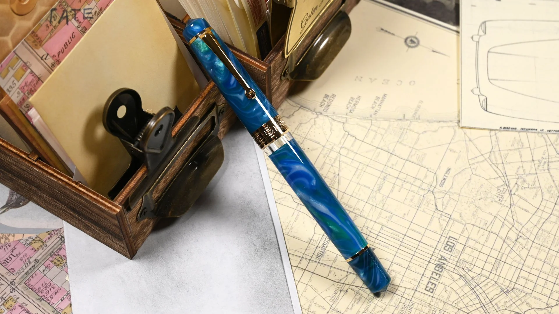 Focusing on the Ocean Blue colorway, the material is beautiful at a glance, with a striking blue-and-green swirl and a hint of milky, almost silvery white. I don’t generally like white mixed into the swirls on my fountain pen materials, but it has a slight translucence and brilliance to it that I think works quite well with the overall colorway. The whole thing is also very chatoyant — much more than I thought it would be based on the product images. It looks great when rotating it around in the light. For the most part, I’m very happy with the material.
