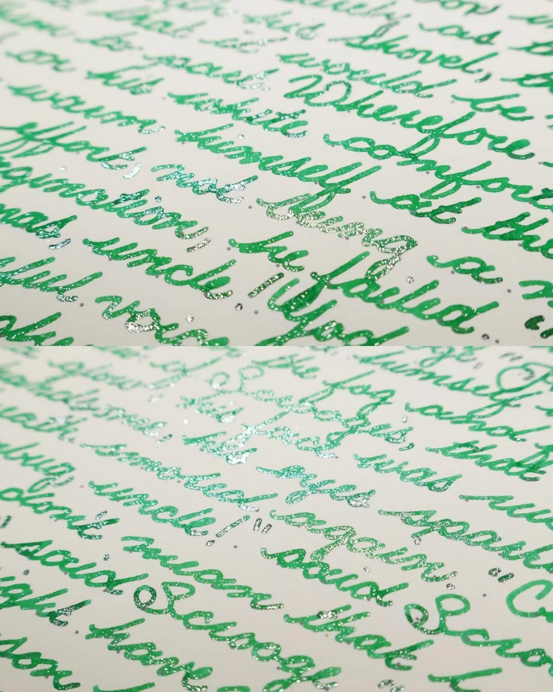 Oh wow! Here it is already! I wasn’t expecting to get a Star-Bright so soon (if at all), but I opened this door and immediately shouted “Yessss!” when I read the Star-Bright label. I’ve been curious to see more colors with this kind of shimmer since trying last year’s Glacier, and a green like this seemed perfect. My excitement was swiftly countered by our grumpy Oregonian, Sarah, who was bold enough to claim that this color is far too bright to have anything to do with a Noble Fir tree, and… She’s not wrong. It’s too bright. However, I don’t think that diminishes this ink, it’s still lovely, and I still think it makes for an excellent Inkvent ink, and an awesome second Star-Bright ink.
