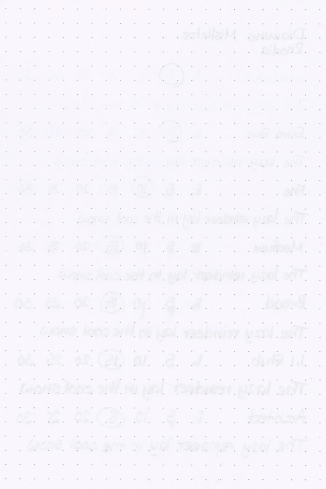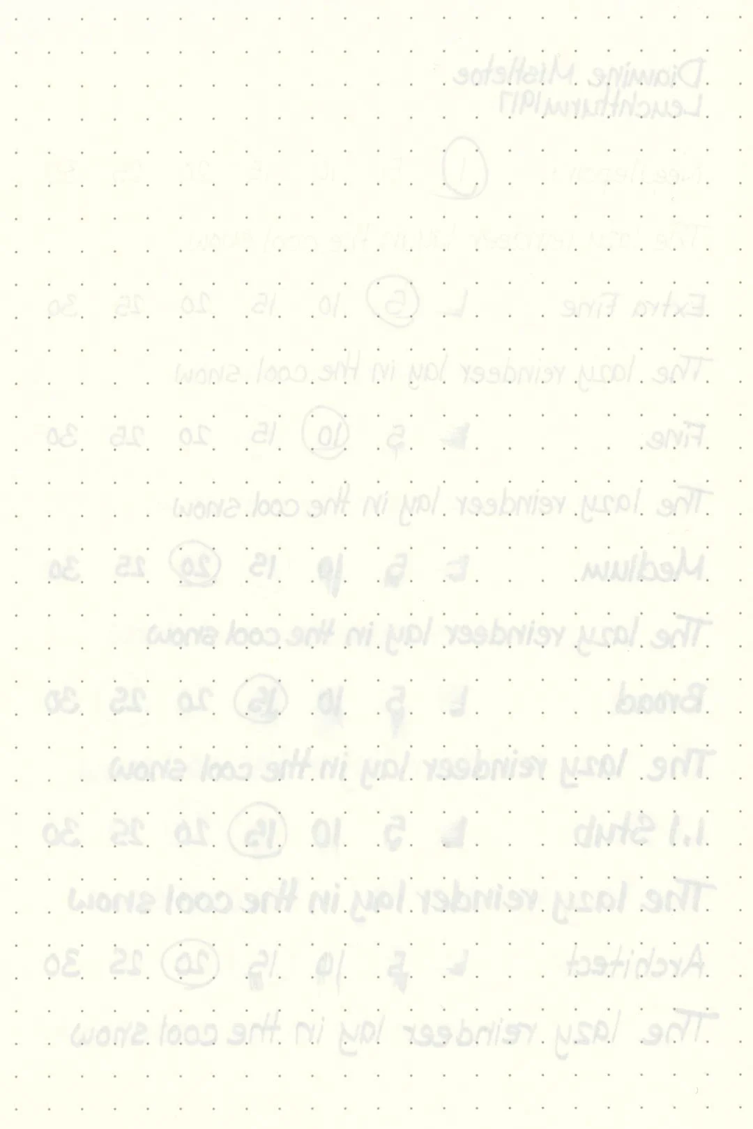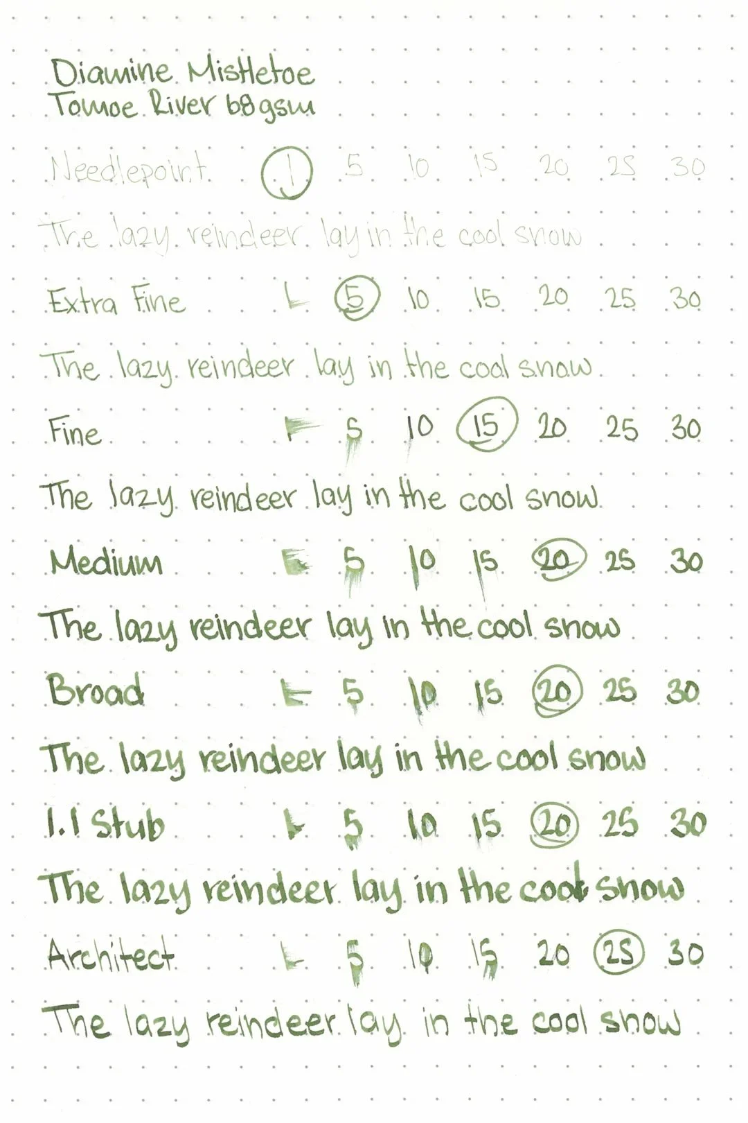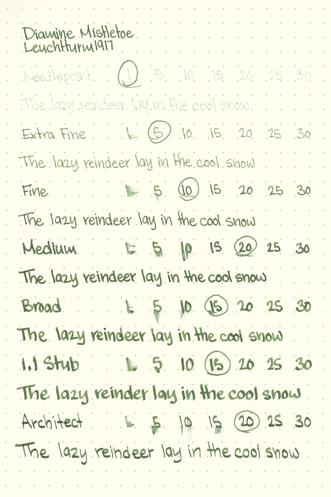 Mistletoe has a dry-medium flow. It starts off feeling nicely lubricated and comfortable to write with; however, there’s a quick drop off in flow during extended writing. After a few lines (about a quarter of an A5 page in my experience), you’ll notice the flow slowed down considerably. It’s still usable, but the experience is jarring, especially because it starts off so well. I didn’t have many hard starts, skipping, or stops during my tests with most of the nibs (extra fine through medium); however, the needlepoint in particular had difficulties with consistent skipping. The broad and stub nibs also had periodic hard starts as well. Still, the ink is far from unpleasant, and I found the experience with the fine and medium nibs especially to be quite enjoyable.