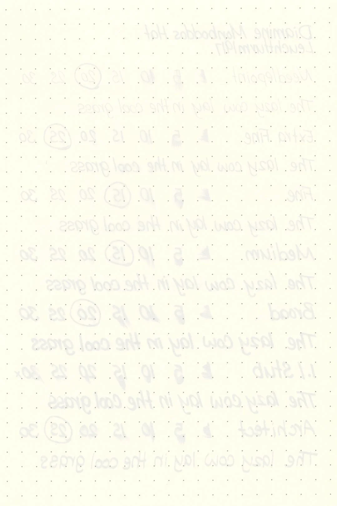 Monboddos Hat is well-behaved. There was a single spot of bleed-through on the Tomoe River paper when using the 1.1 stub nib, but there weren’t any visible traces of bleeding or feathering on any of the other test papers. There weren’t any signs of feathering around the ink droplets either. This ink should be fine with most fountain pen-friendly papers.
