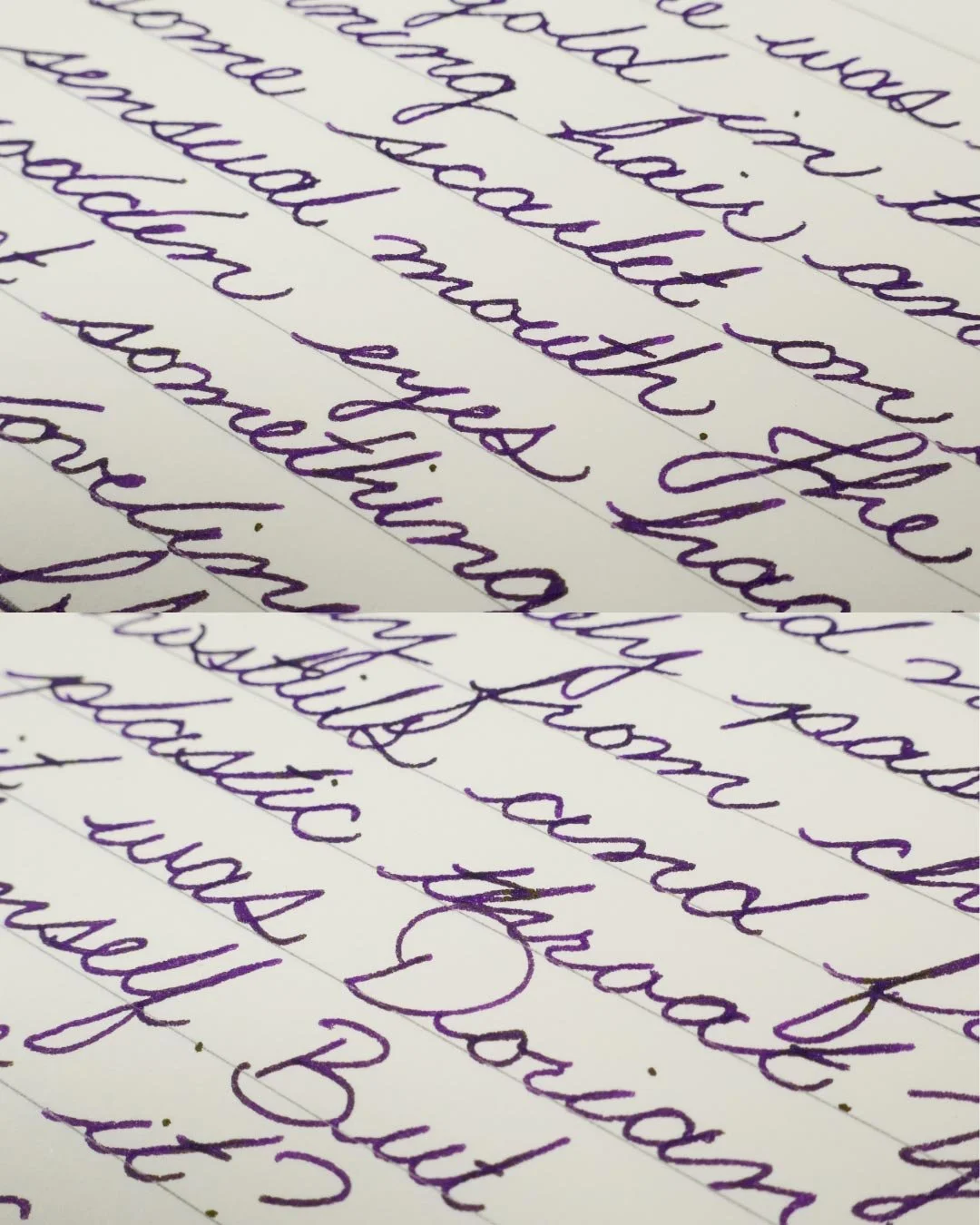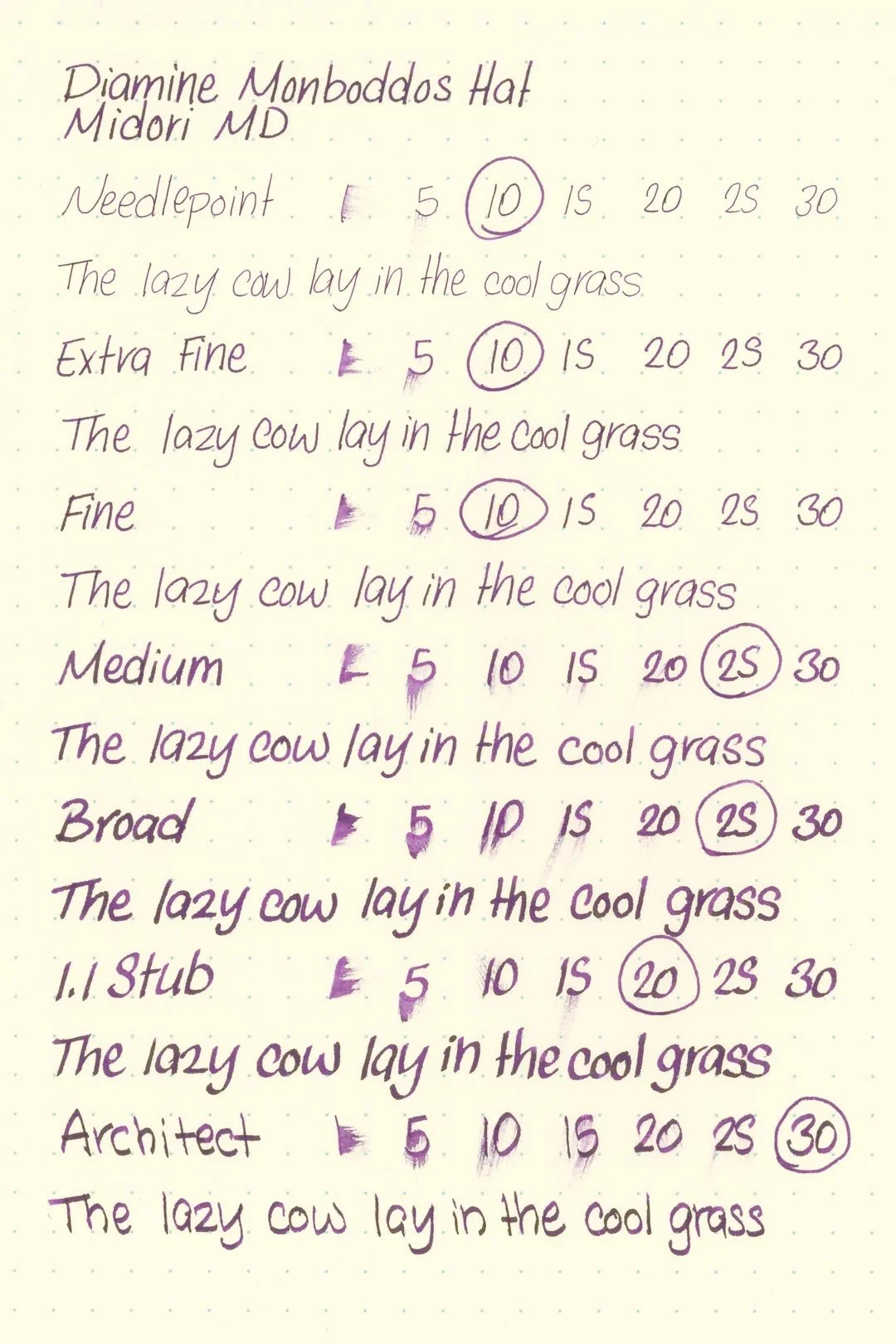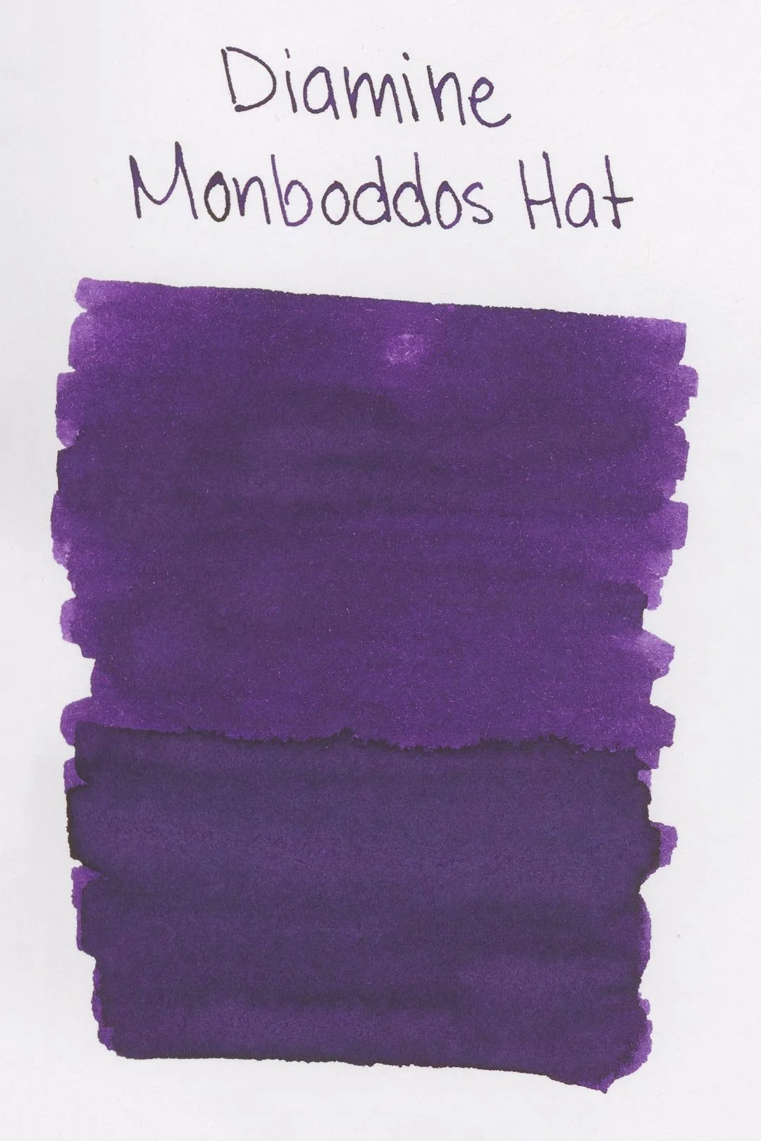 Diamine Monboddos Hat is a dark purple that shades with a soft gradient when writing in cursive and a soft cut when writing in print. There’s not a lot of tonal variation in the shading, especially when writing in cursive. Instead, there’s a dull yellow-green sheen that’s easily noticeable at the ends of letters, especially when writing in print.