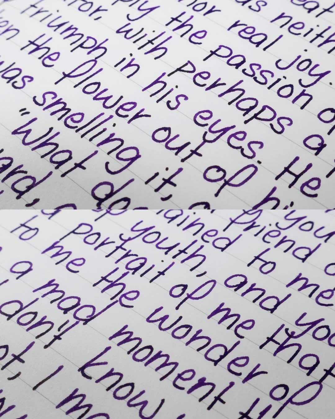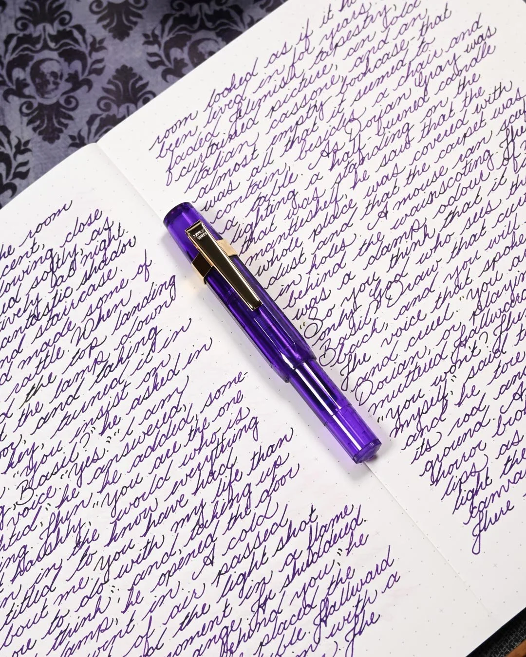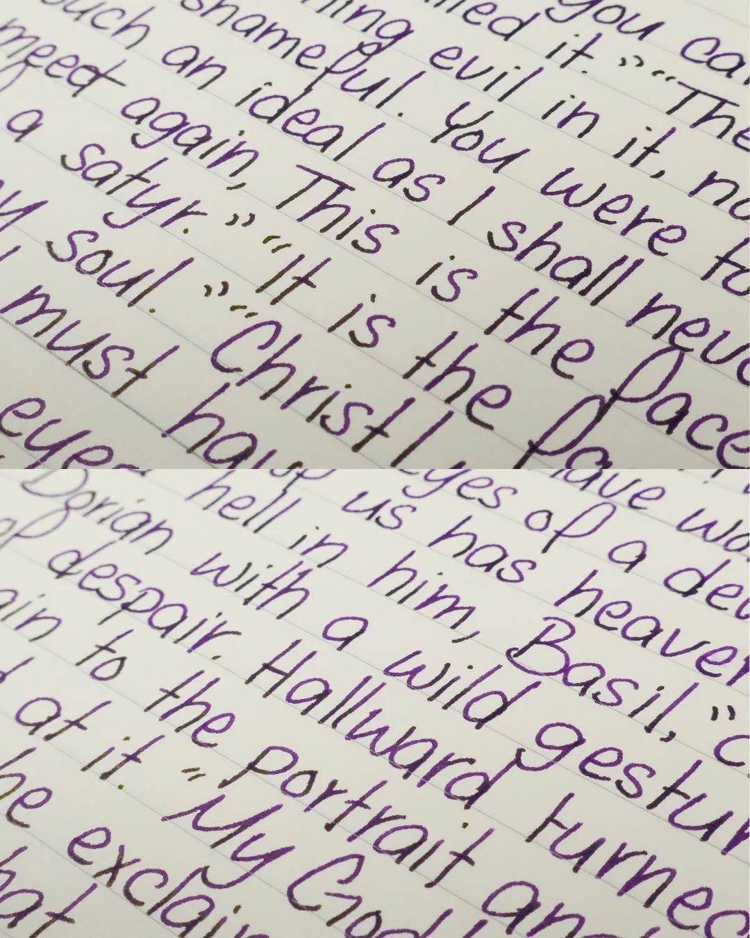 Diamine Monboddos Hat is a dark purple that shades with a soft gradient when writing in cursive and a soft cut when writing in print. There’s not a lot of tonal variation in the shading, especially when writing in cursive. Instead, there’s a dull yellow-green sheen that’s easily noticeable at the ends of letters, especially when writing in print.