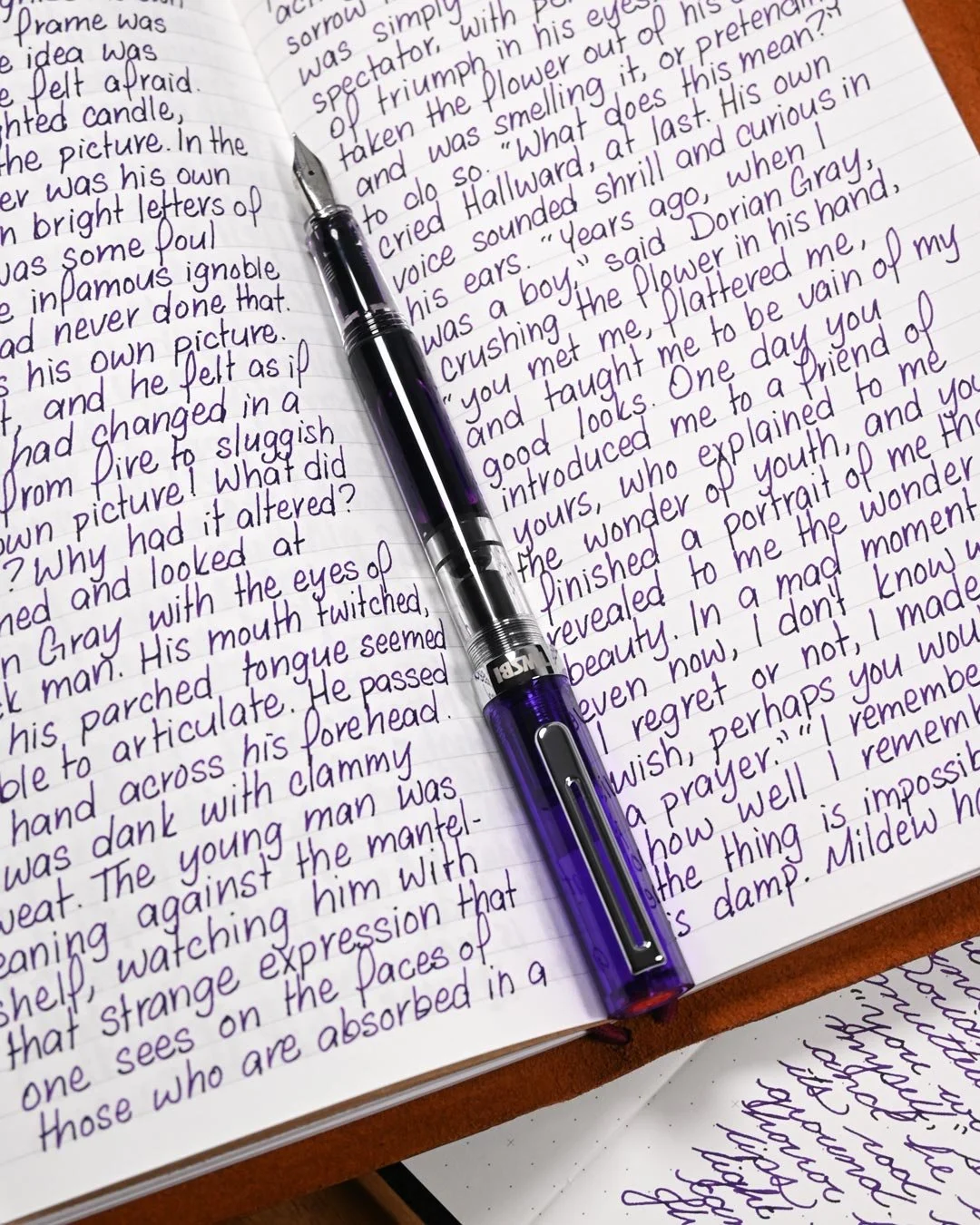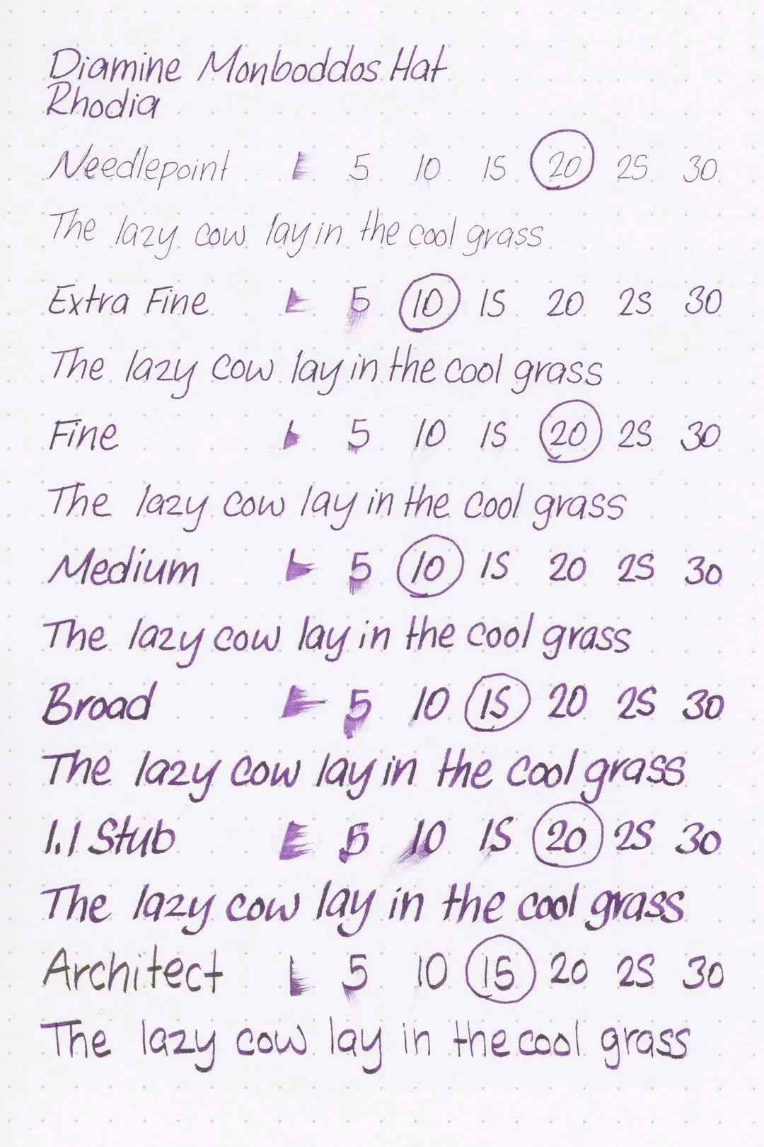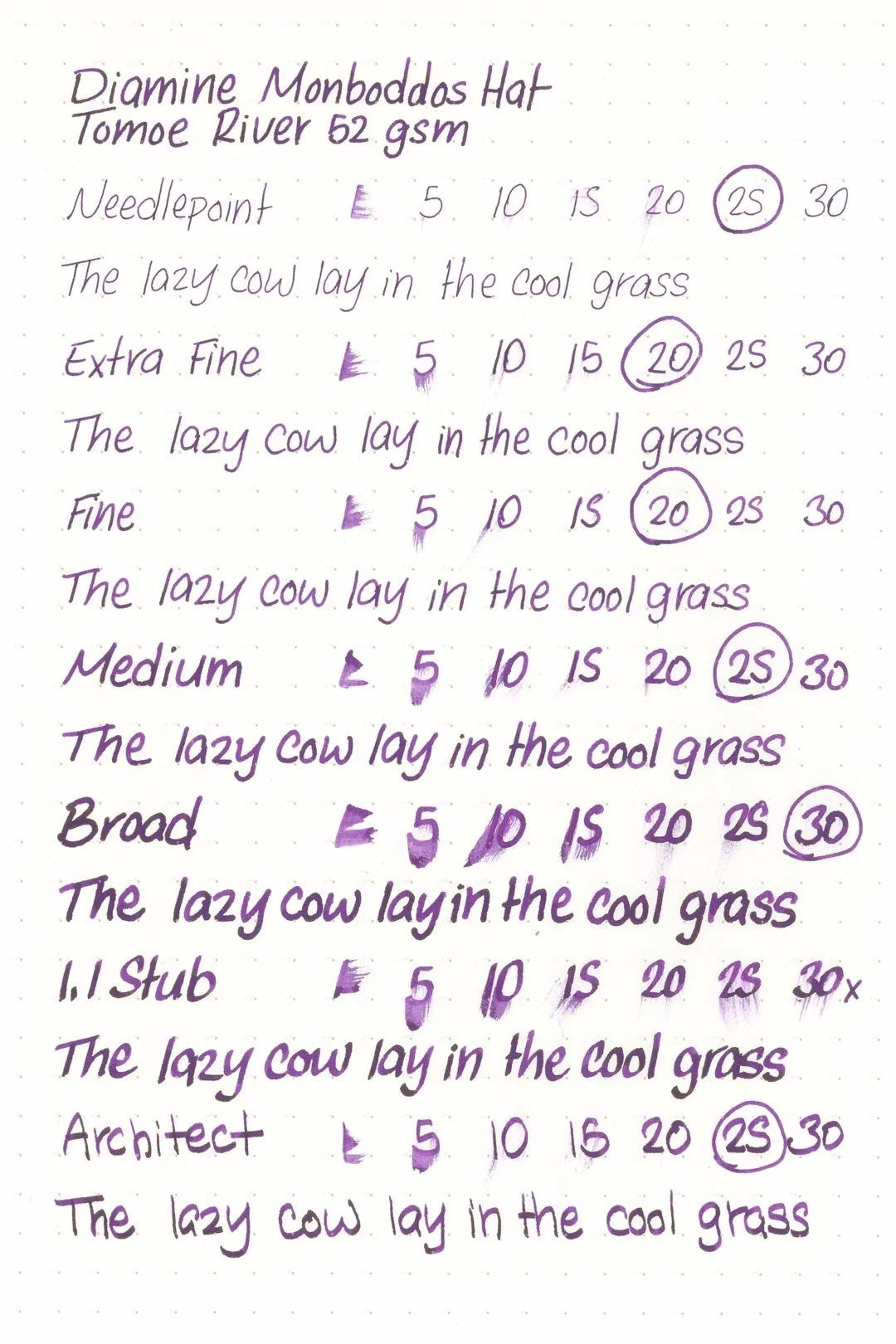 Monboddos Hat has a medium-wet flow and average lubrication. It’s not as slick as I would have expected based on the flow, but it’s still very usable and comfortable to write with. I experienced a few dry starts when writing in print with the broad nib and 1.1 stub, but otherwise, the other nibs performed well without any issues. The ink also kept up well during extended writing, with no noticeable drops in flow.
