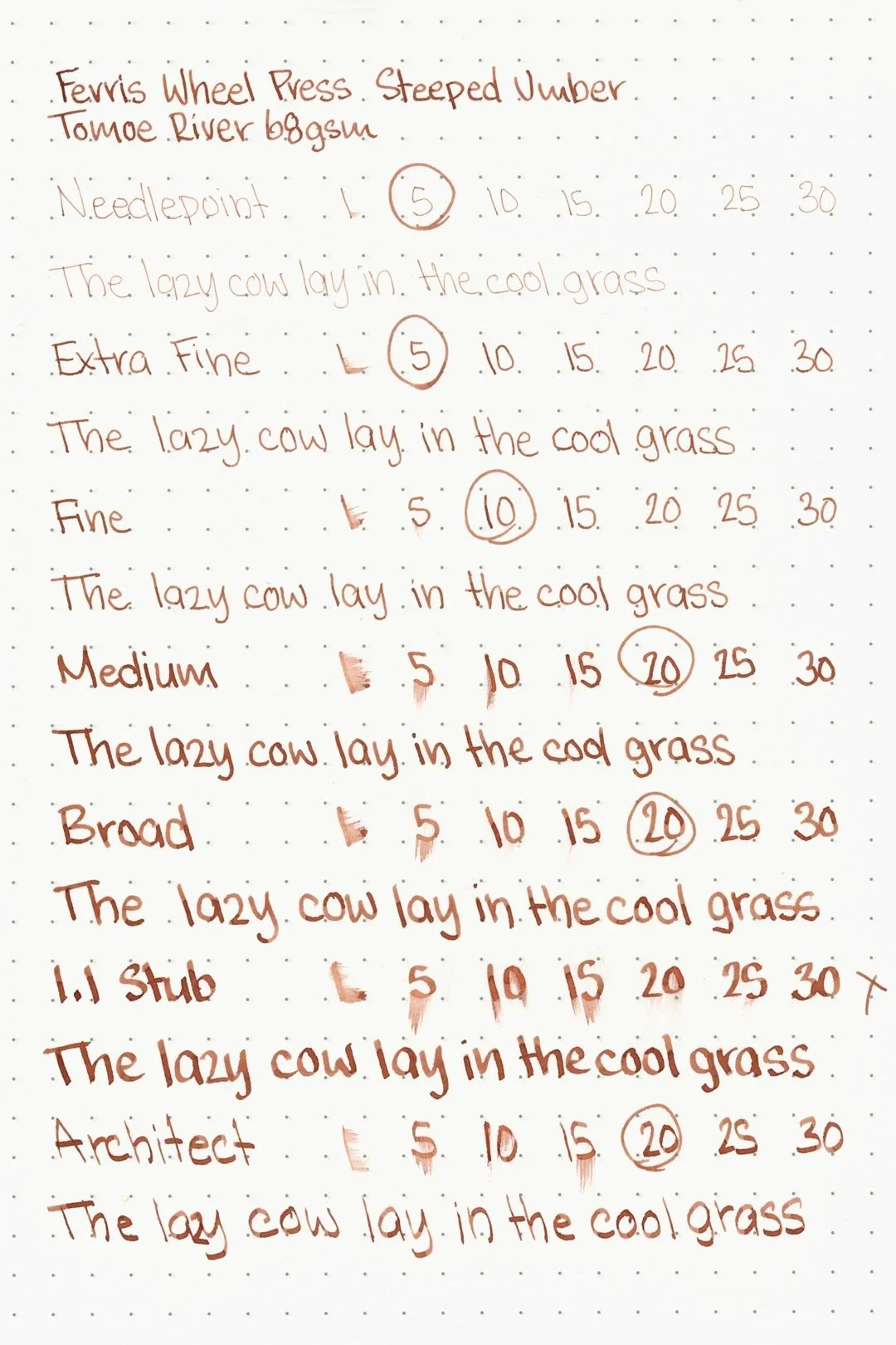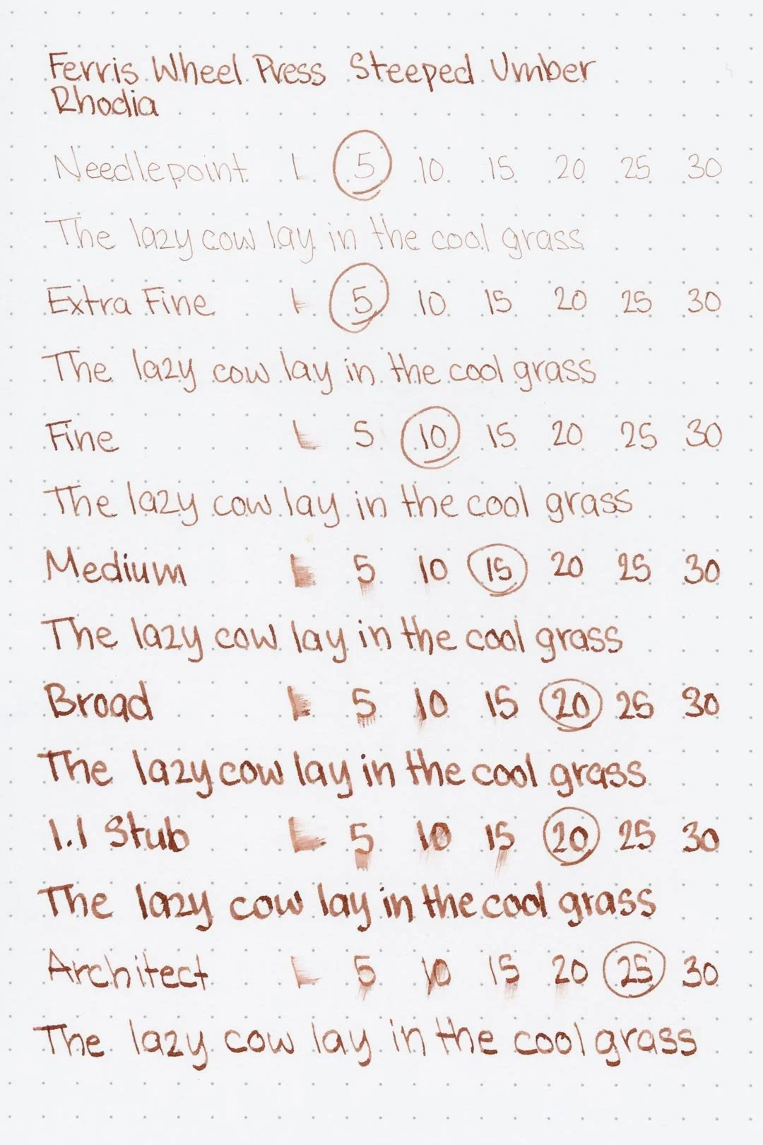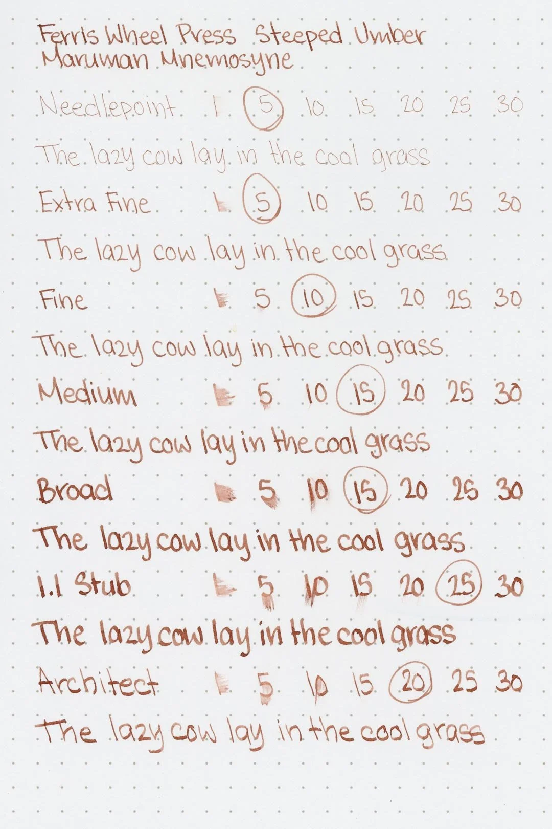 With the finer nibs, Steeped Umber was a mostly solid color. You might notice small traces of shading, but it was overall unnoticeable on all of the test pages. As the nib size goes up, you’ll begin noticing a soft, almost milky gradient between varied shades of brown. I find that the darker tones often overpower the lighter elements of the shading in this ink, which contributes to its milky appearance. Wetter nibs will facilitate that further, and you may start to notice some black edging around the letters. Drier nibs will make the color come through lighter, but personally, I find that this ink doesn’t have adequate lubrication to use comfortably in drier-tuned nibs.