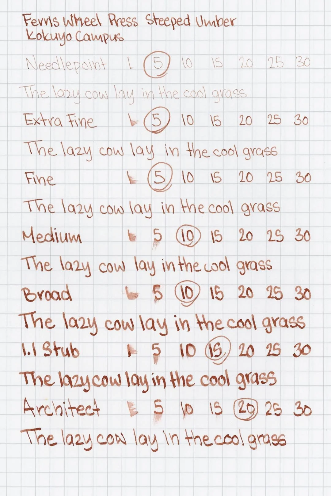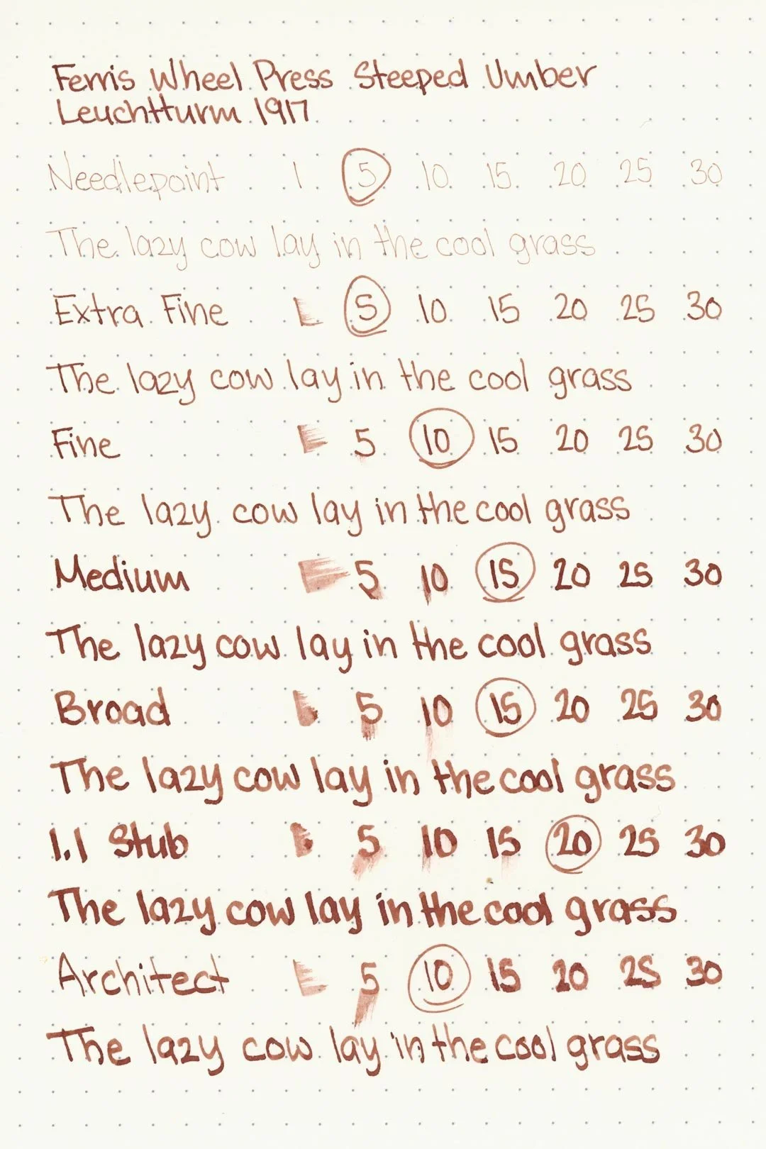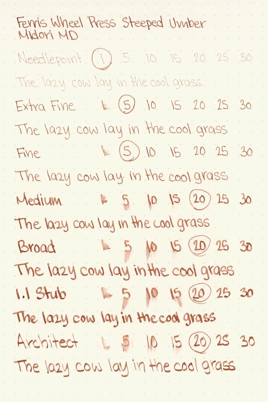 With the finer nibs, Steeped Umber was a mostly solid color. You might notice small traces of shading, but it was overall unnoticeable on all of the test pages. As the nib size goes up, you’ll begin noticing a soft, almost milky gradient between varied shades of brown. I find that the darker tones often overpower the lighter elements of the shading in this ink, which contributes to its milky appearance. Wetter nibs will facilitate that further, and you may start to notice some black edging around the letters. Drier nibs will make the color come through lighter, but personally, I find that this ink doesn’t have adequate lubrication to use comfortably in drier-tuned nibs.