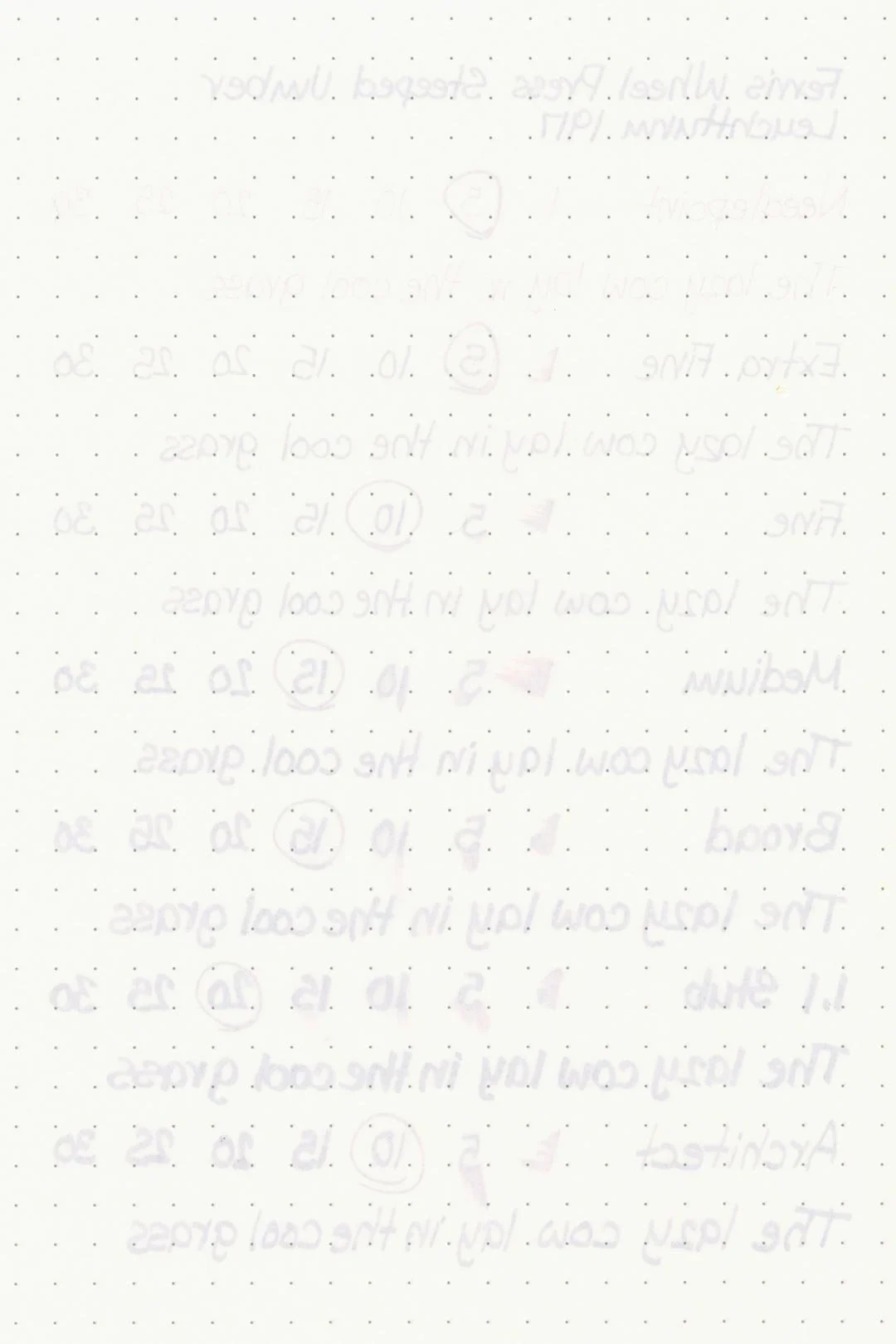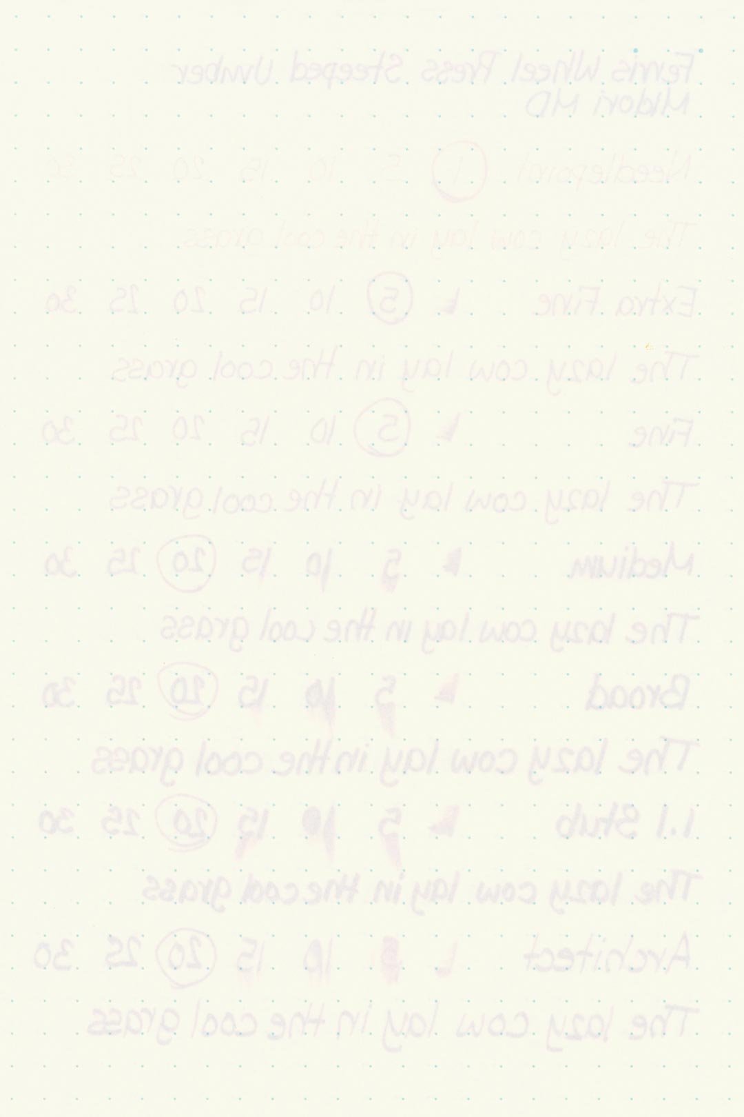 The dry times were average. The finer nibs seemed to dry faster than normal, and I found that the dry times were noticeably better on the Maruman and Kokuyo papers. There was one case on Tomoe River paper where the dry time extended past the 30-second mark, but the overall dry times were still more than adequate.