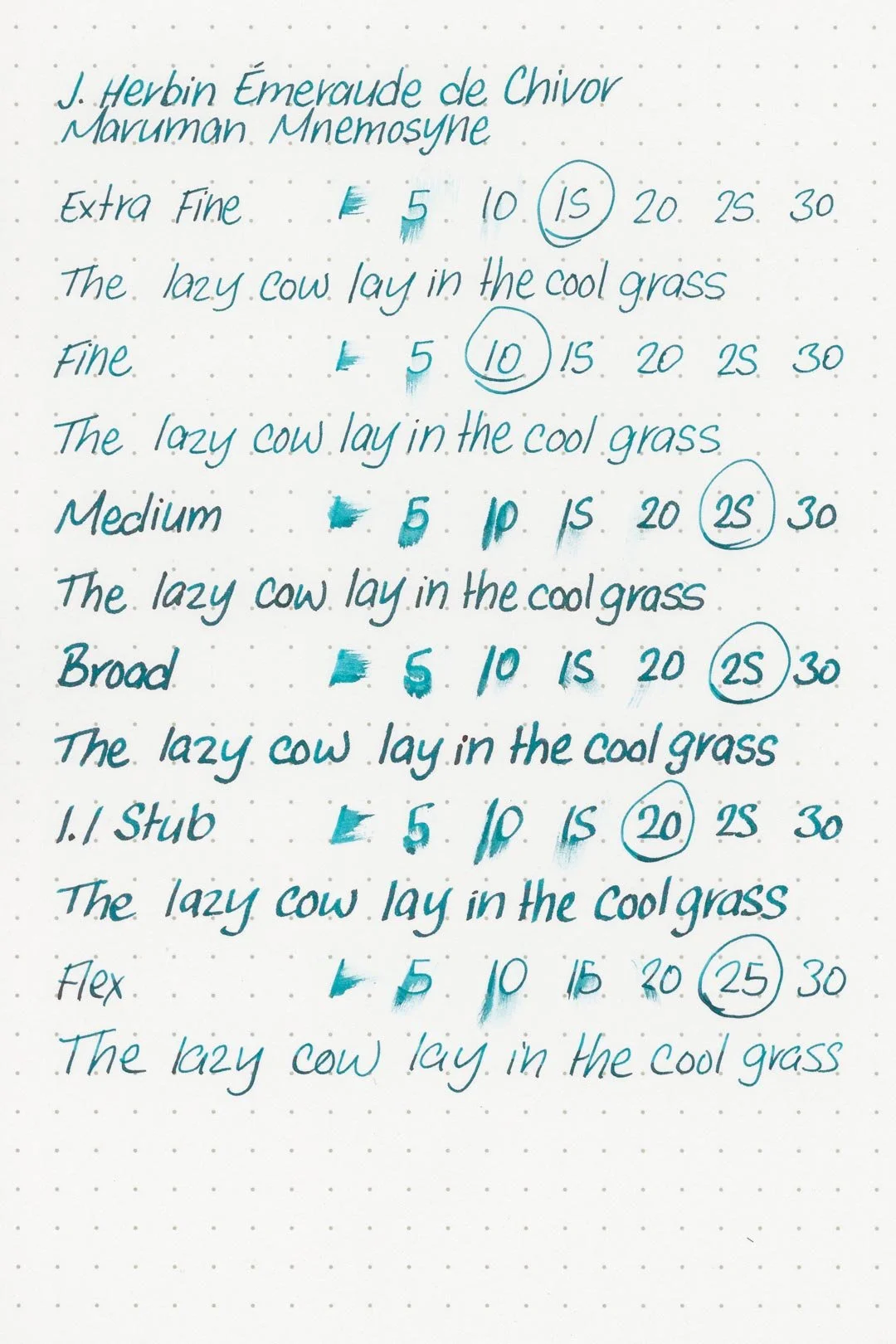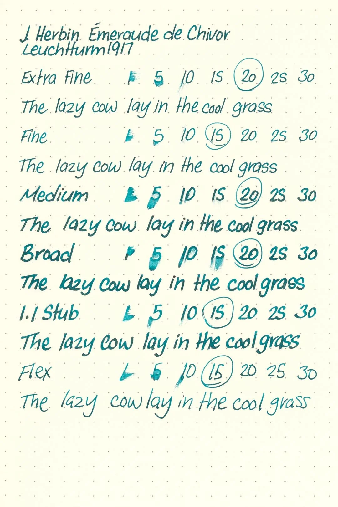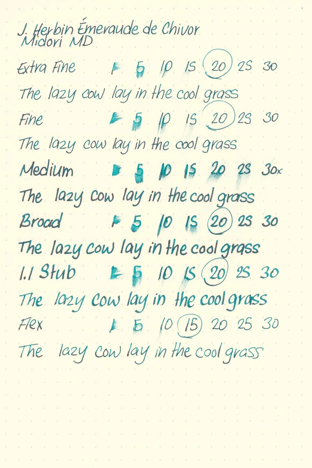 Émeraude de Chivor has a medium-wet flow and is well lubricated. The shimmer doesn’t feel sandy and flows easily, and doesn’t seem to need a lot of agitation to keep going. Overall, this is a very pleasant, above-average writing experience, especially for a shimmering ink. I didn’t run into any clogs, hard starts, skips, or stops during my tests, and the ink was able to keep up easily without any noticeable drops in flow during extended writing.