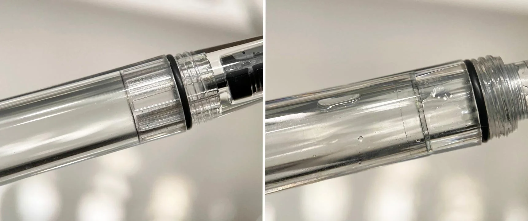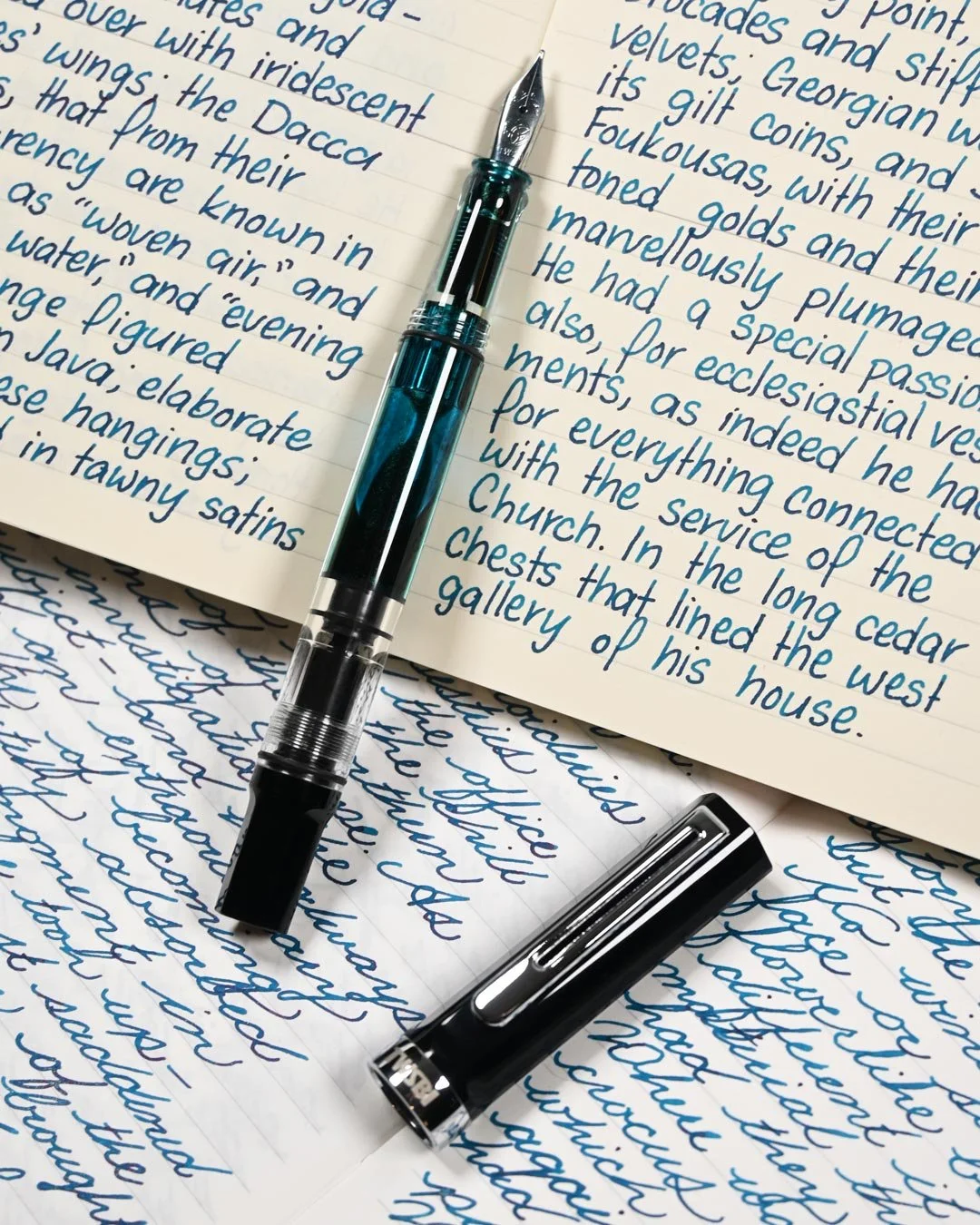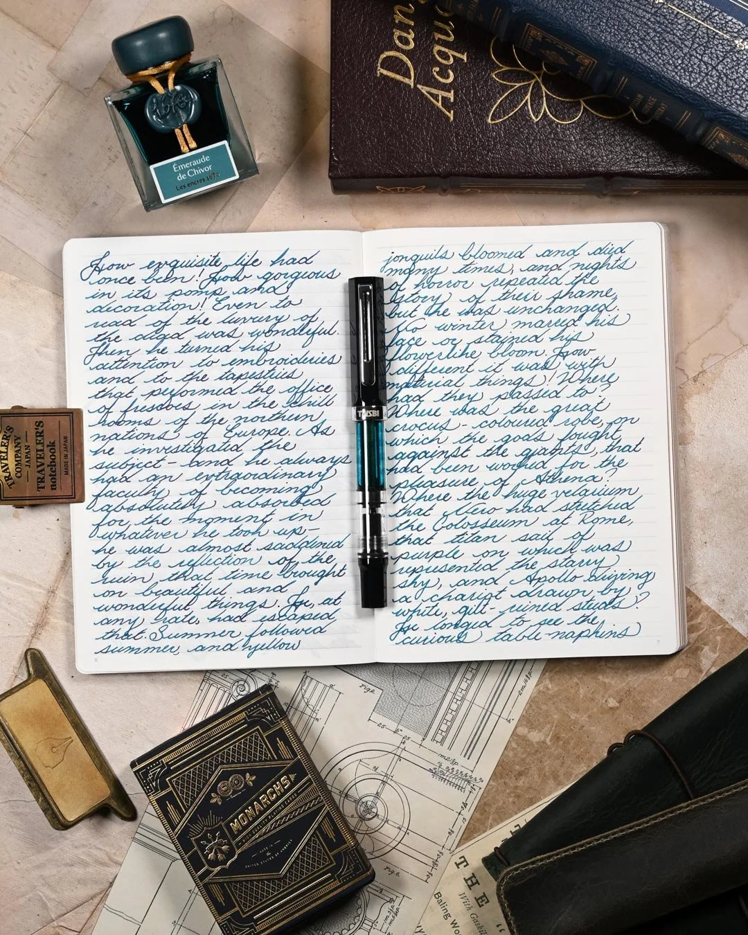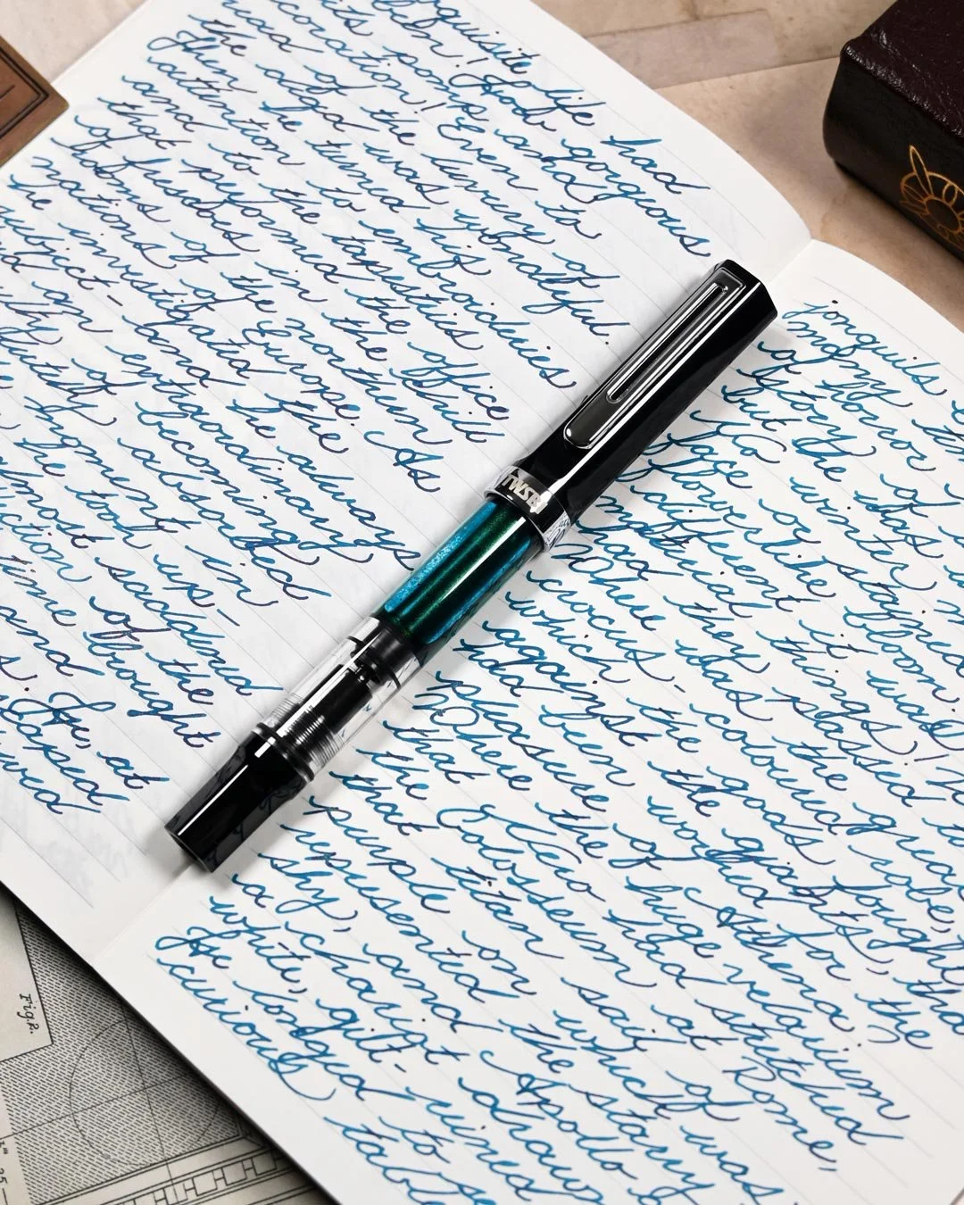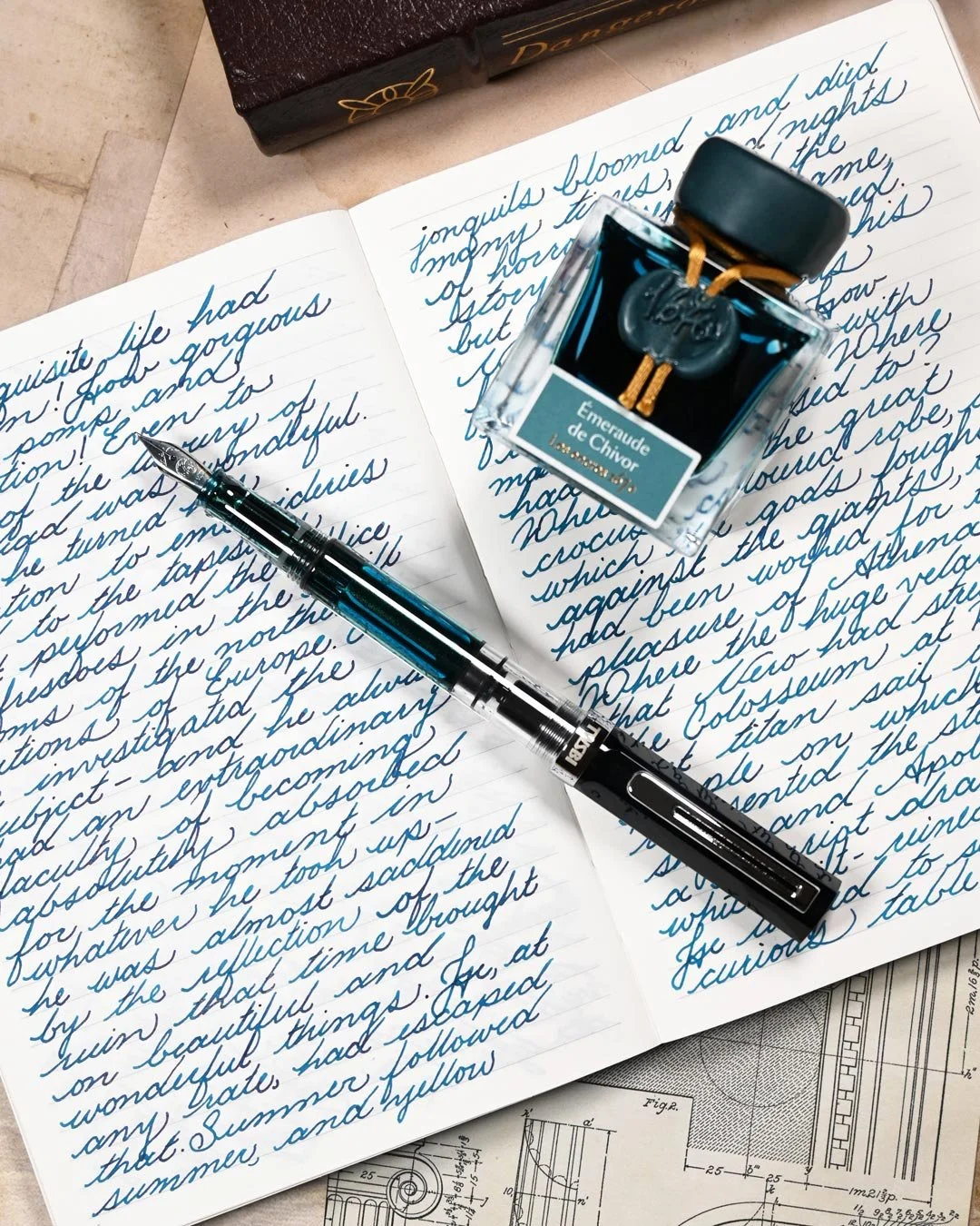 Because of its higher saturation, Émeraude de Chivor will take slightly longer to clean out, but overall, I didn’t find it that bad — in fact, before cleaning it out for this review, the TWSBI Eco I used for the writing samples had Émeraude de Chivor in it for about 2 years, and it cleaned out surprisingly quickly without leaving any stains. The test pen and nibs used for this review also cleaned out relatively easily (though still needing multiple soaks and flushes). Unfortunately, though, it’s still a shimmering ink, and there were a lot of particulates left over inside the barrel, as well as some traces of green residue. Both pens required disassembly for them to be swabbed out, and even though there weren’t any stains on my pens, I would still be wary of using this with demonstrators or lighter colored, easily stained pens.