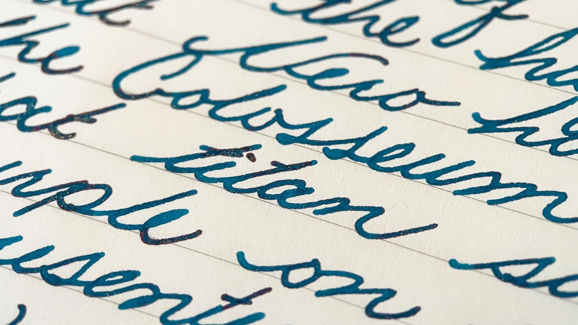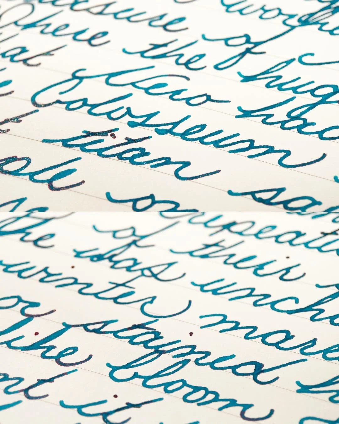 Here is an image of the same writing sample, taken in indirect lighting, allowing the shimmer and sheen to be easily visible.