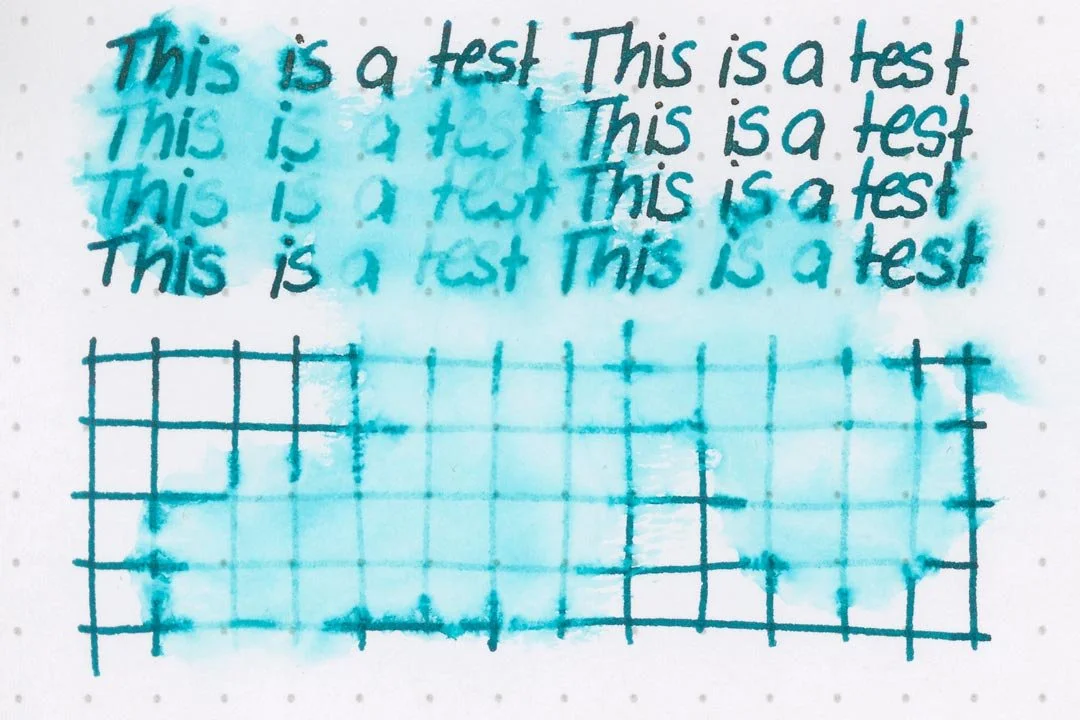 I was very surprised to see that there was some heavy bleed-through on the Tomoe River (52 gsm) sheet. There were some signs of feathering around the edges of the ink droplets and ink splat, so I shouldn’t be that surprised, but it was interesting that it didn’t bleed through the other papers (well, it was close on Leuchtturm, but not quite). It also didn’t bleed through the Tomoe River I used in my writing sample, even though they appear to be the same Sanzen Tomoe River. Perhaps it’s because the ink pools less when writing in cursive, but I can’t say. Either way, this ink should still be okay with most fountain pen-friendly papers, but some may be easily pushed to the limit, especially when used with wetter nibs.
