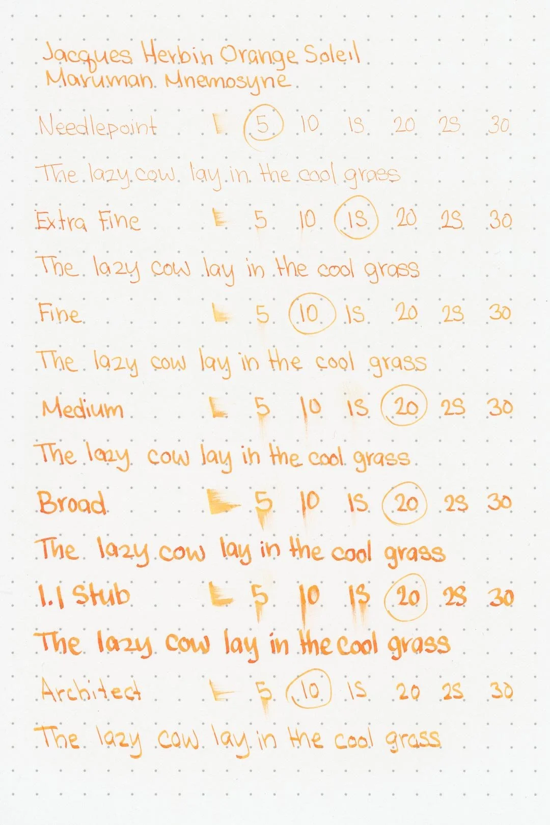 Jaques Herbin Orange Soleil is a bright and vibrant orange. It doesn’t have a lot of shading with the finer nib sizes — you may see some but I think with a wetter nib it can come out as a more solid orange, so if you don’t like shading, this could be a good option (although, I would perhaps recommend something like Diamine Pumpkin in that regard). The larger nib sizes (medium+), however, do begin to showcase some nice shading, especially the broad and 1.1 stub nibs. Heavily pooled areas in the writing show a much deeper orange, while the lighter parts even show traces of a yellow/orange gradient.