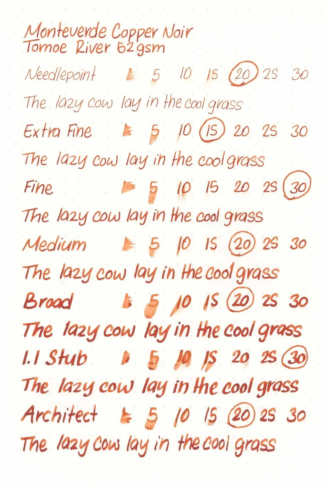 Copper Noir has a wet flow and enough lubrication to make for a very comfortable writing experience. I didn’t experience any hard starts, skips, or stops during my tests, and the ink kept up well during my extended writing tests without any noticeable drops in flow.