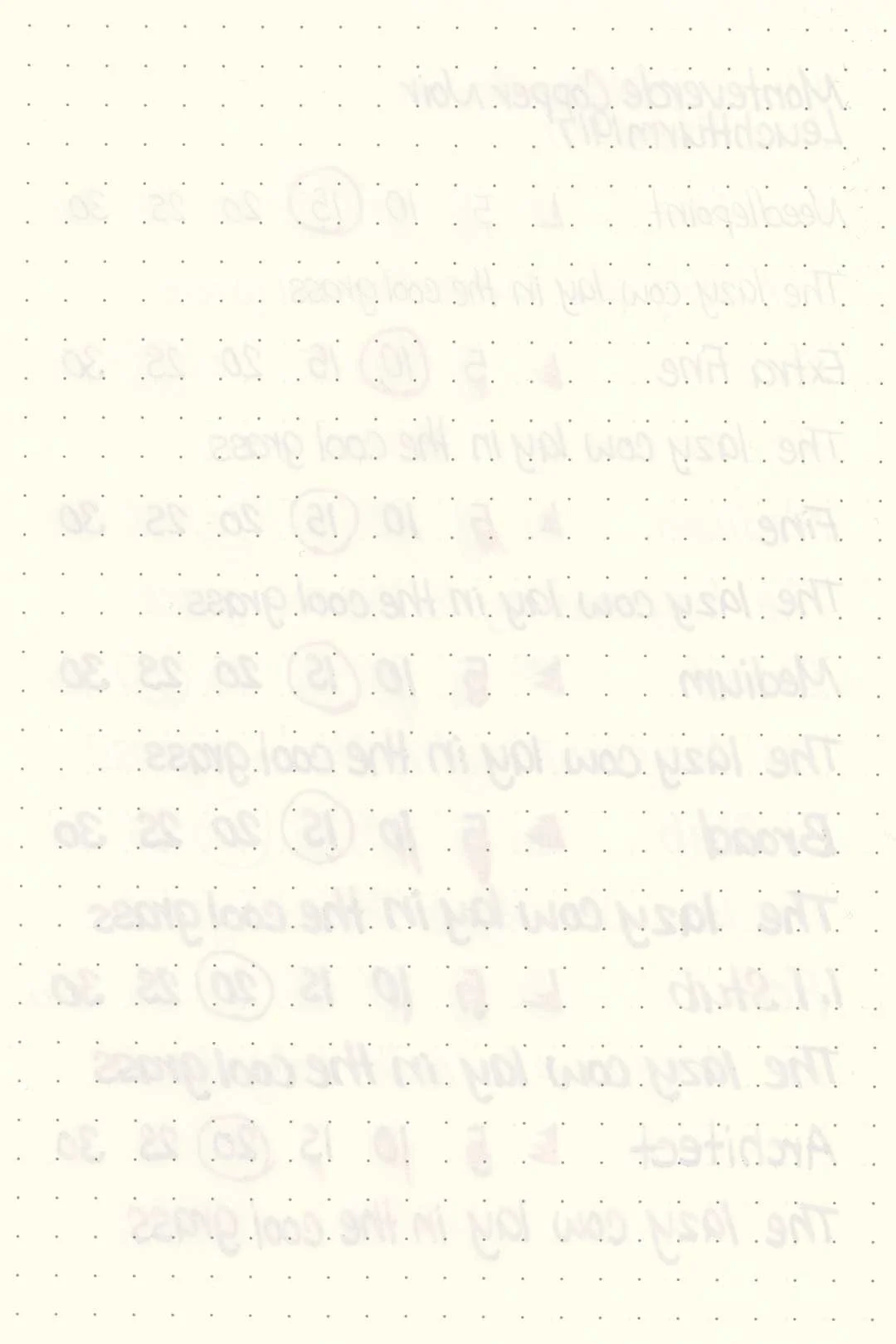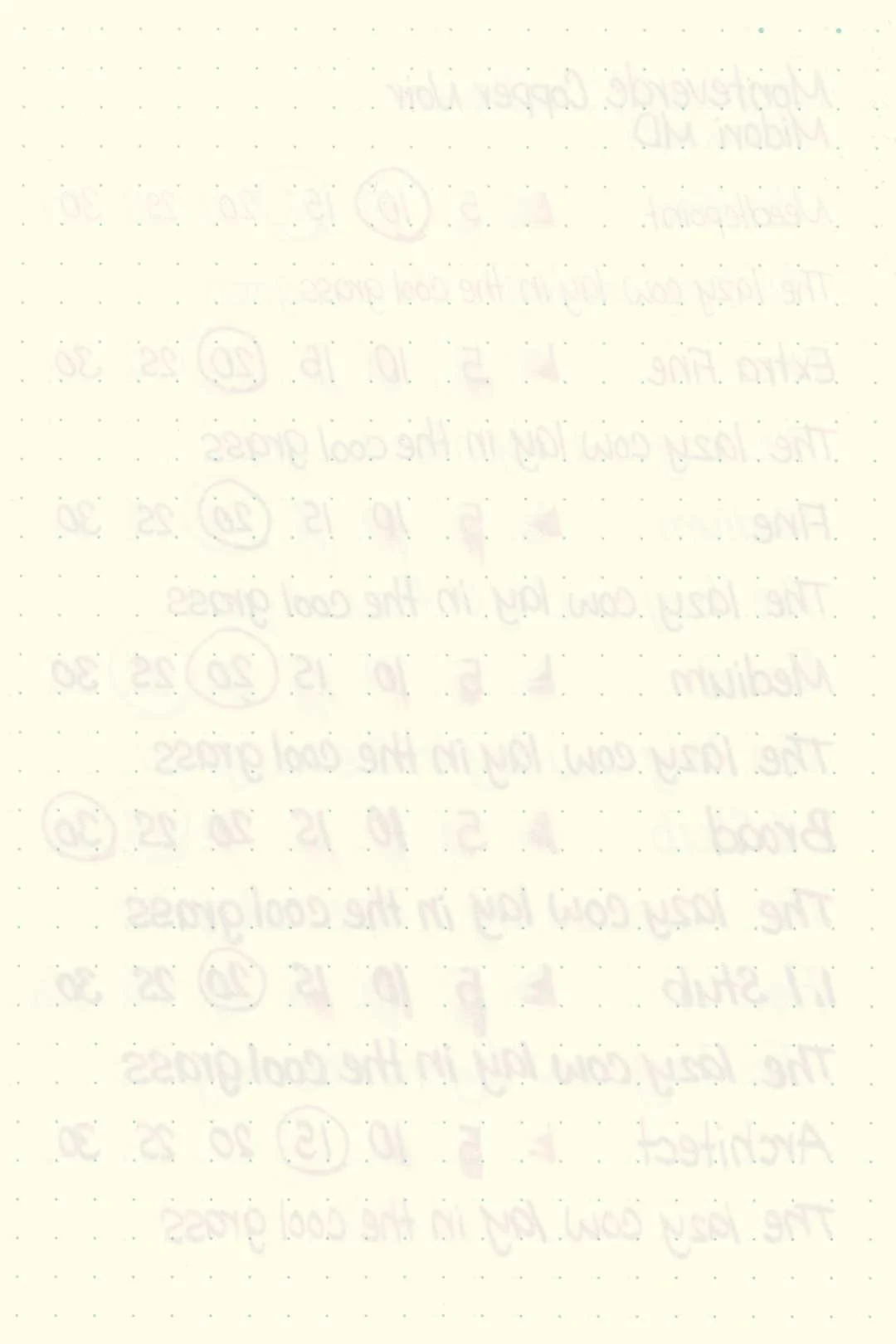 You may have noticed that the ink droplets above are extremely feathery, and that translates to the writing experience on many papers. I experienced feathering and minor bleed-through on the Kokuyo, Maruman, Leuchtturm, and Tomoe River (52 gsm) papers. This ink will be okay with some fountain pen-friendly papers (for instance, it worked well with Midori MD paper), but I recommend trying on a test page before committing to writing with it if feathering or bleed-through is a problem.
