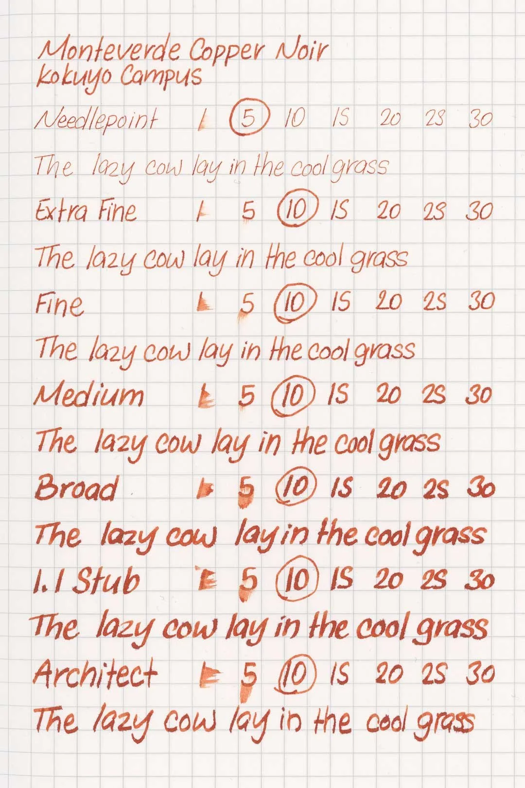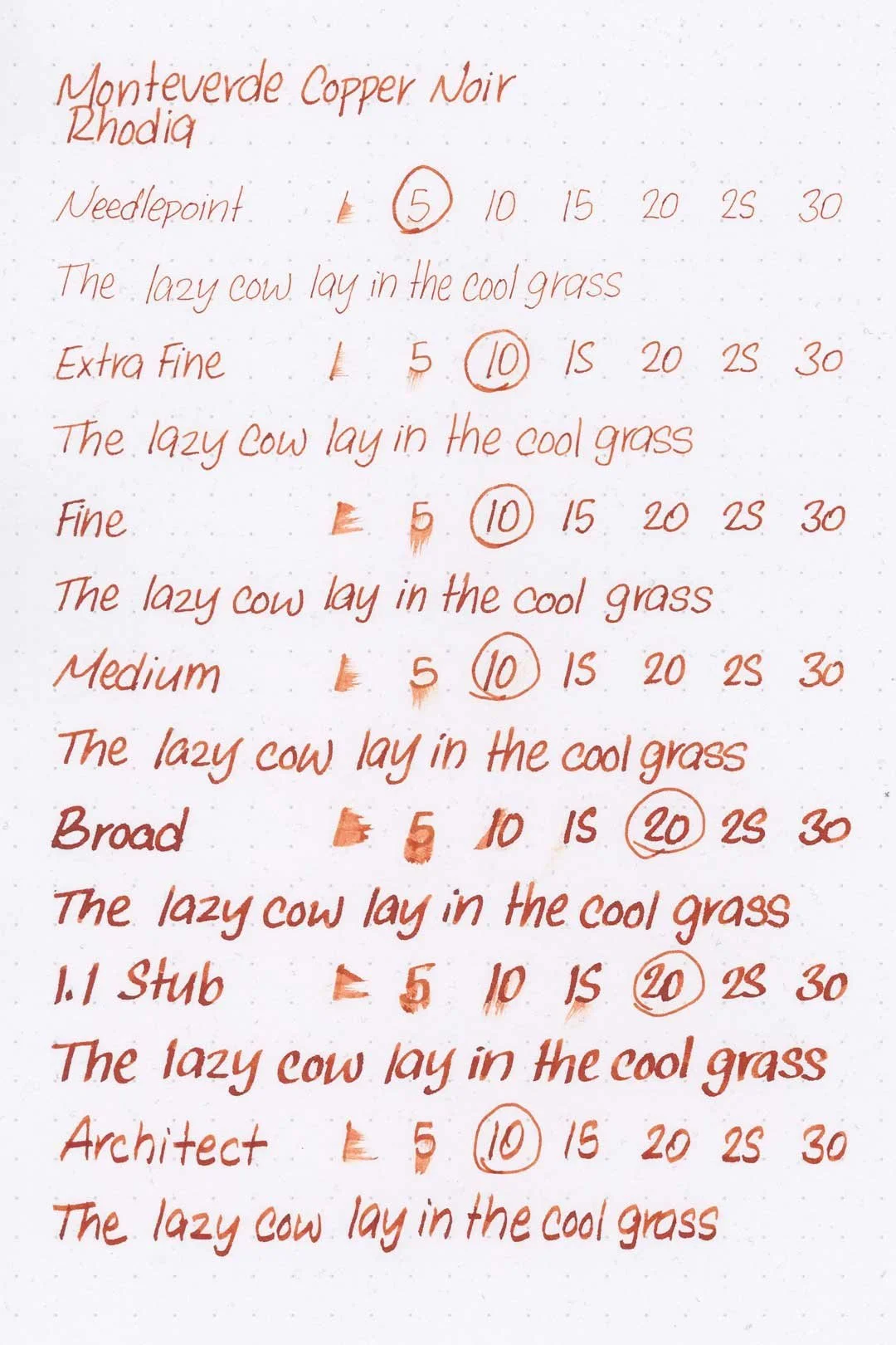 Monteverde Copper Noir is a bold orange that shades with a soft gradient in cursive and a slightly more pronounced soft cut when writing in print. The shaded areas have a nice contrast between a bright medium orange and a nearly red tone where the ink pools. If you’re familiar with Diamine Ancient Copper, Copper Noir is similar; however, Copper Noir leans more orange (I’ve included a comparison at the end of the review).