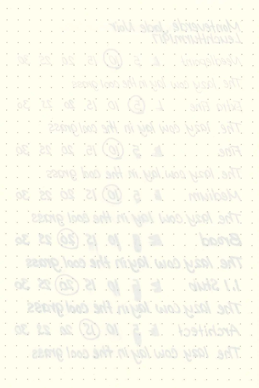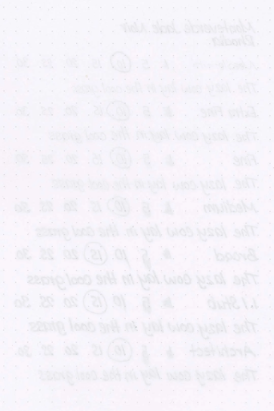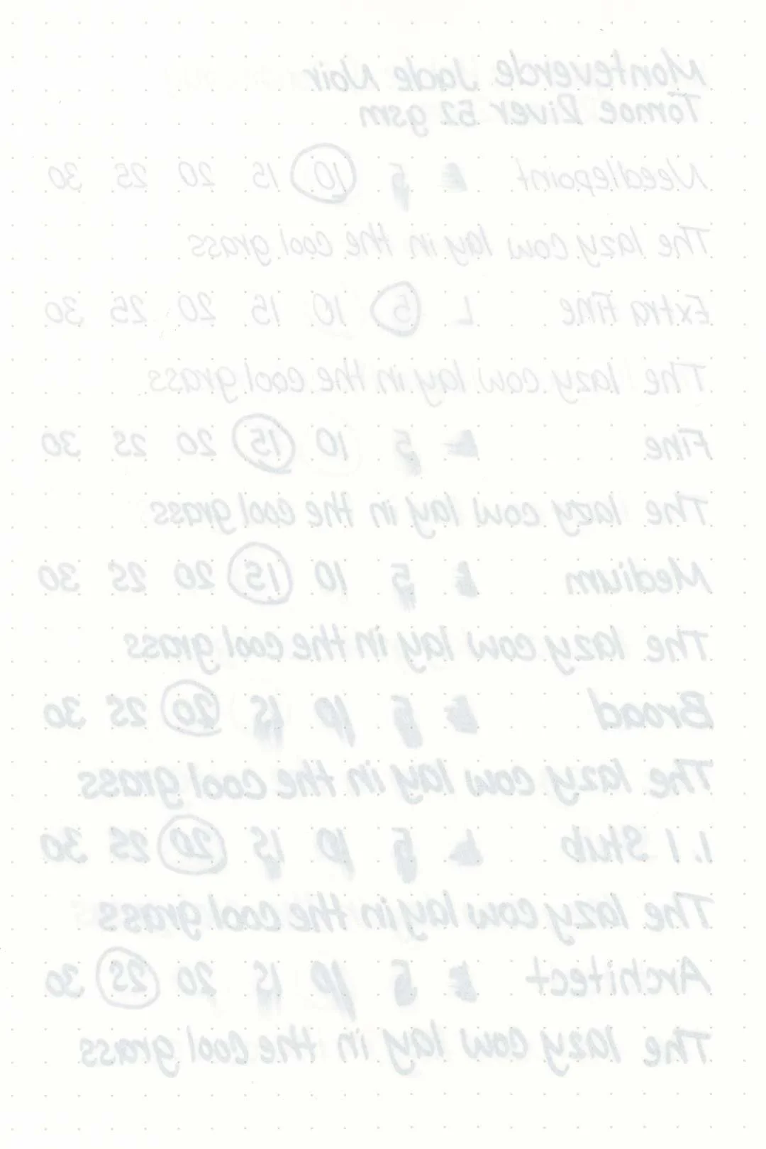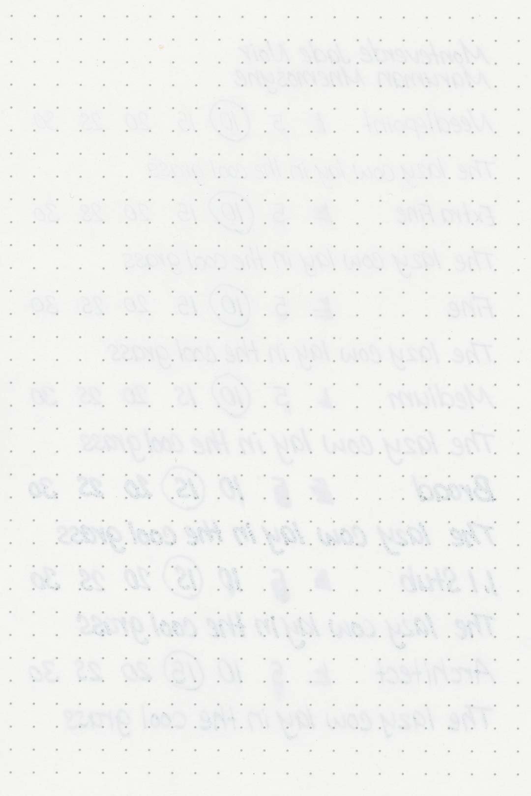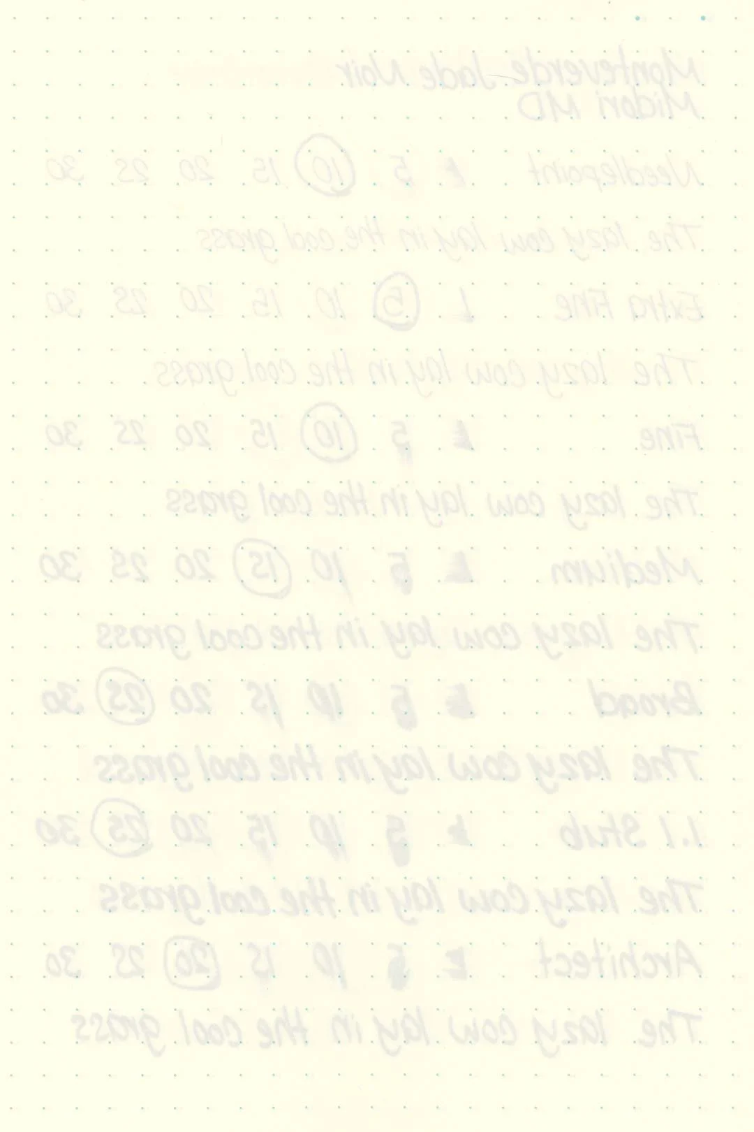 During my tests, I experienced a surprising amount of feathering in the Maruman Mnemosyne notebook, as well as some light bleedthrough, mostly with the broad and 1.1mm stub nibs, but even the medium nib showed some mild feathering around the tail ends of letters. While it was the worst on the Maruman paper, there was also some light feathering and bleeding on the Rhodia, Leuchtturm, and Tomoe River. There was the usual bleeding and feathering in the Kokuyo Campus notebook as well, and even in the ink droplets above, you can see some heavy feathering around the edges. This ink should still be okay with most pen and paper combinations, but pens with a wet flow will almost certainly push many papers past their limits. I recommend trying on a test page first.