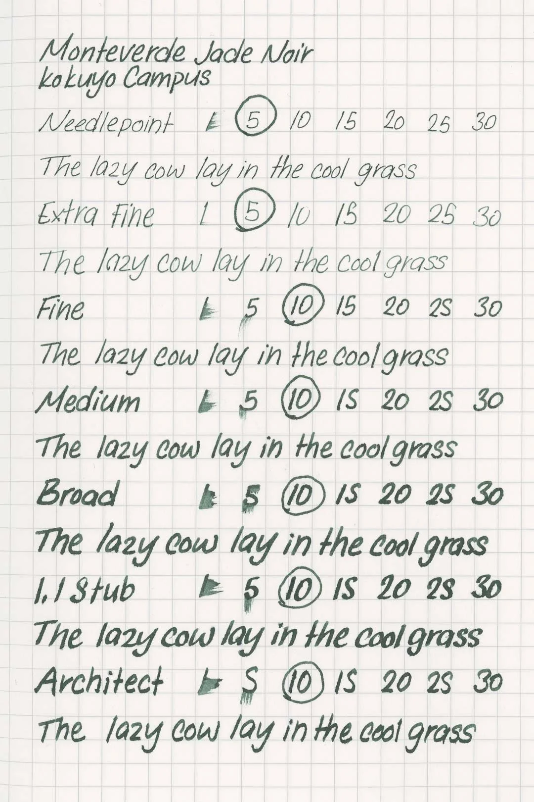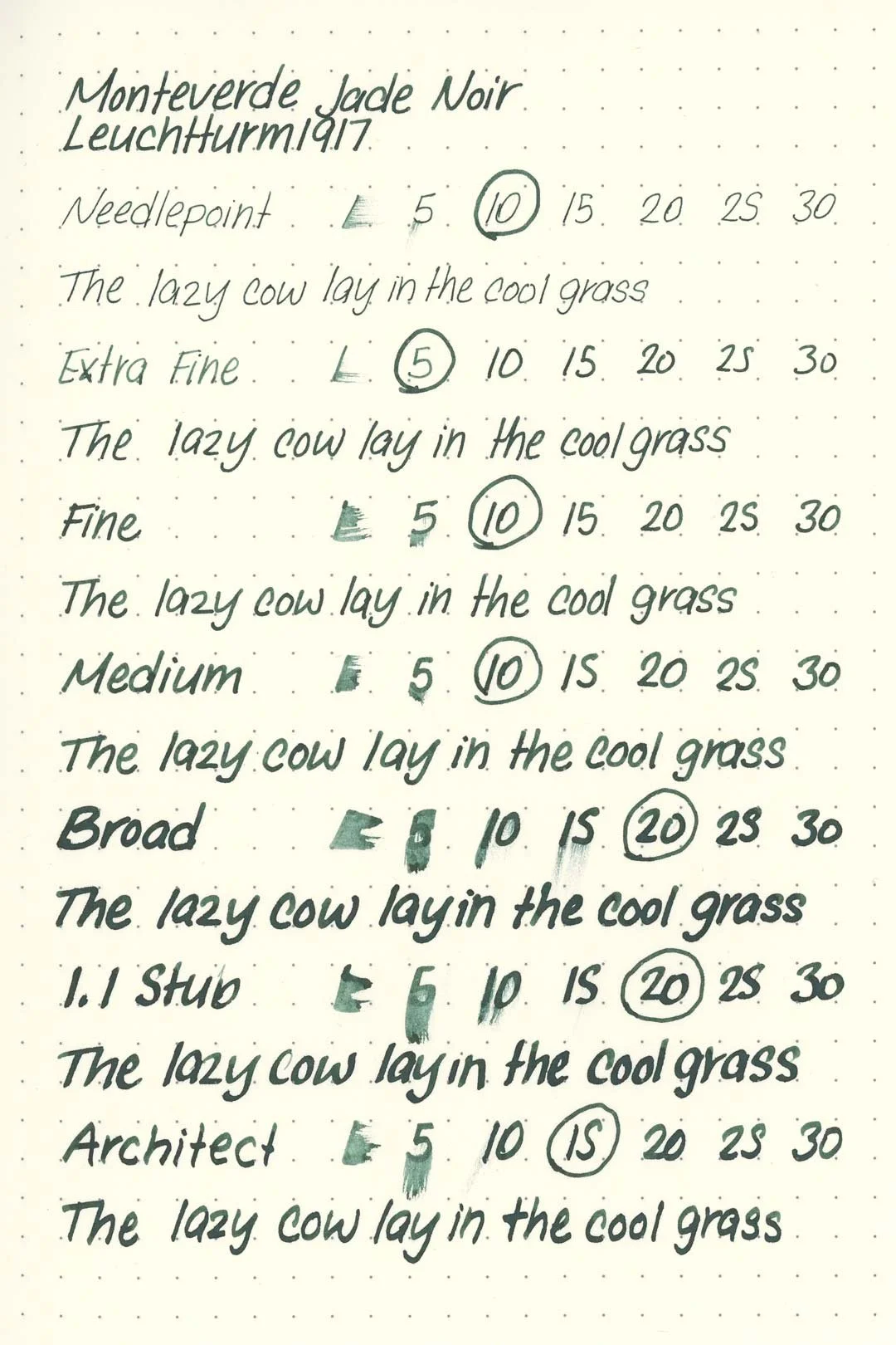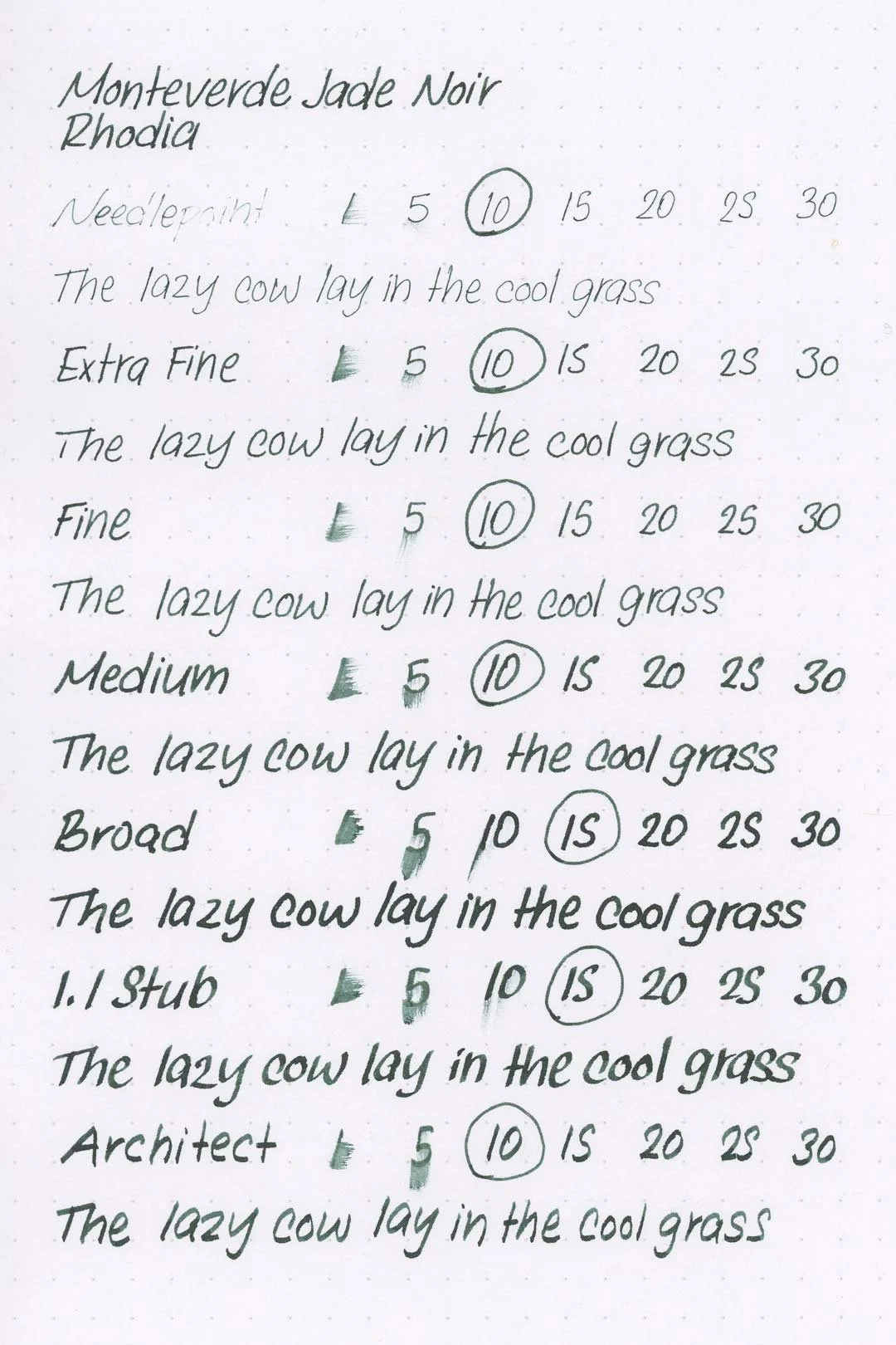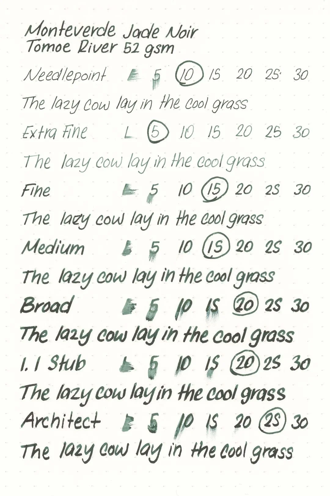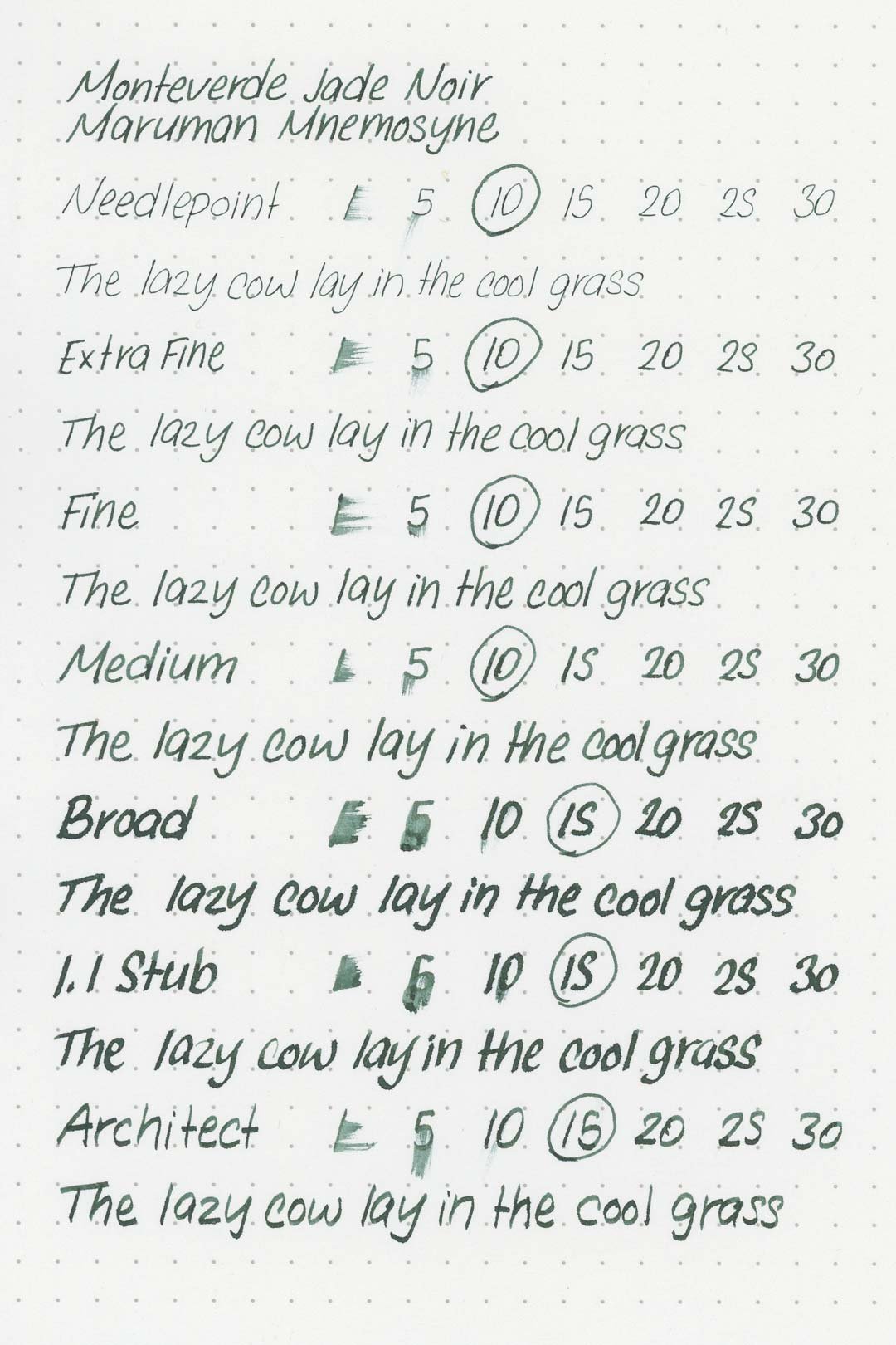 Jade Noir has a medium-wet flow and is very well lubricated, making for a pleasantly smooth writing experience. Based on the higher saturation, I expected there to be some issues with the ink drying out too quickly in the nib, but I never encountered an issue. In fact, the ink was very well-behaved during my writing tests. I never experienced any hard starts, skips, stops, or drops in flow during extended writing.