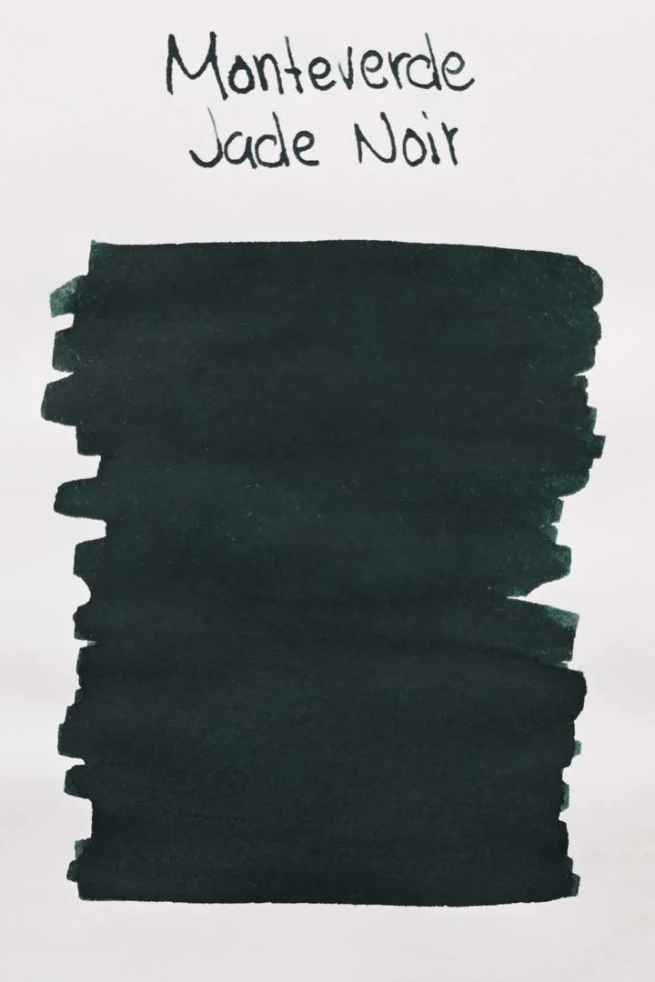 Monteverde Jade Noir is a dark green with slight blue undertones. It shades with a soft cut when writing in both cursive and print, but there’s not a lot of tonal variation between the shaded and non-shaded areas. Instead, there’s a light red sheen that may appear around the edges of letters or around the edges of where the ink pools. The sheen is noticeable enough, but not so much that I would call this a sheening ink.