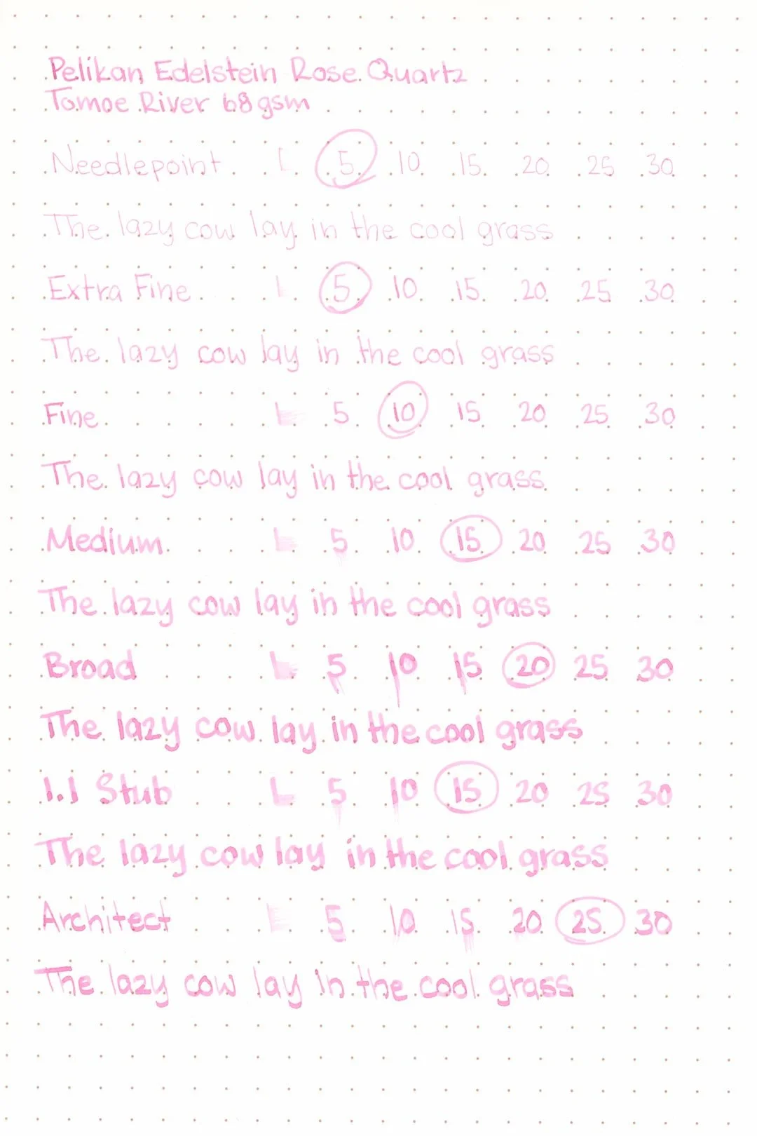 Rose Quartz has a medium flow that was mostly consistent across each of the test nibs, but there was a noticeably higher flow with the architect nib. The ink isn’t especially slick, but it was lubricated enough to provide a comfortable and consistent writing experience between all the nib sizes. I experienced some light hard starting on the less spongy papers (Rhodia and Maruman) with the broad nib, but otherwise, this ink was well-behaved.