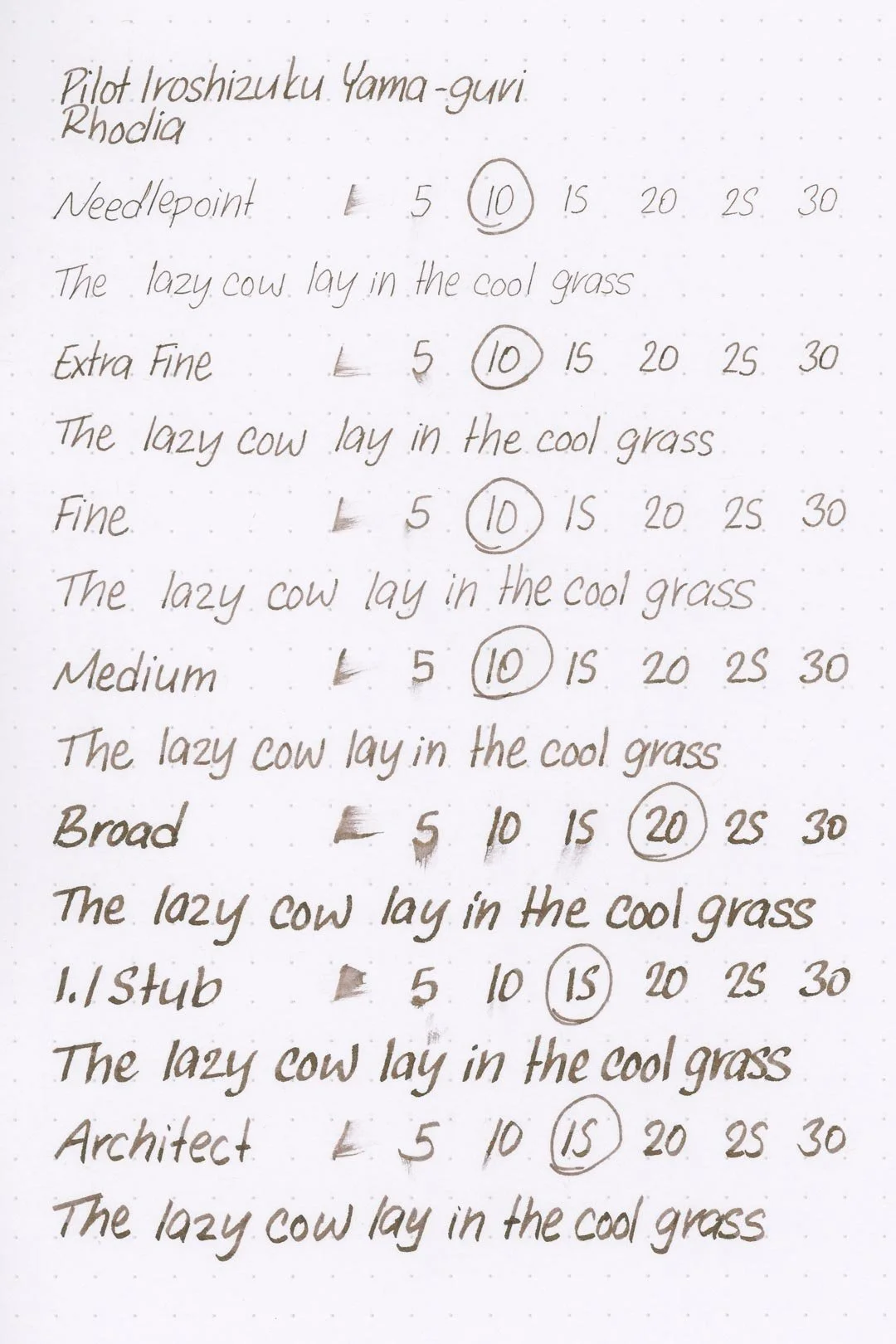 I once had a friend tell me that Yama-guri is “whatever color it feels at any given moment,” and while comical, that’s honestly not a bad way to describe it. With so many layers that make up the final ink (easy to see in the chromatography), it’s no question that Yama-guri is far more than initially meets the eye, and I think that makes it one of, if not the most unique color in Iroshizuku’s lineup. It’s fantastic! I think it would make a great daily ink too — it’s dark enough for easy legibility, dries fast, and despite the unique color, it’s tempered and overall understated. I suppose that’s why I never hear it talked about: it simply doesn’t bring too much attention to itself, which is tragic because it deserves far more of it, especially amongst people who love brown inks. Don’t sleep on this one.