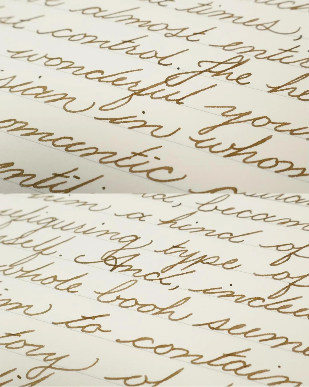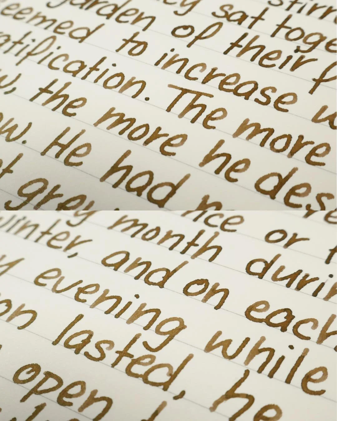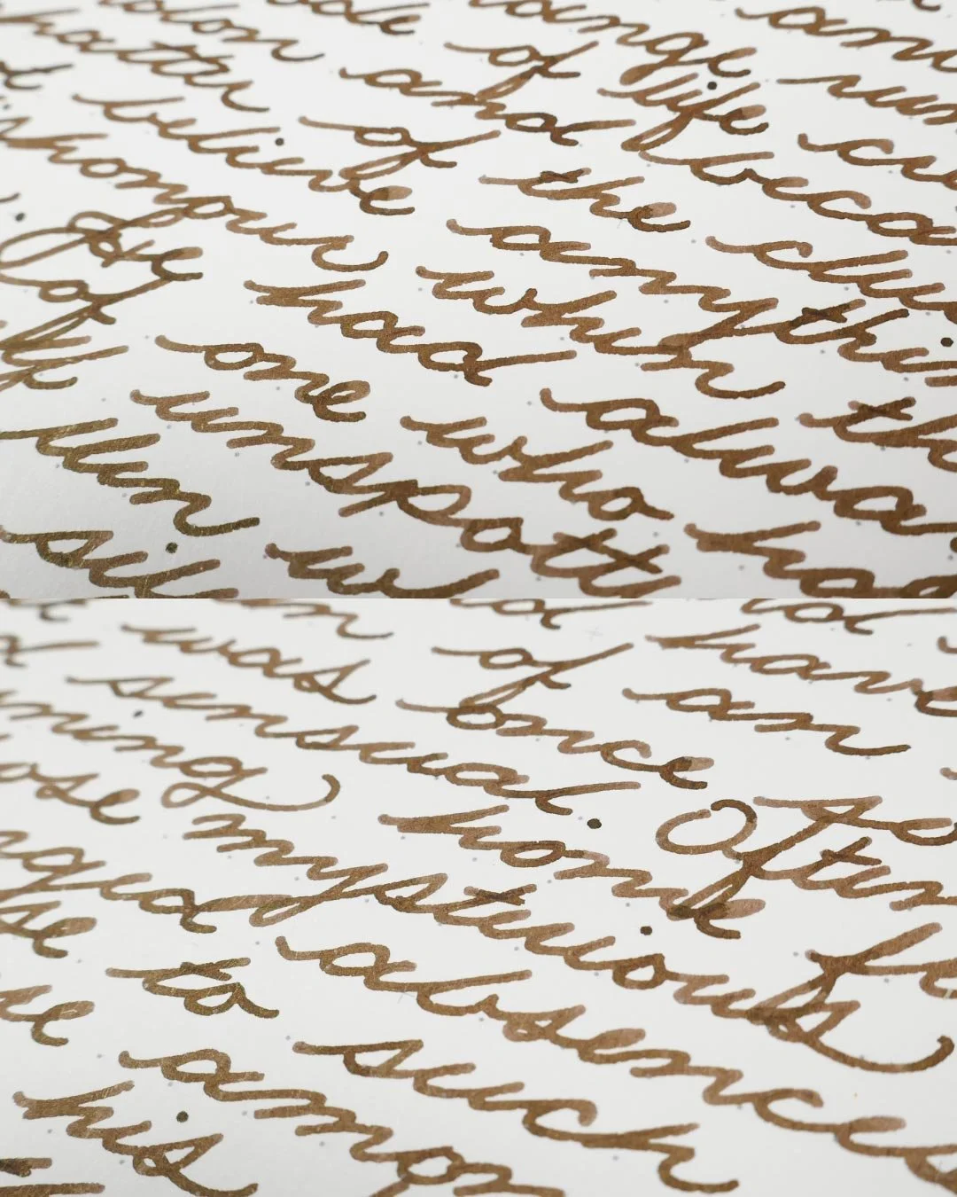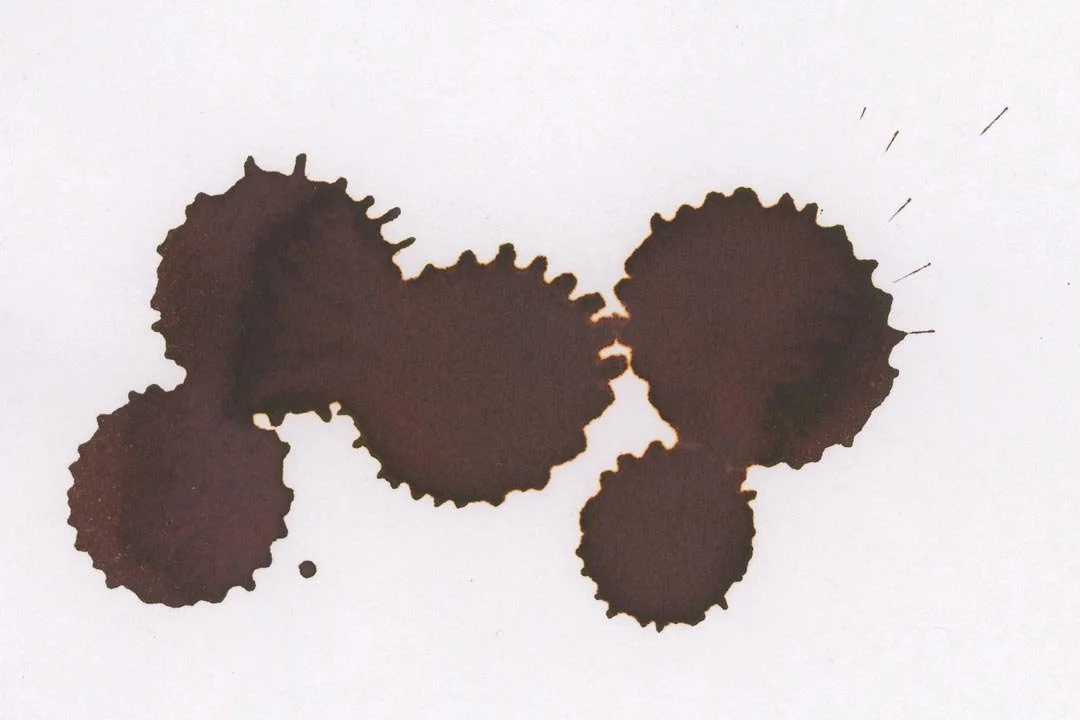 Yama-guri is a dark grey-brown that also has some minor purple and even green undertones. The way this ink looks can change drastically based on the lighting and how much is laid down. In swatches and splats, etc, Yama-guri will look more brown; however, in writing (especially on white paper), the grey tones come forward. In cursive writing, the ink mostly shades as a soft gradient through the letters, and in print, there’s a soft cut between light and darker tones where the ink pools the most, as well as dark edges around the letters and shaded areas.