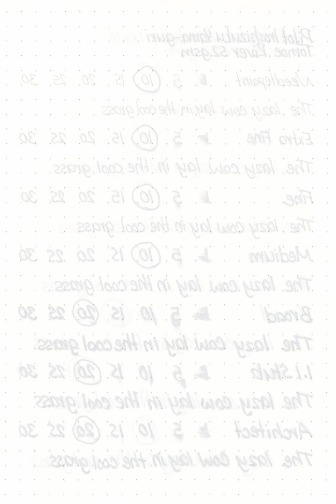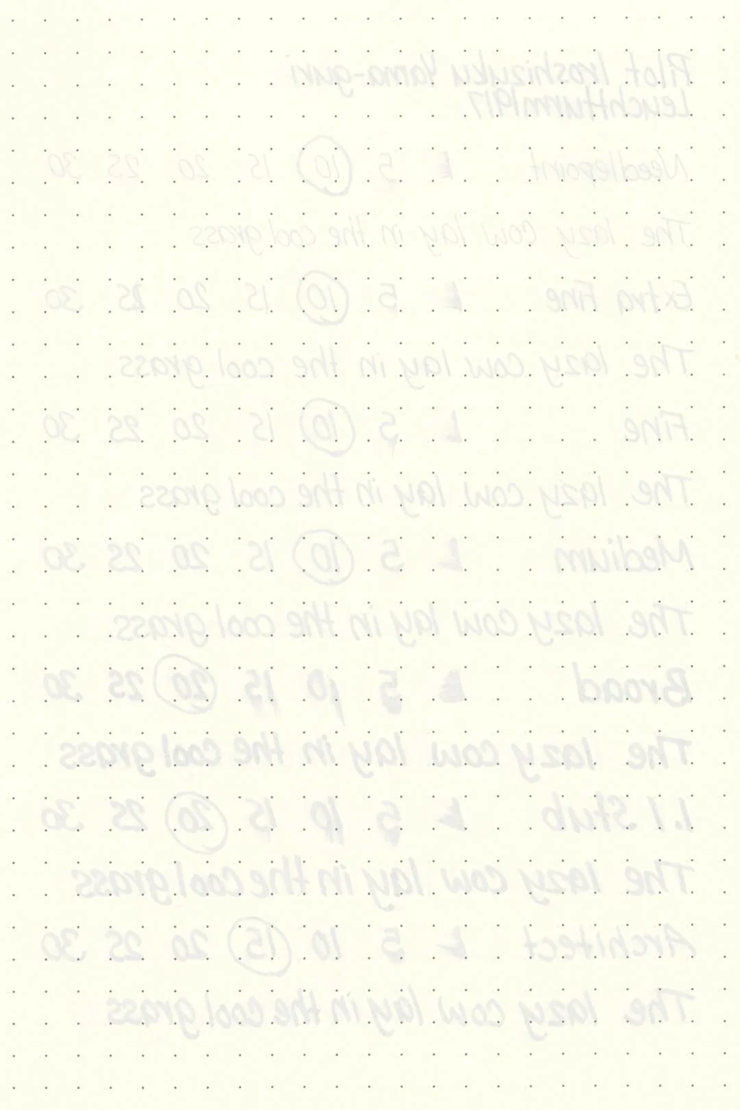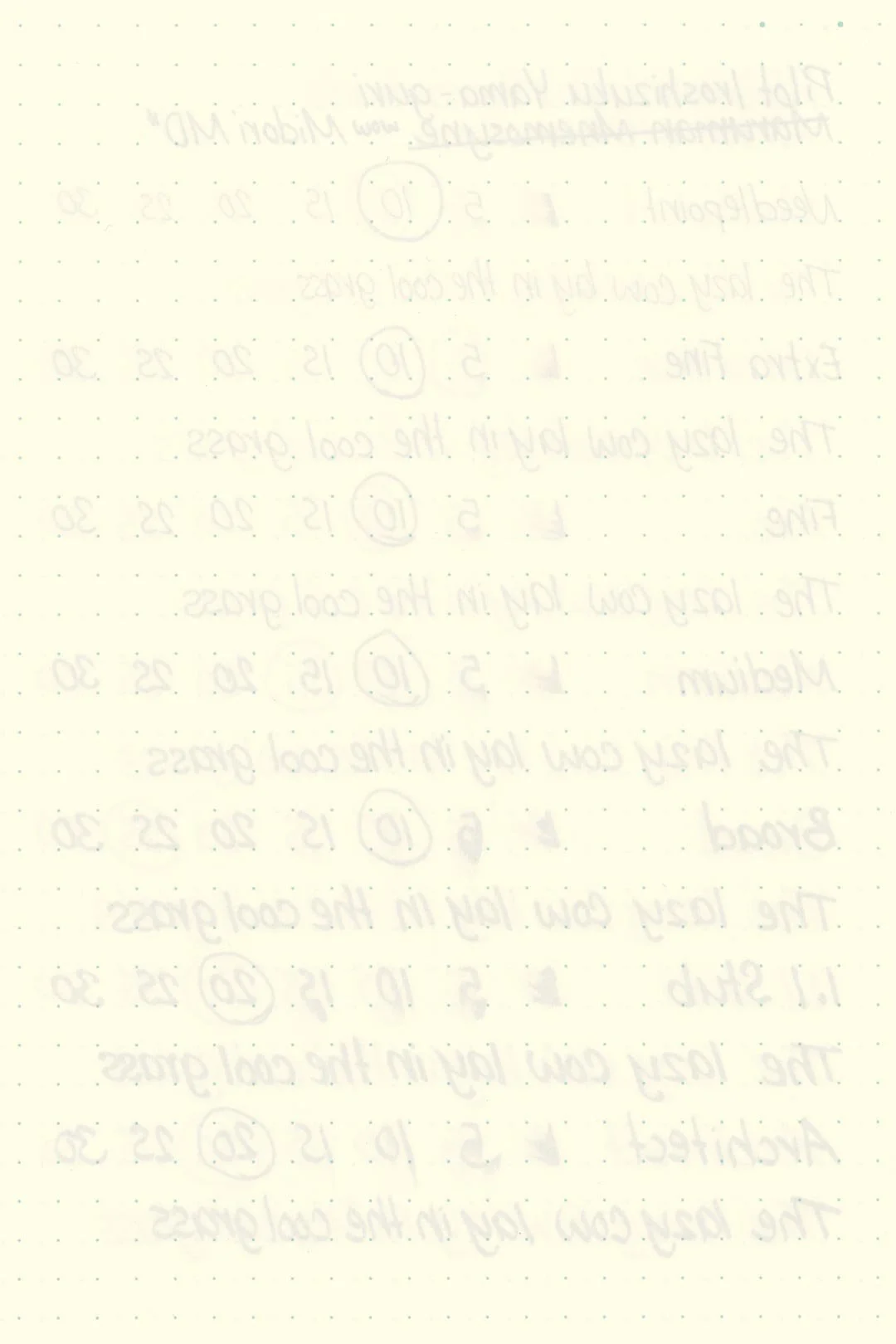 Yama-guri had excellent performance. There weren’t any traces of bleeding or feathering on any of my test pages, but you may have noticed that there was some very slight feathering in the ink droplets above. Yama-guri should be fine on most fountain pen-friendly papers; however, using wetter nibs may push some less ink-resistant papers to their limit and cause light feathering.
