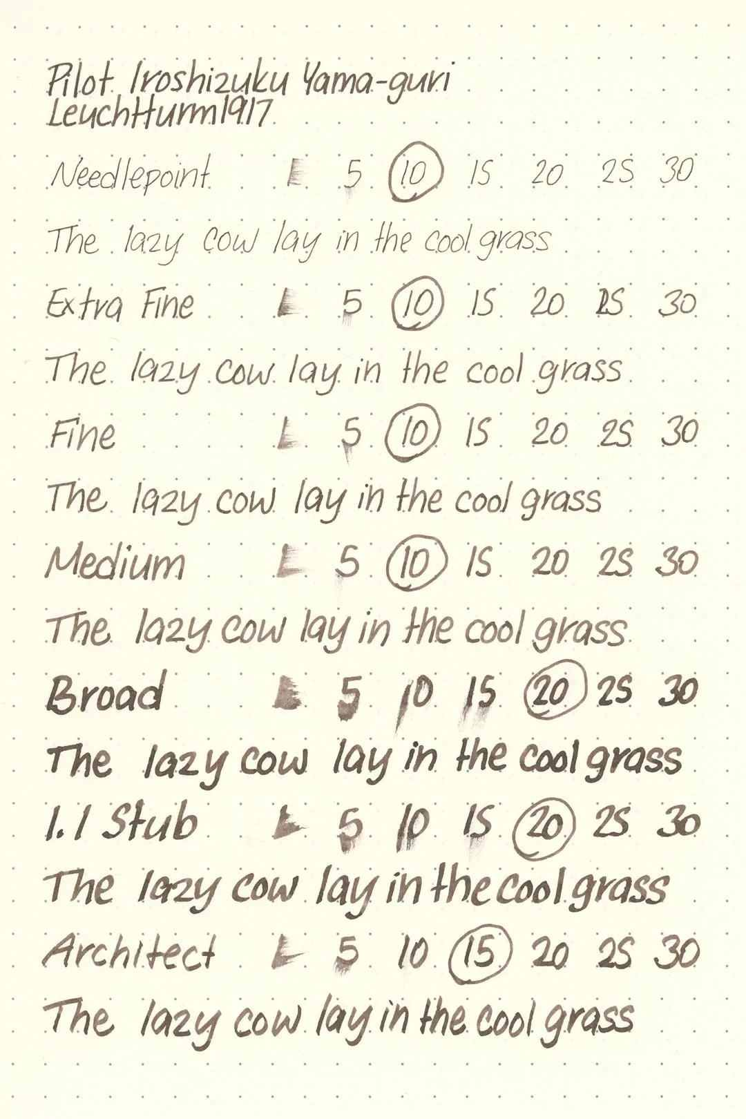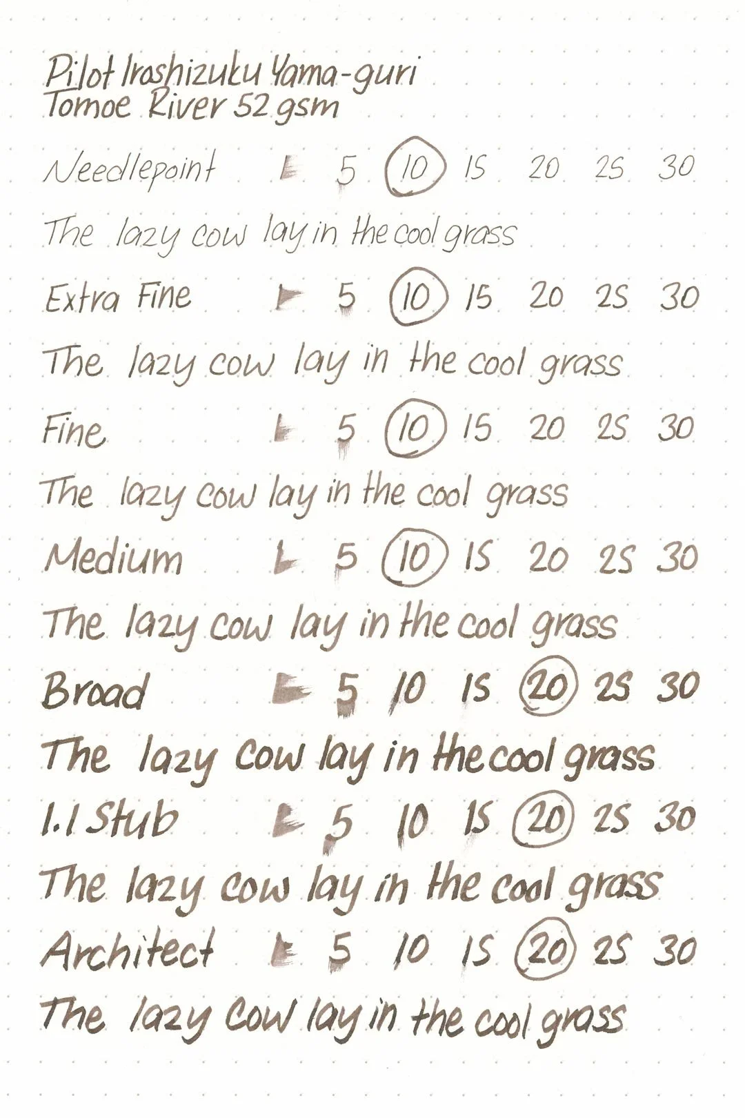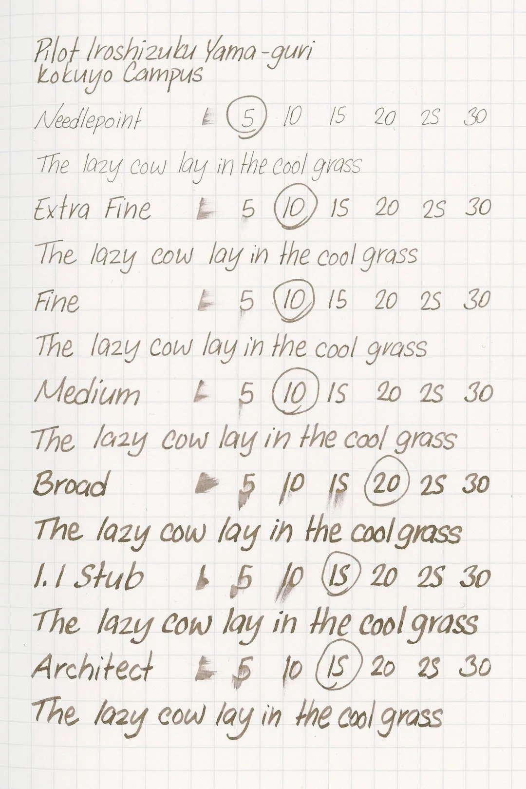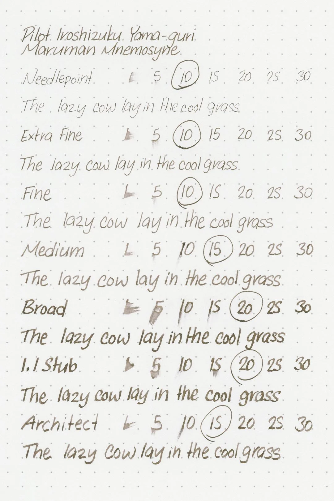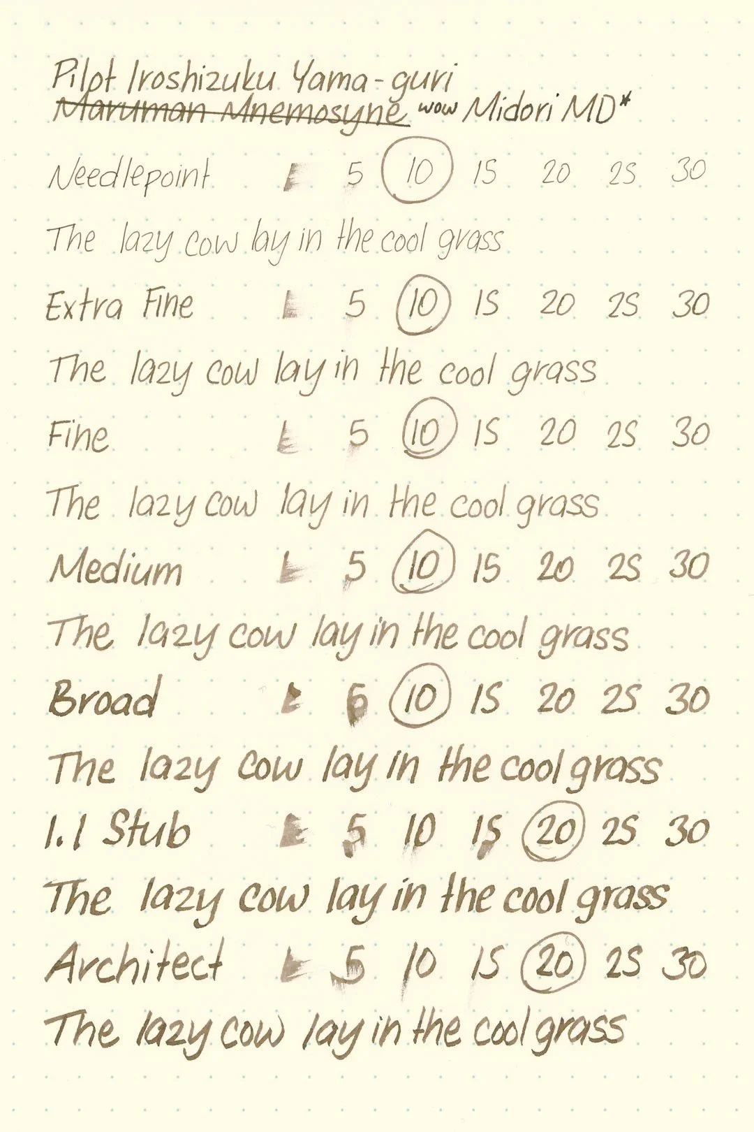Yama-guri has a medium flow and average lubrication. It’s not particularly slick, but it doesn’t feel draggy or sandy either. It’s a comfortable but run-of-the-mill writing experience. I didn’t have any hard starts, skipping, or stops during my tests, and the ink was easily able to keep up with my extended writing sessions without any drops in flow.