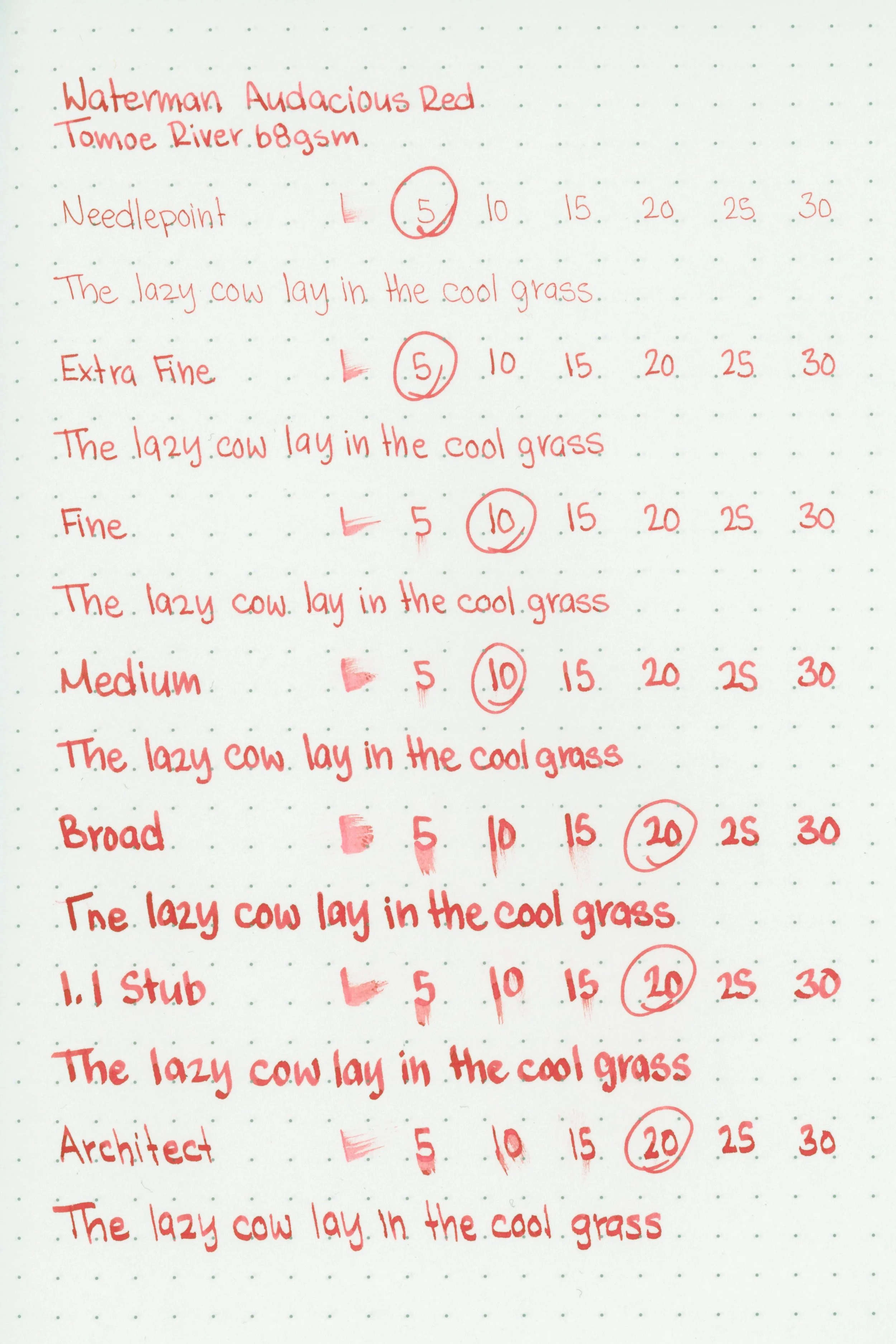 Audacious Red performed better than I thought it would! It has a dry-medium flow, and I expected there would be a lot of hard starting, but I didn’t experience any (there was one visible hard start with the broad nib on Tomoe River, but it was a user error). The ink isn’t especially slick, but it was enough to make the writing experience comfortable enough.
