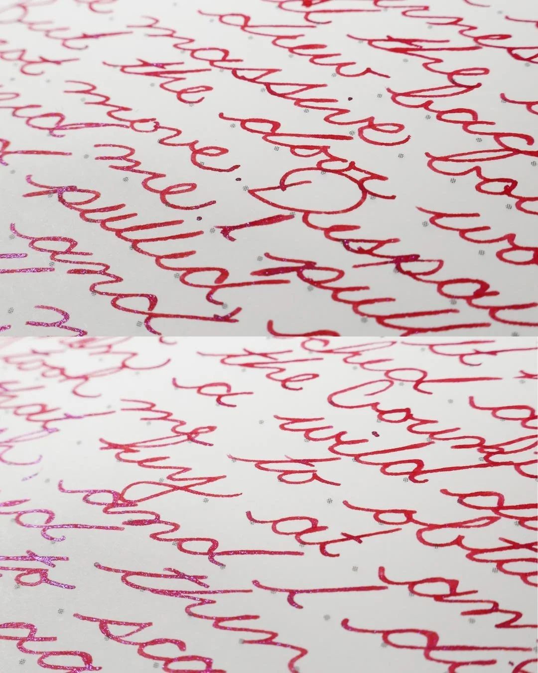 Dracula has a dry-medium flow and enough lubrication to provide an average writing experience. The ink needs light agitation to keep the shimmer flowing, but I never ran into any clogs during my tests, and there’s no feeling of sandiness. There is, however, a slight drop off in flow during extended writing, especially when writing in cursive. It’s not that noticeable visually, but you can easily feel it as the lubrication goes away. The lower flow also means that it didn’t work well when used with the semi-flex nib, which resulted in a lot of railroading. I think in most cases, the flow isn’t a huge problem, especially when writing in print, but I do wish it were just slightly flowier.
