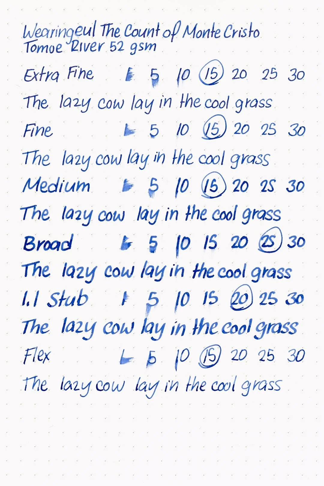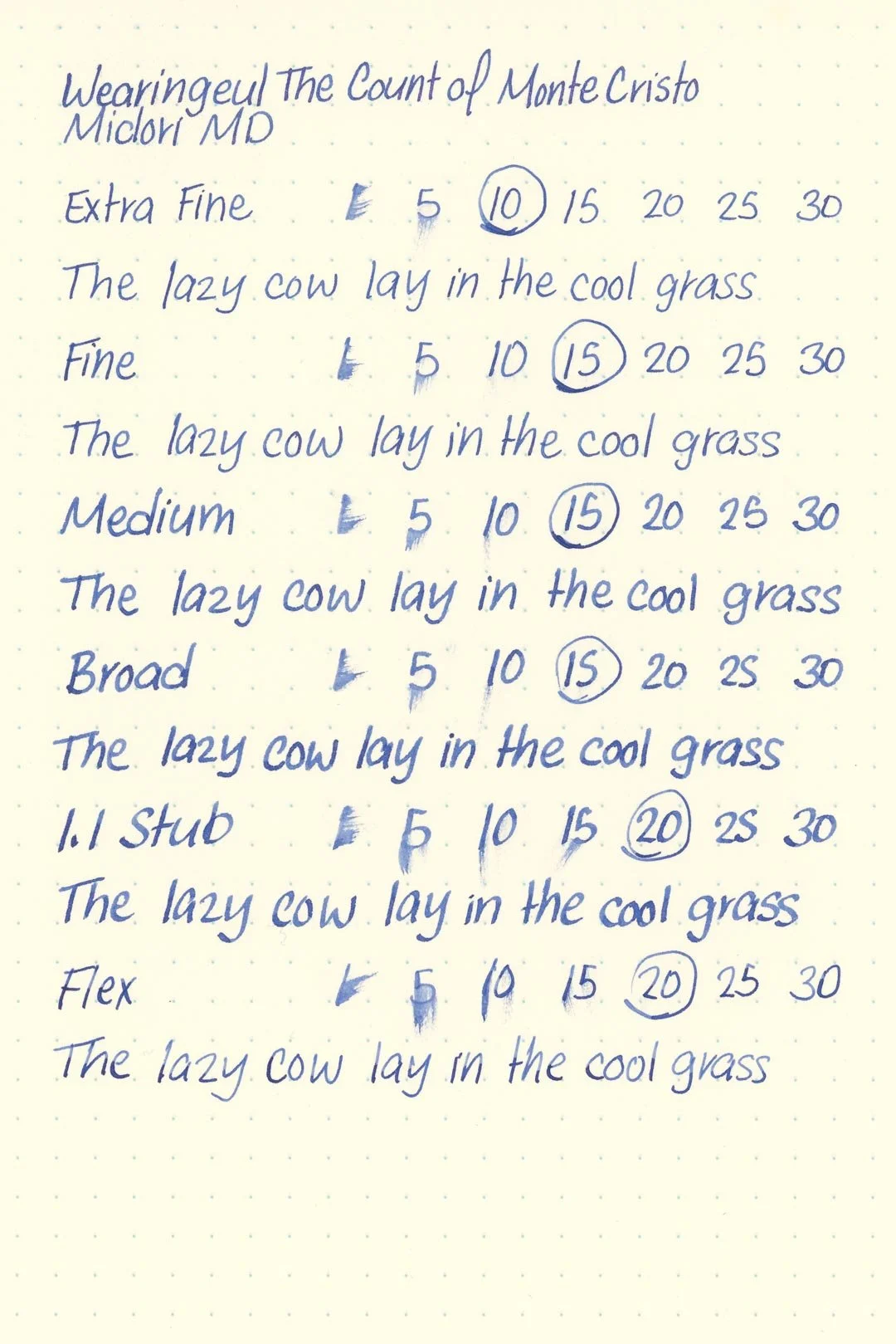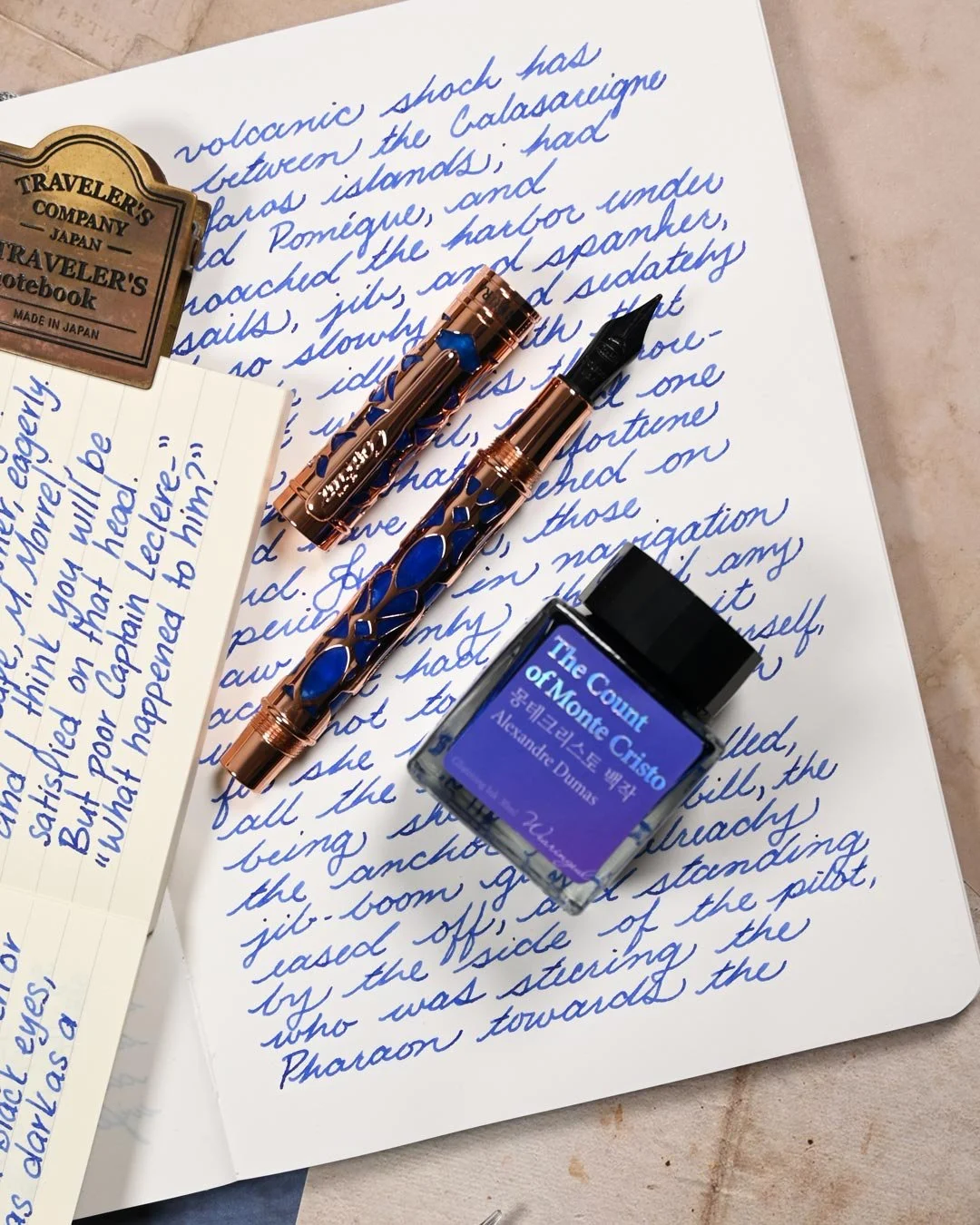 The Count of Monte Cristo has a dry-medium flow, and that led to a few frustrating clogs with the extra fine and fine nibs. The other nibs thankfully didn’t have any issues with clogs, hard stops, or skipping; however, there’s still a general feeling of low lubrication. It’s not awful, but if you like slick inks, this isn’t going to be it. I mentioned earlier that there’s not all that much shimmer, and I think the lack of a significant flow has a lot to do with it. Agitating the pen doesn’t seem to help much, and maybe a higher-flowing feed may help, but your mileage may vary.