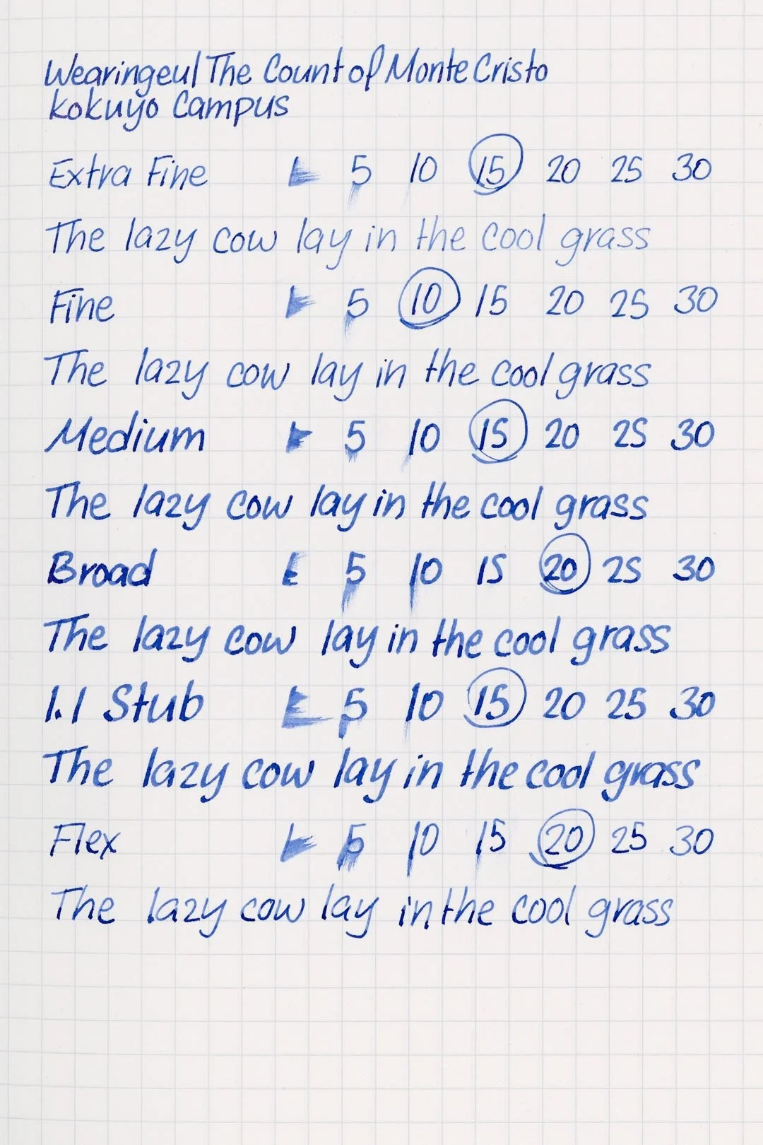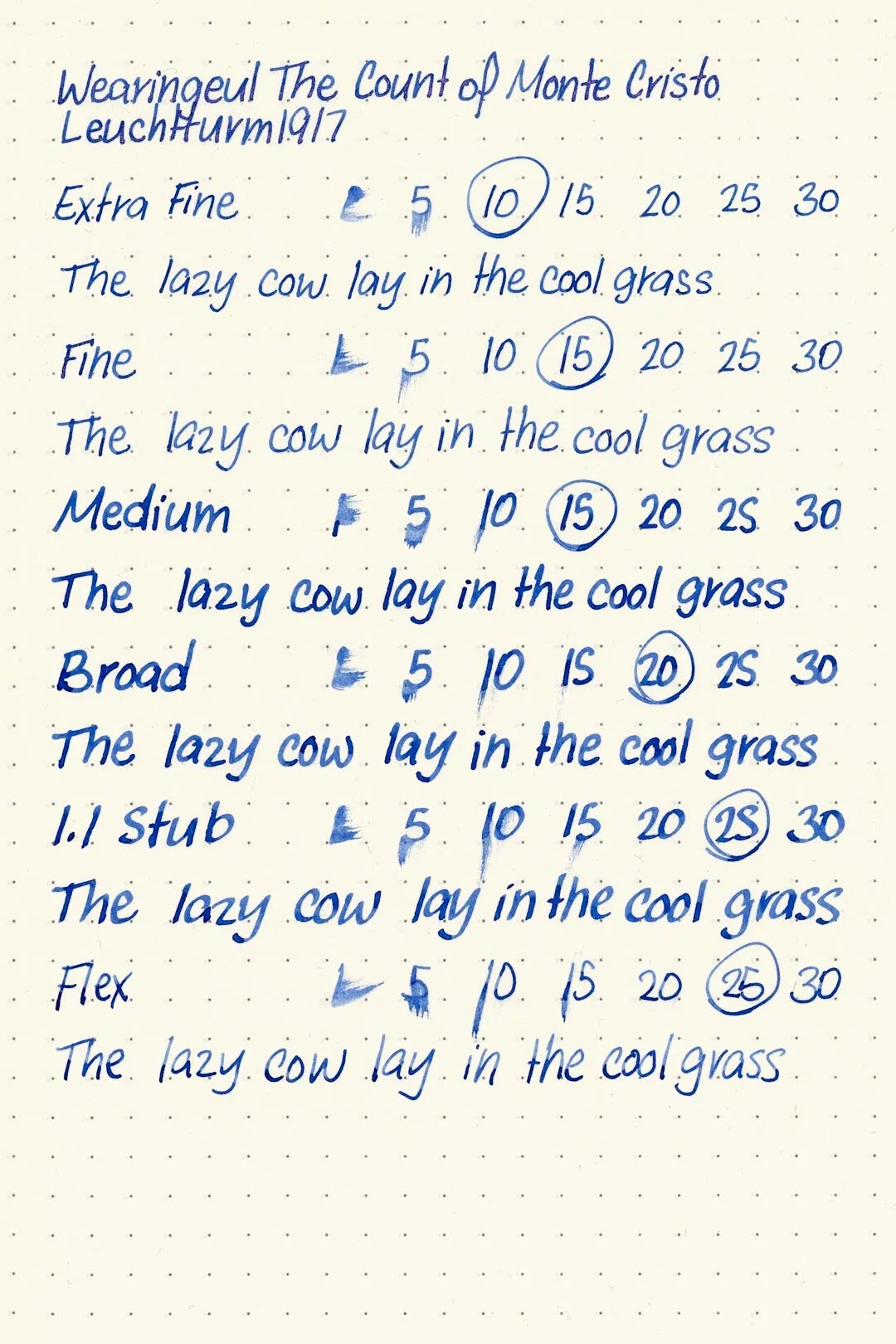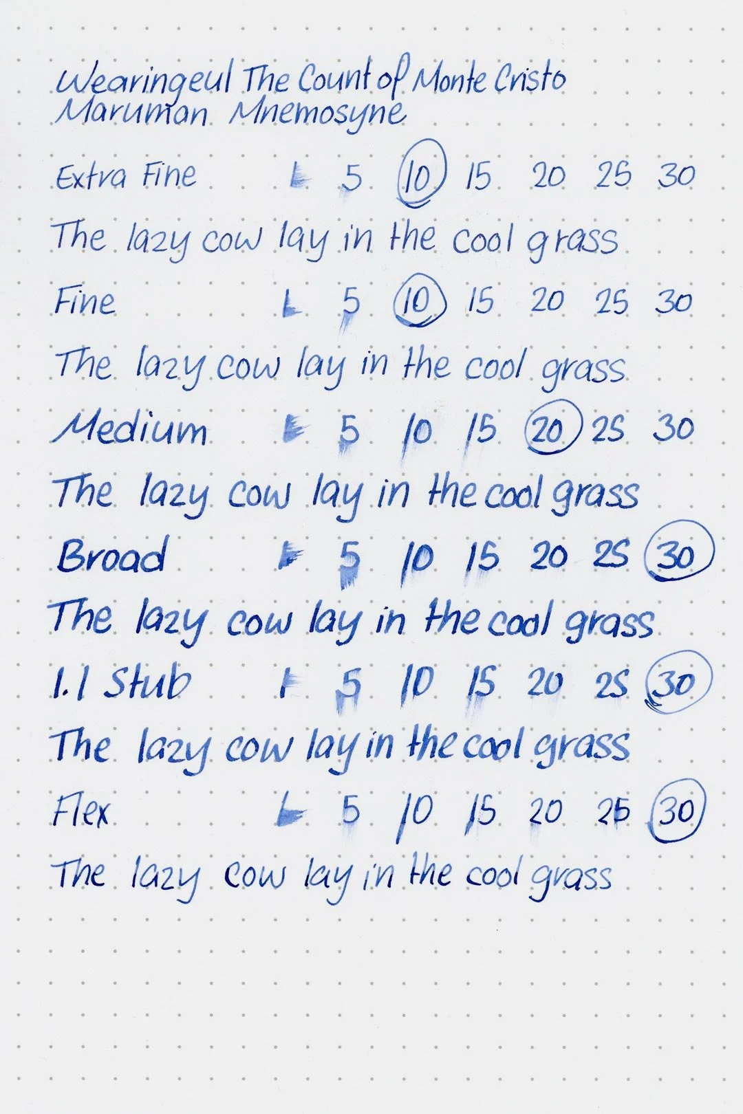 The Count of Monte Cristo has a dry-medium flow, and that led to a few frustrating clogs with the extra fine and fine nibs. The other nibs thankfully didn’t have any issues with clogs, hard stops, or skipping; however, there’s still a general feeling of low lubrication. It’s not awful, but if you like slick inks, this isn’t going to be it. I mentioned earlier that there’s not all that much shimmer, and I think the lack of a significant flow has a lot to do with it. Agitating the pen doesn’t seem to help much, and maybe a higher-flowing feed may help, but your mileage may vary.