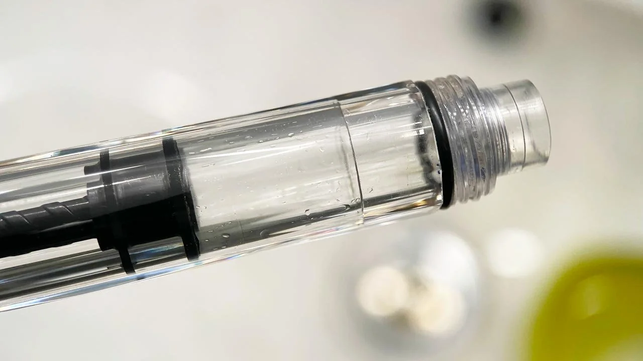 The cleaning process only required a single soak and flush for the color to wash out of the test pen and nib units. While there weren’t any large rings of shimmer or a haze left over along the barrel, there was still a minimal amount of shimmer along the piston crown that couldn’t be flushed out, requiring disassembly of the pen for extra cleaning.