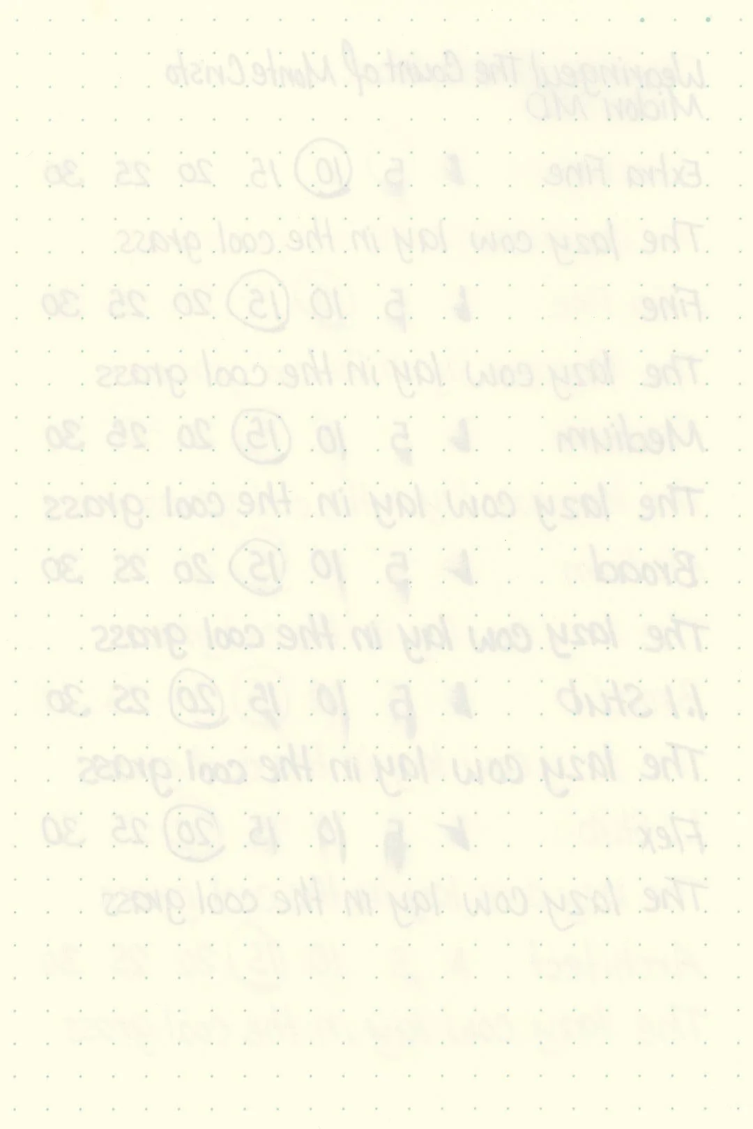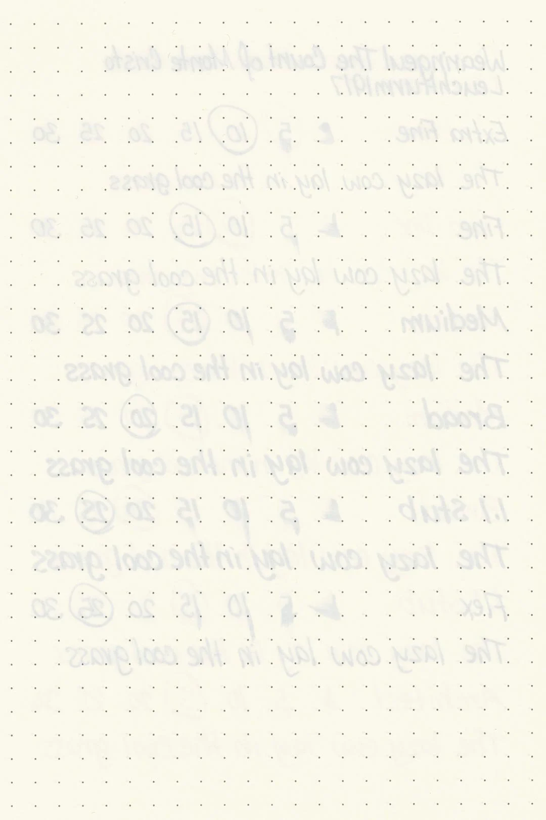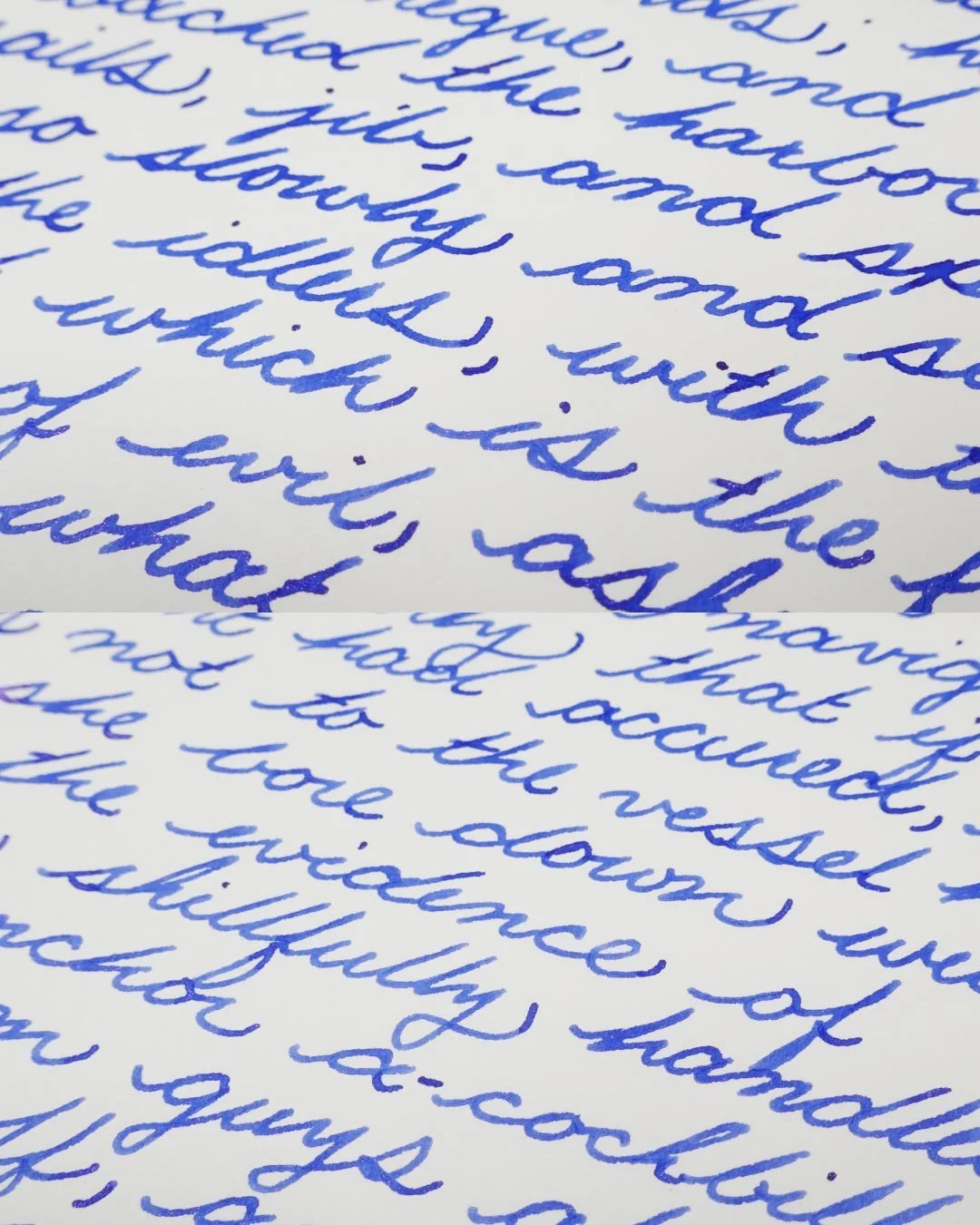 This ink is well-behaved, and there was only a single spot of bleed-through on the Kokuyo paper with the semi-flex nib. This ink should work great with most fountain pen-friendly papers.