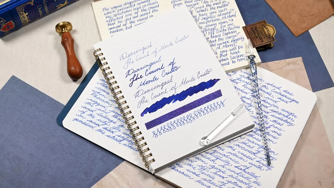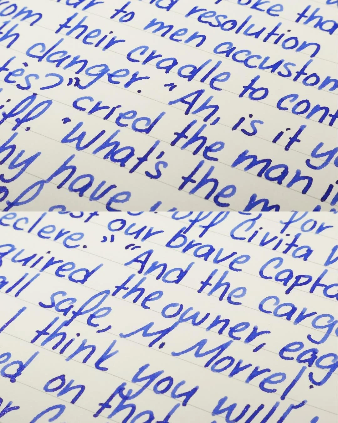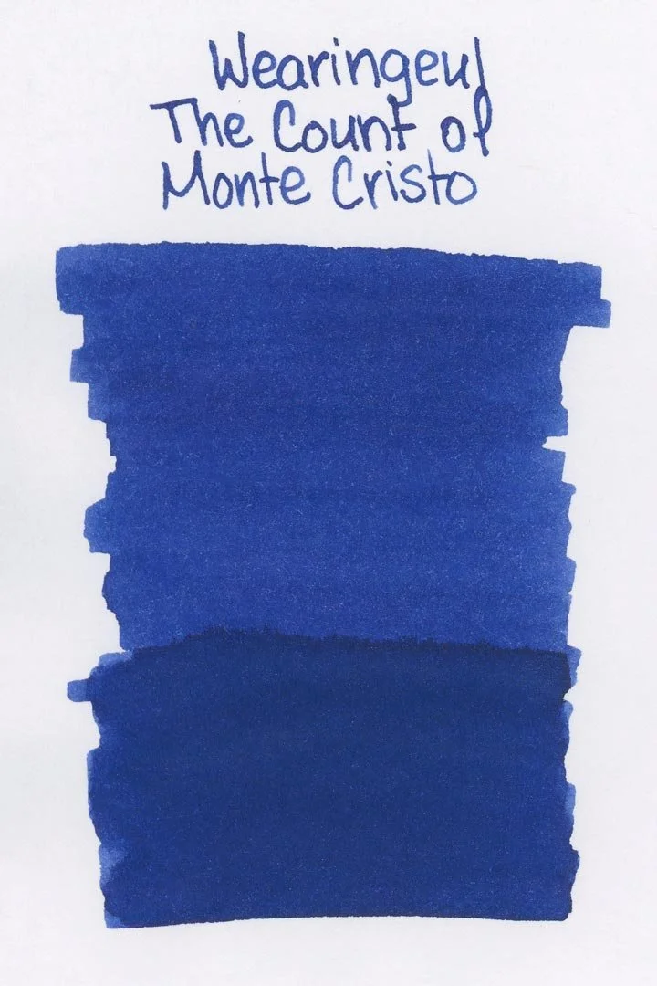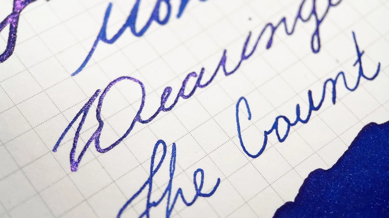 Wearingeul The Count of Monte Cristo is a shimmering ink. The base color is a medium cobalt blue that shades with a soft gradient in cursive and a soft cut when writing in print. The shimmer is a bright violet that changes the look of the ink entirely, and unfortunately, it’s rather difficult to capture, because there’s unfortunately just not that much of it when using this ink in a pen. You’ll mostly notice the shimmer at the ends of letters. Anywhere else, the shimmer looks blue since there isn’t a high contrast between the base color and the shimmer. Because of this, there is a massive difference in how this color looks when used with a dip pen.