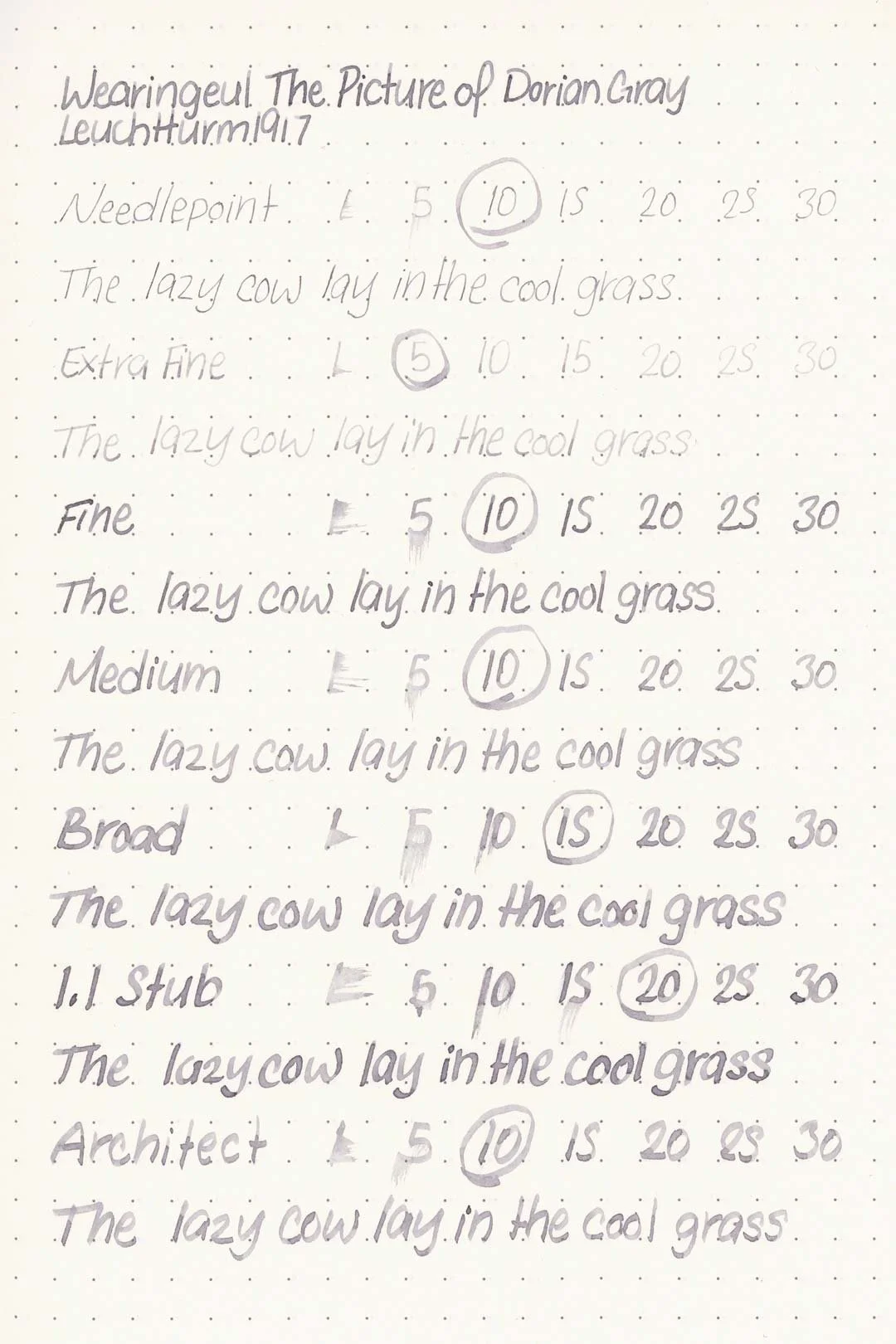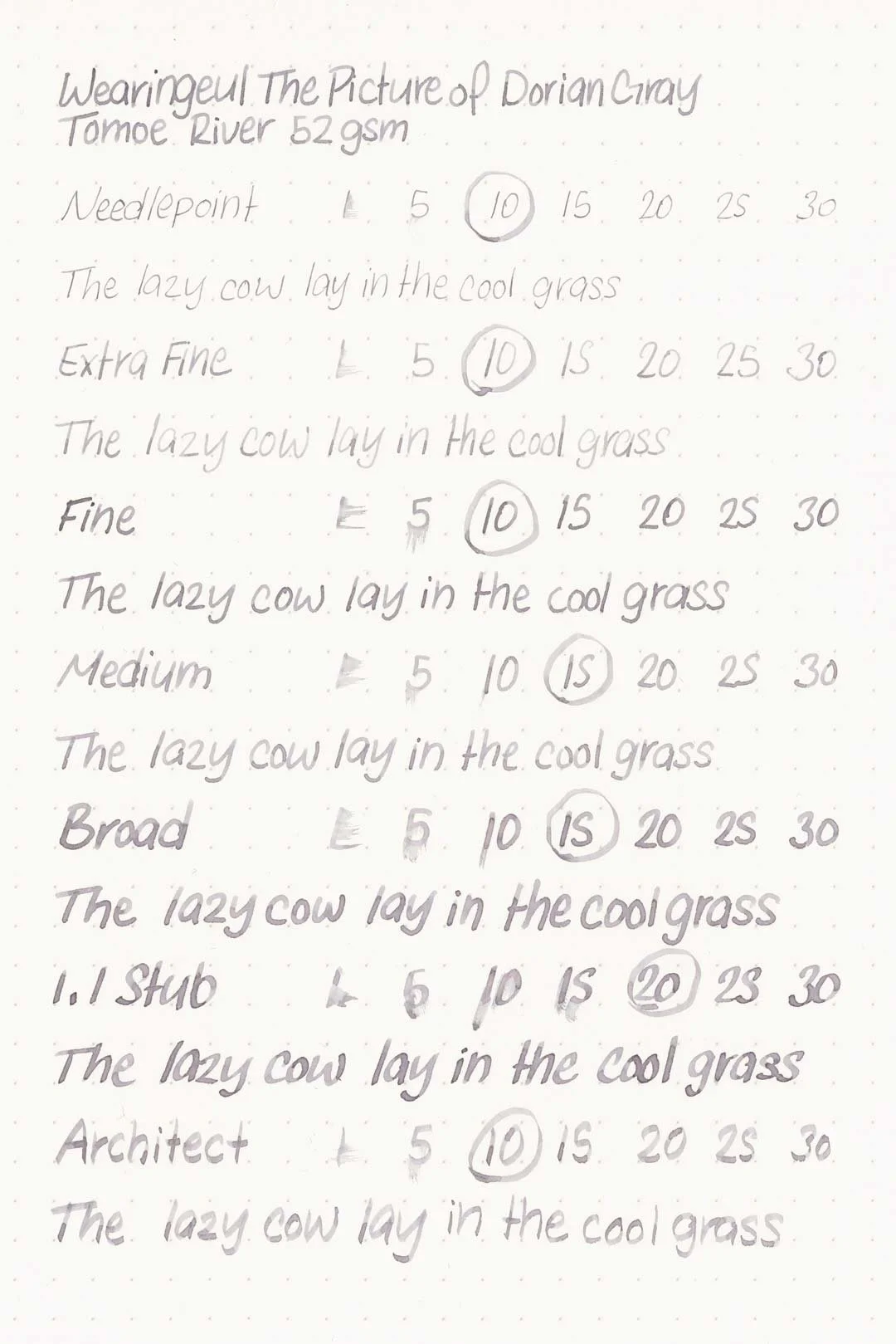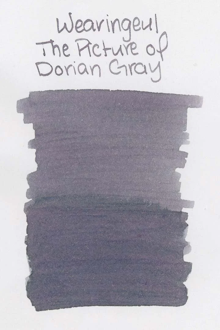 Wearingeul’s The Picture of Dorian Gray is a light grey ink with heavy purple and blue undertones. The ink shades with a soft cut in both print and cursive writing, where the ink pools. The inside of shaded areas have a soft gradient from the center out to the edges of the letters that give the letters a sort of blushy look that's more noticeable on white paper and with larger nib sizes. White papers also seem to help bring out the more purple tones of this ink.