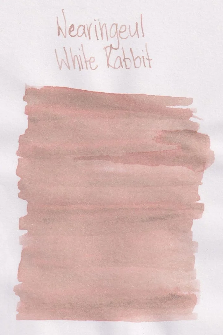 Wearingeul White Rabbit is a pale pink that offers high amounts of shading that generally varies between light and dark tones where the ink pools. Depending on the pen and paper, however, you may start to notice a lot of greys in the color, and if the pen is wet enough and pools in just the right way you may also bring out a deep hot pink around the edges of the letters.